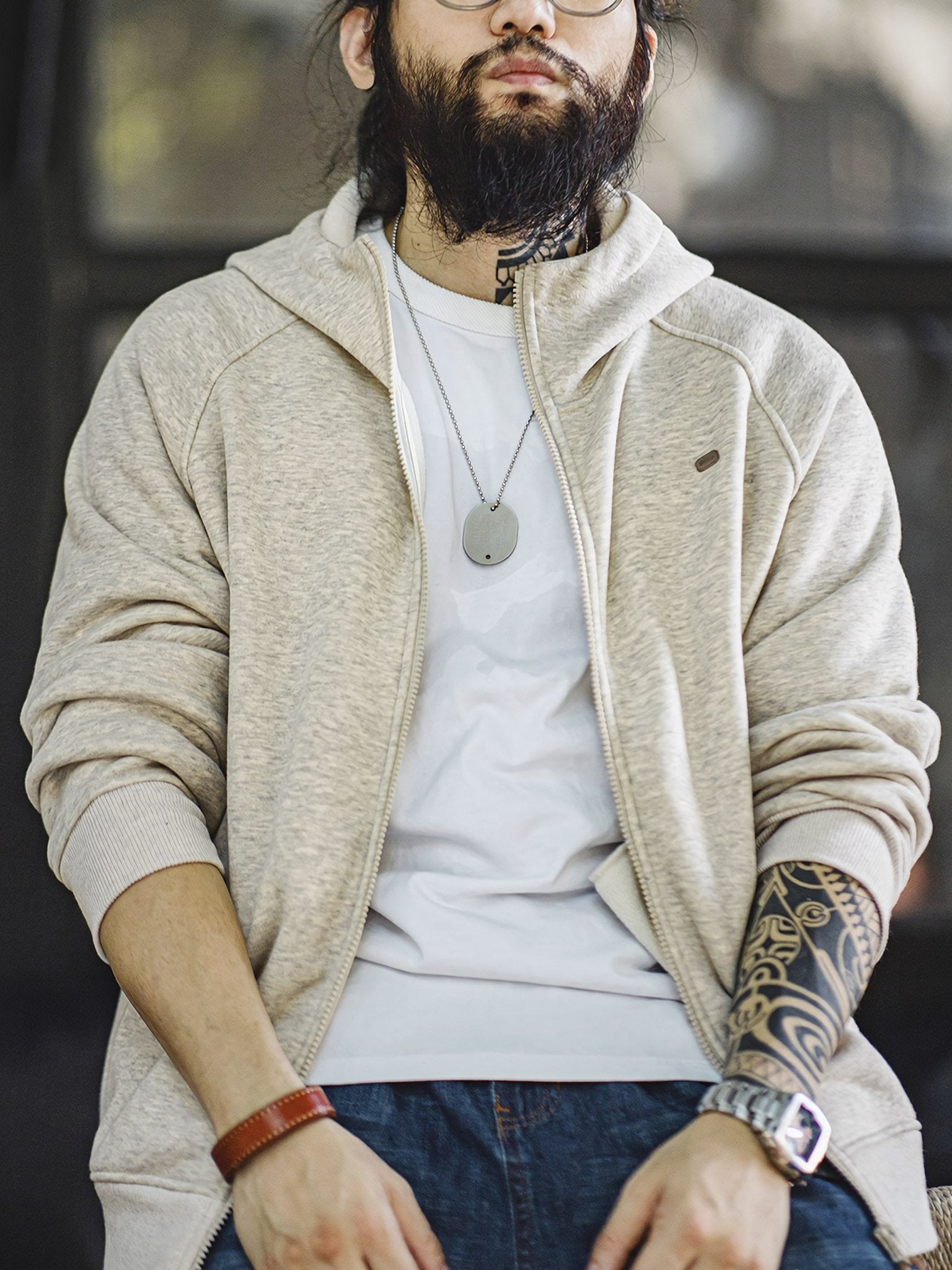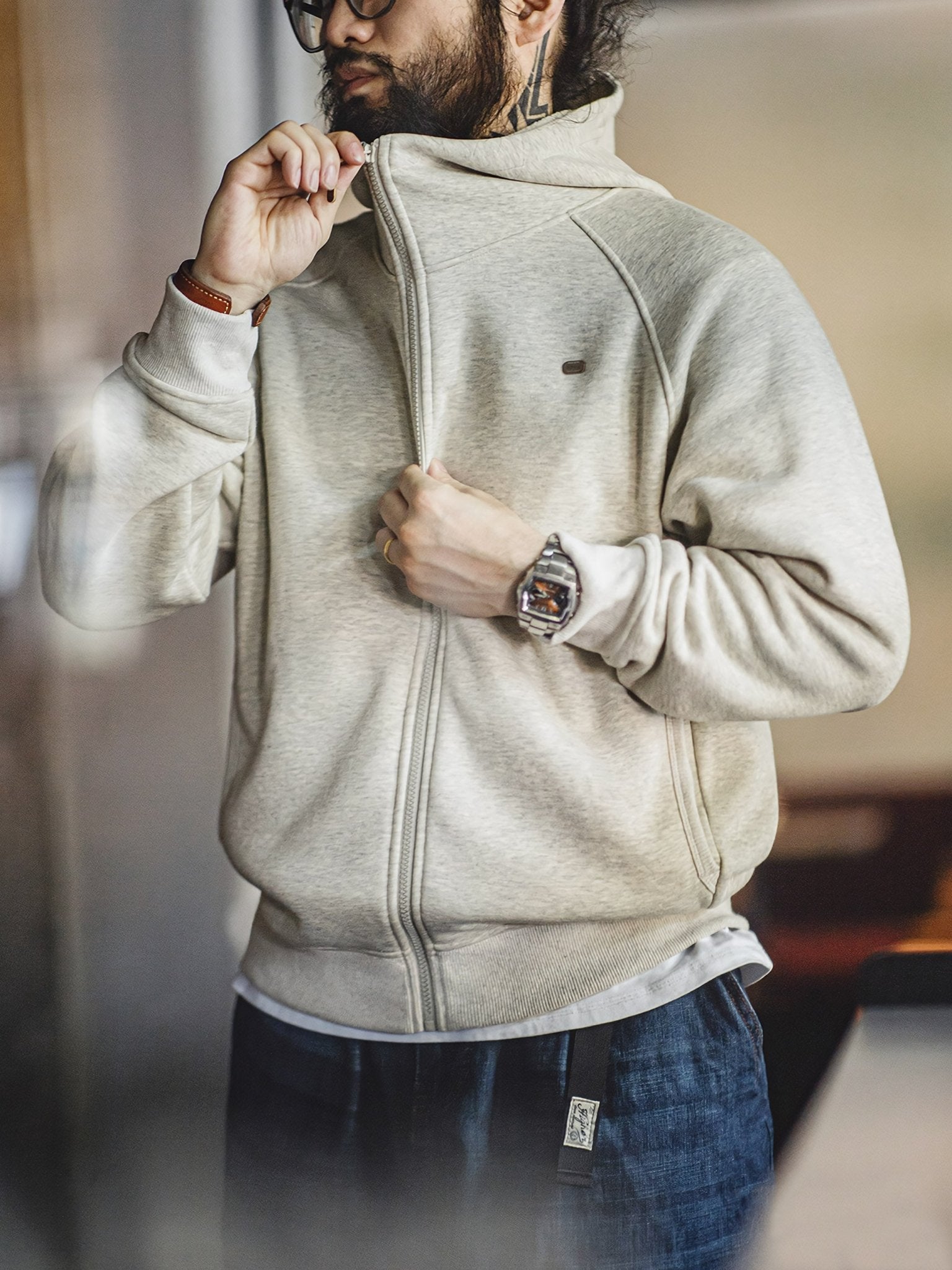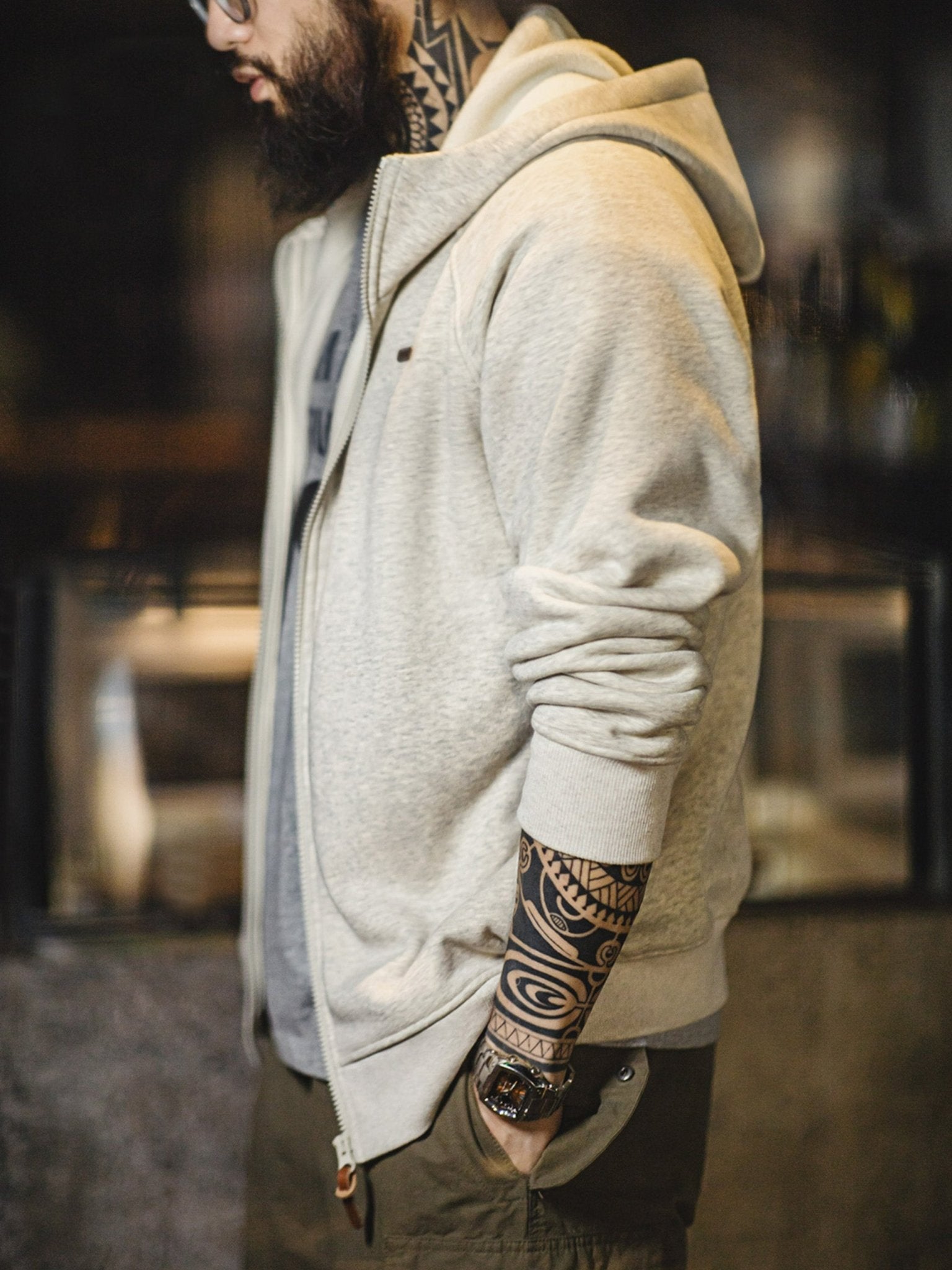 このグレーのパーカースウェットは、通常のものとは異なり、ジップを引き上げてスタンドカラーデザインにし、秋冬の風除けでスタイリッシュな印象を与えます。裾のリブ仕上げは、カジュアルで快適です。