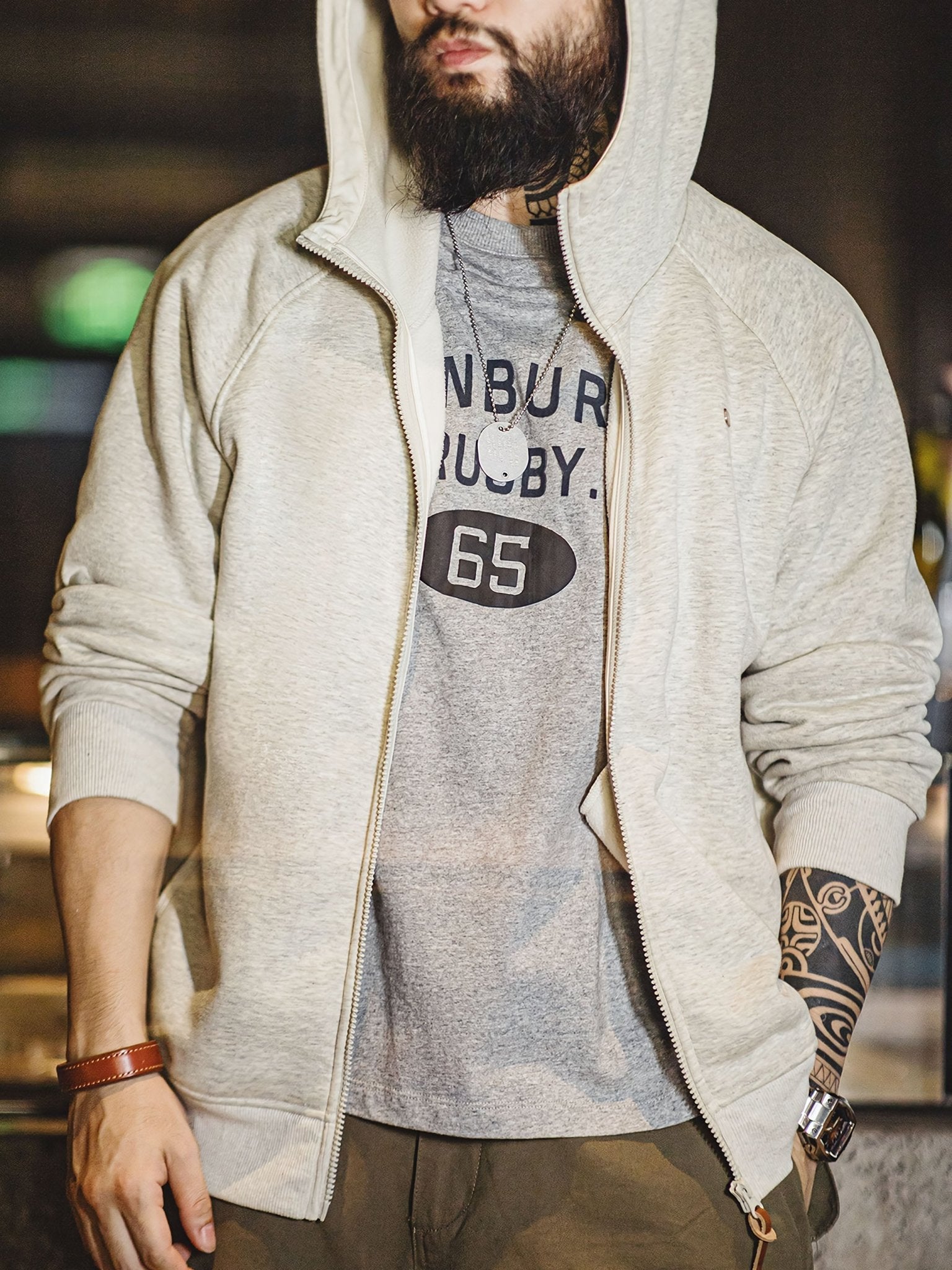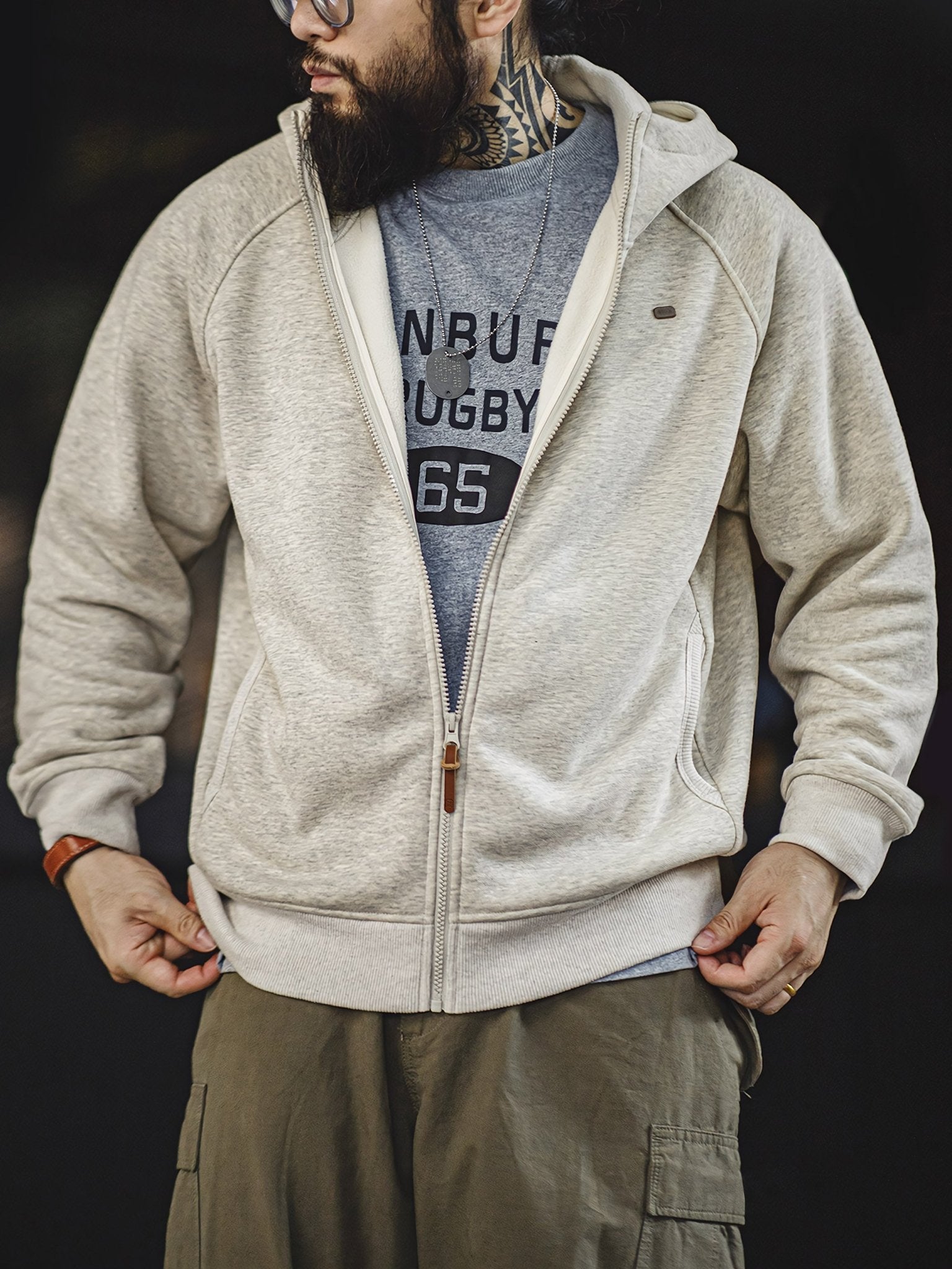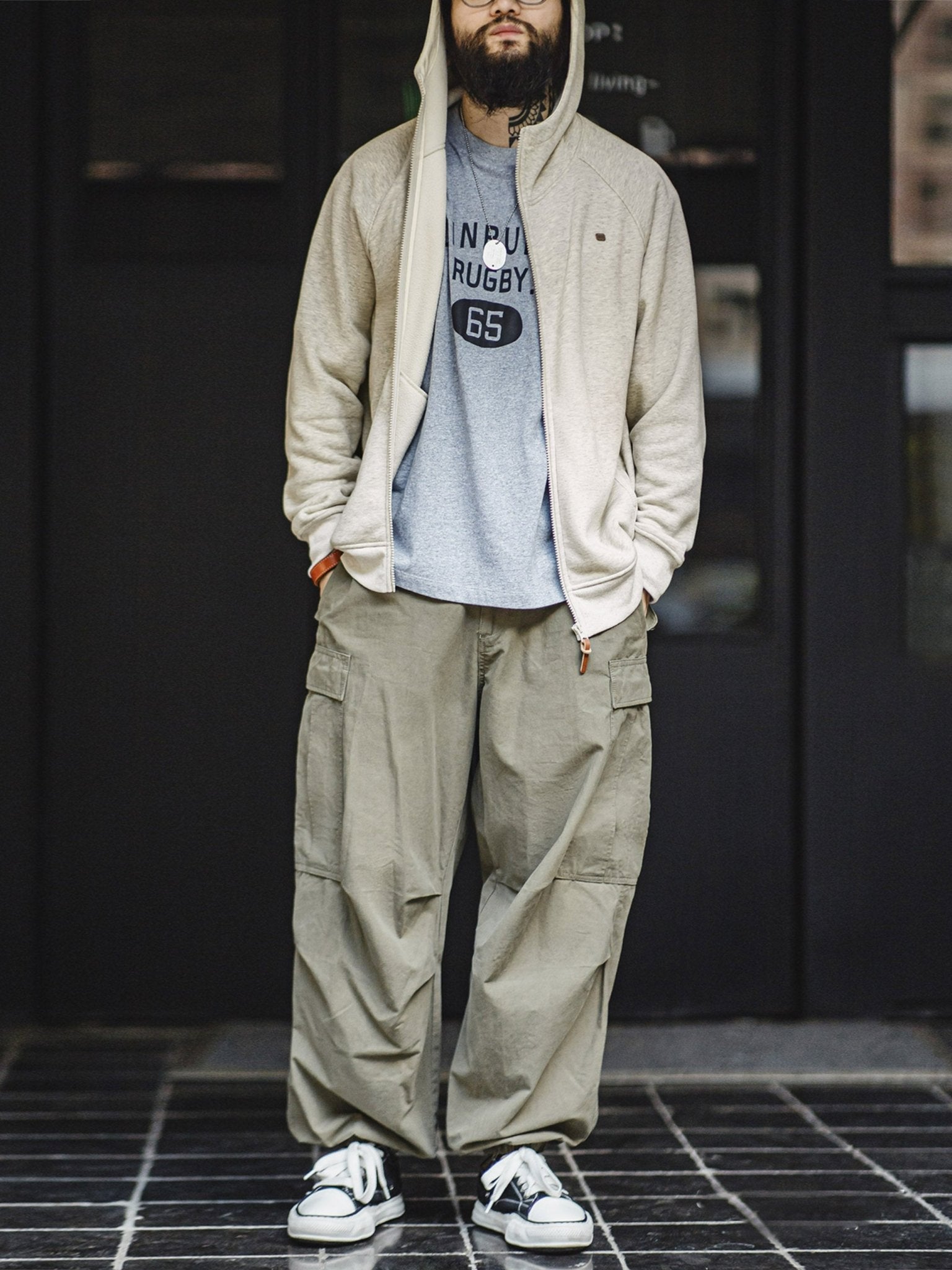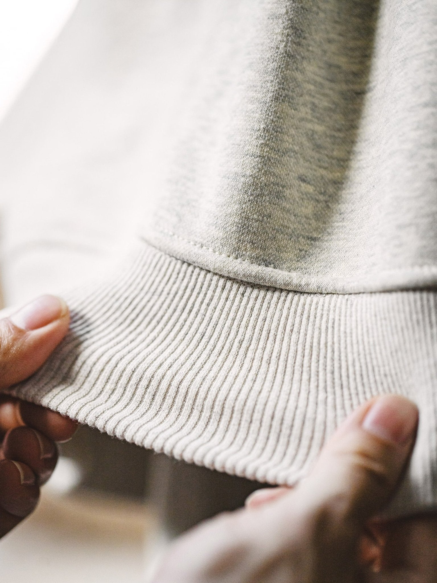 このグレーのパーカースウェットは、通常のものとは異なり、ジップを引き上げてスタンドカラーデザインにし、秋冬の風除けでスタイリッシュな印象を与えます。裾のリブ仕上げは、カジュアルで快適です。