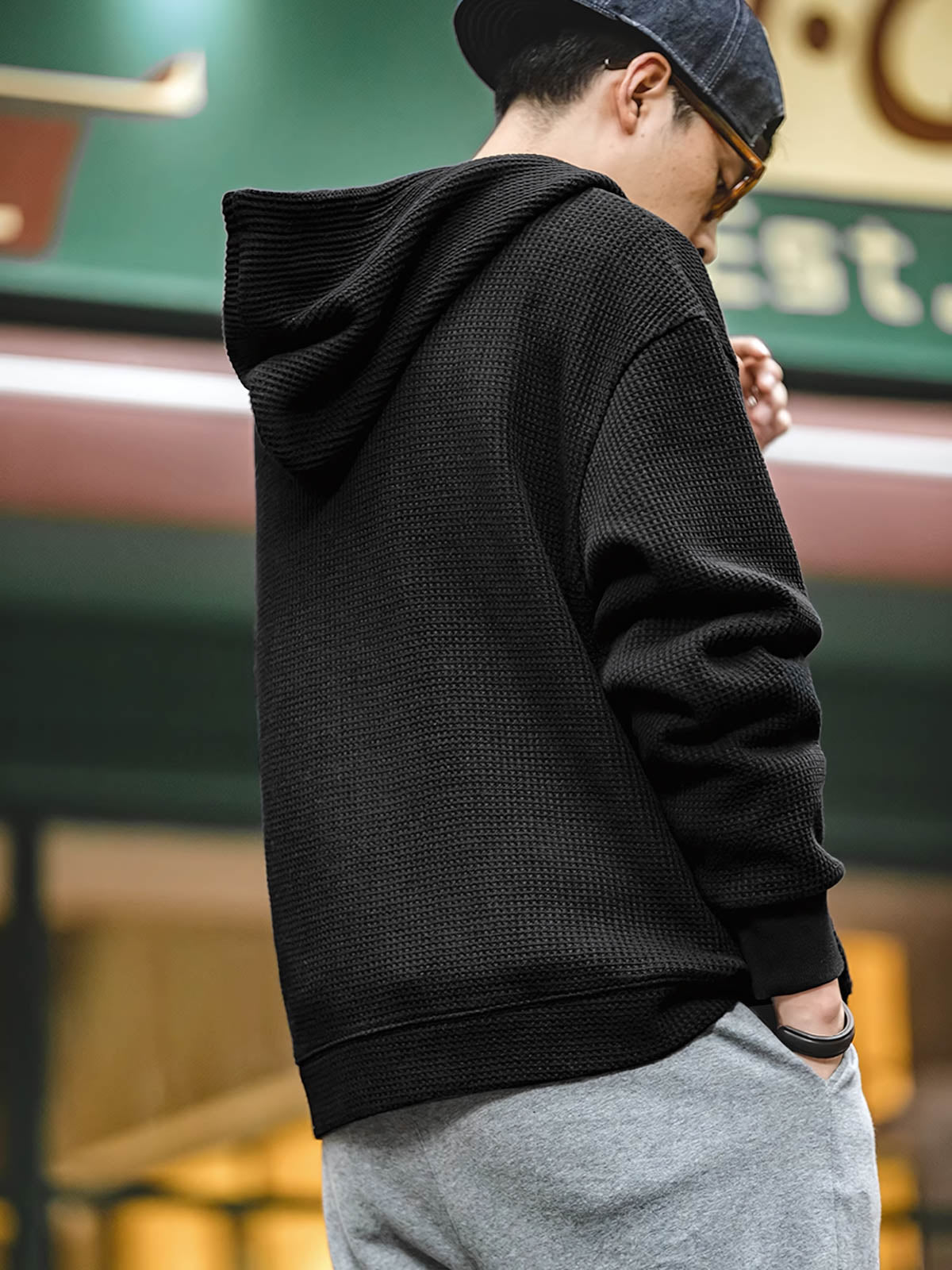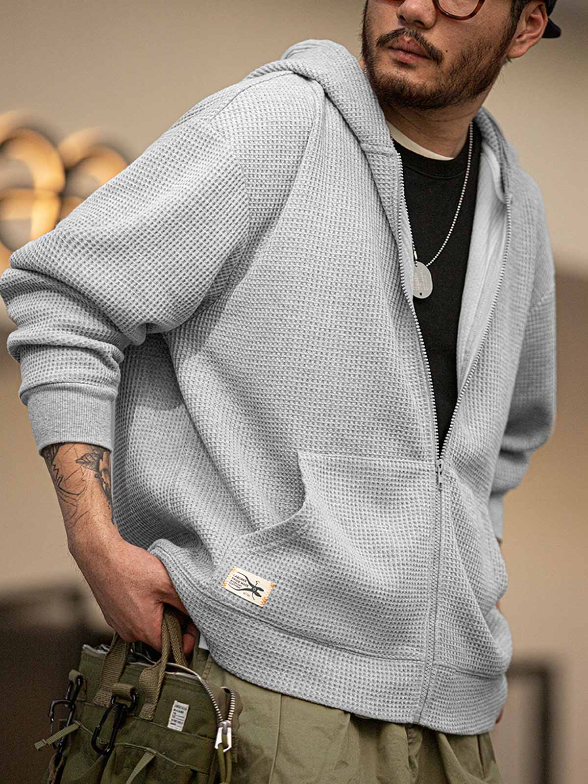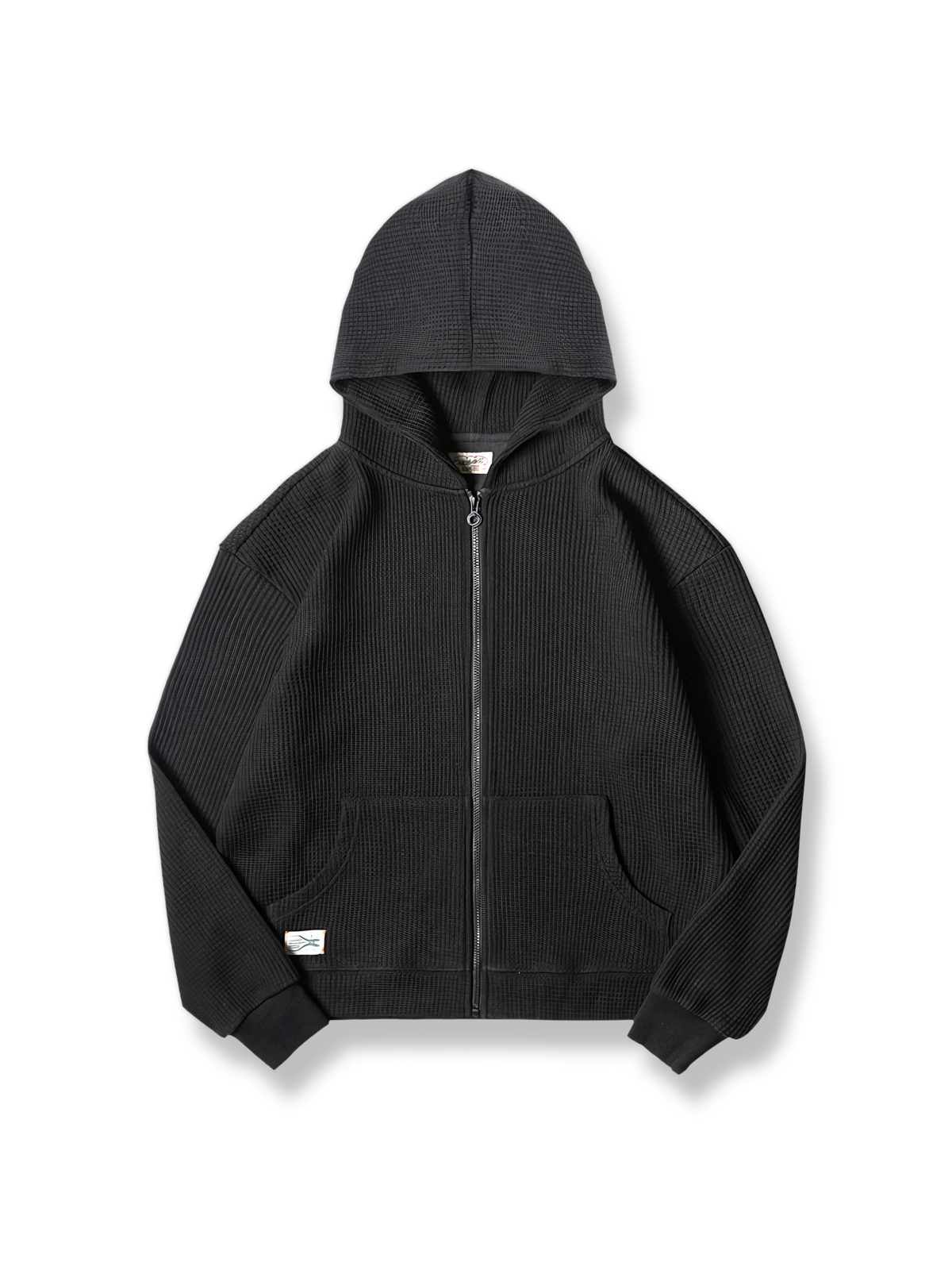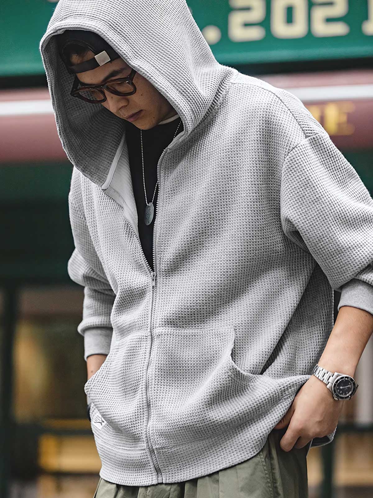 このフーディーは、ワッフルパターンの生地が特徴で、ユニークな視覚的および触感的な体験を提供します。ワッフルパターンは通常、タオルやテーブルマットに使用され、その優れた通気性と吸湿性から衣類に応用され、着用者に快適さと実用性を提供します。