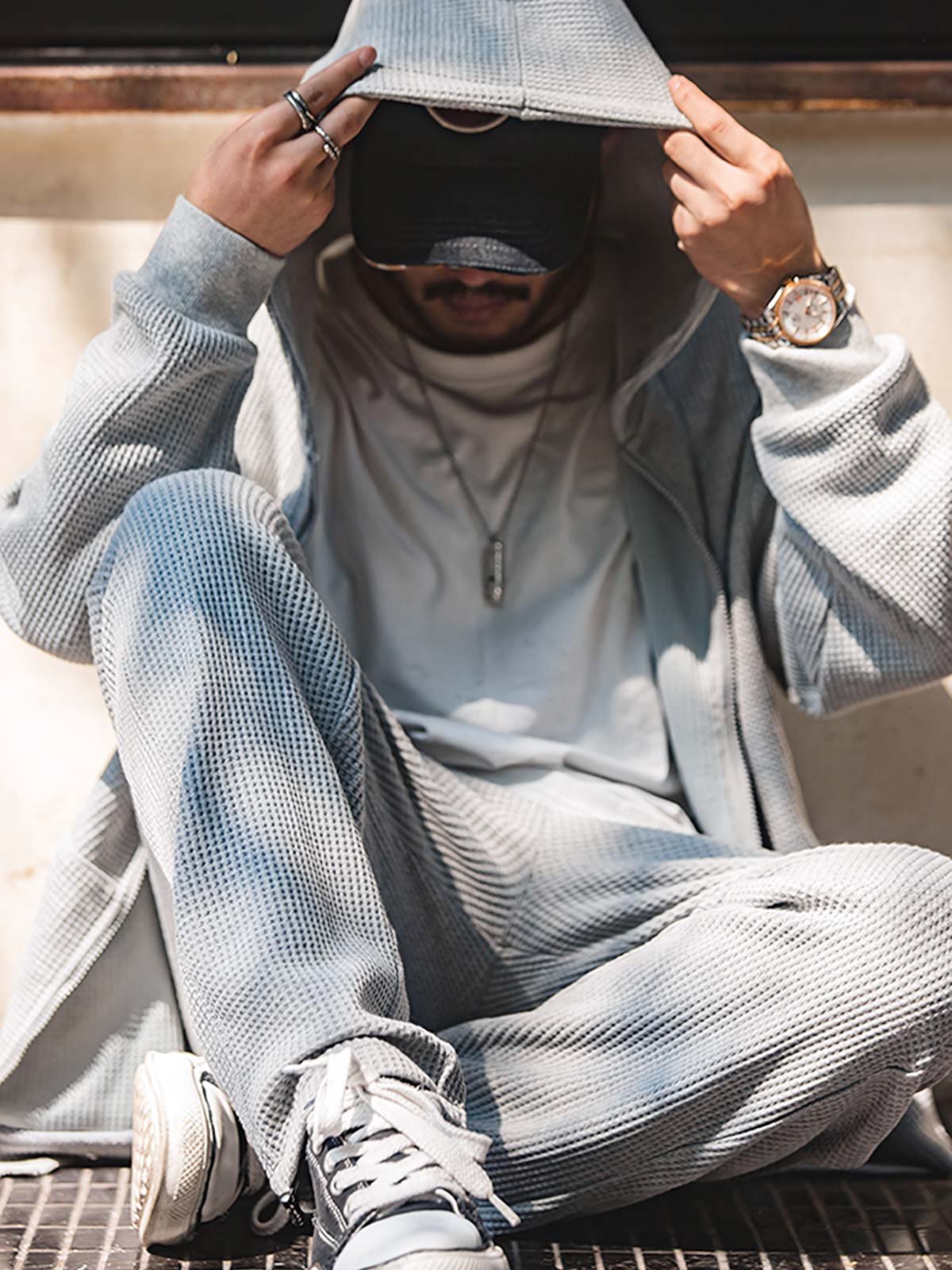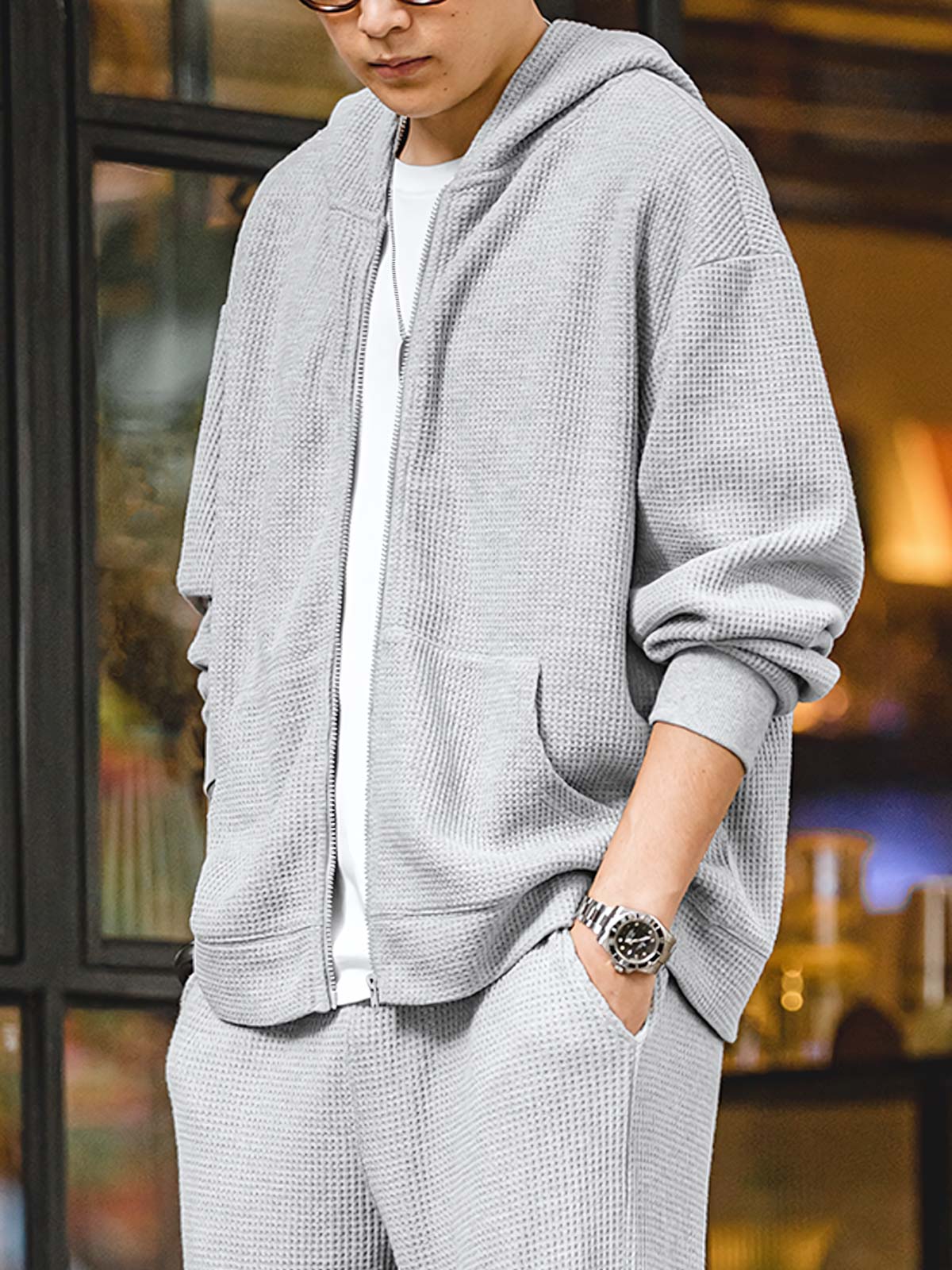 スウェットに使用されているワッフルパターン生地は、優れた通気性を持ちながらも、控えめなデザイン感を衣服に与えています。グレーの色調は、さまざまな色やスタイルの衣類と簡単にコーディネートできます。