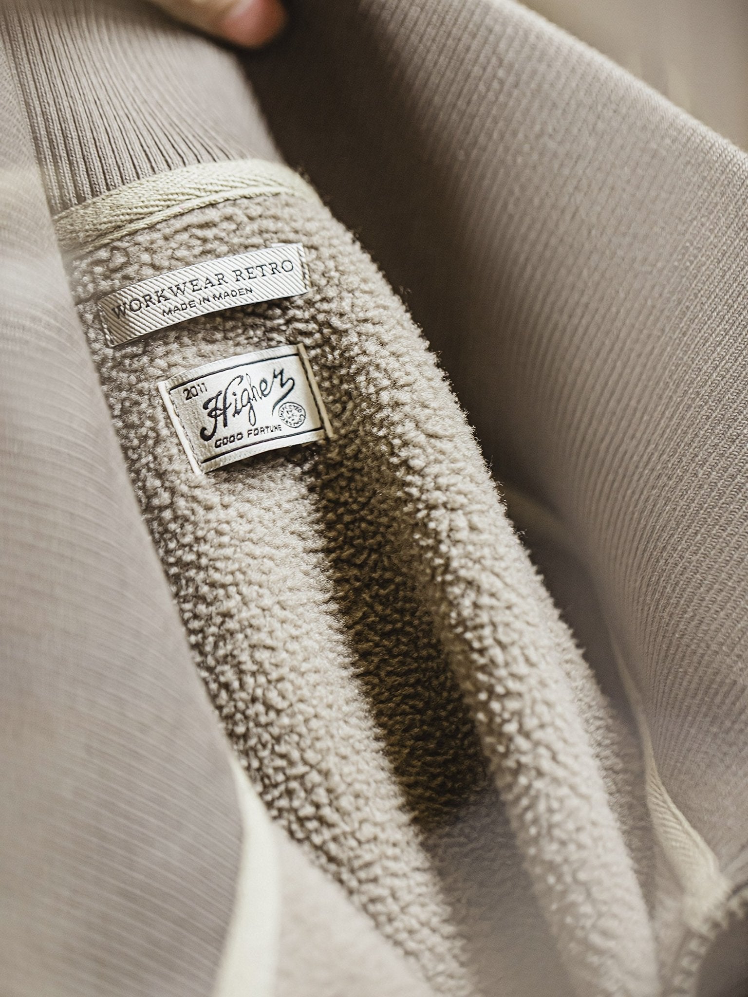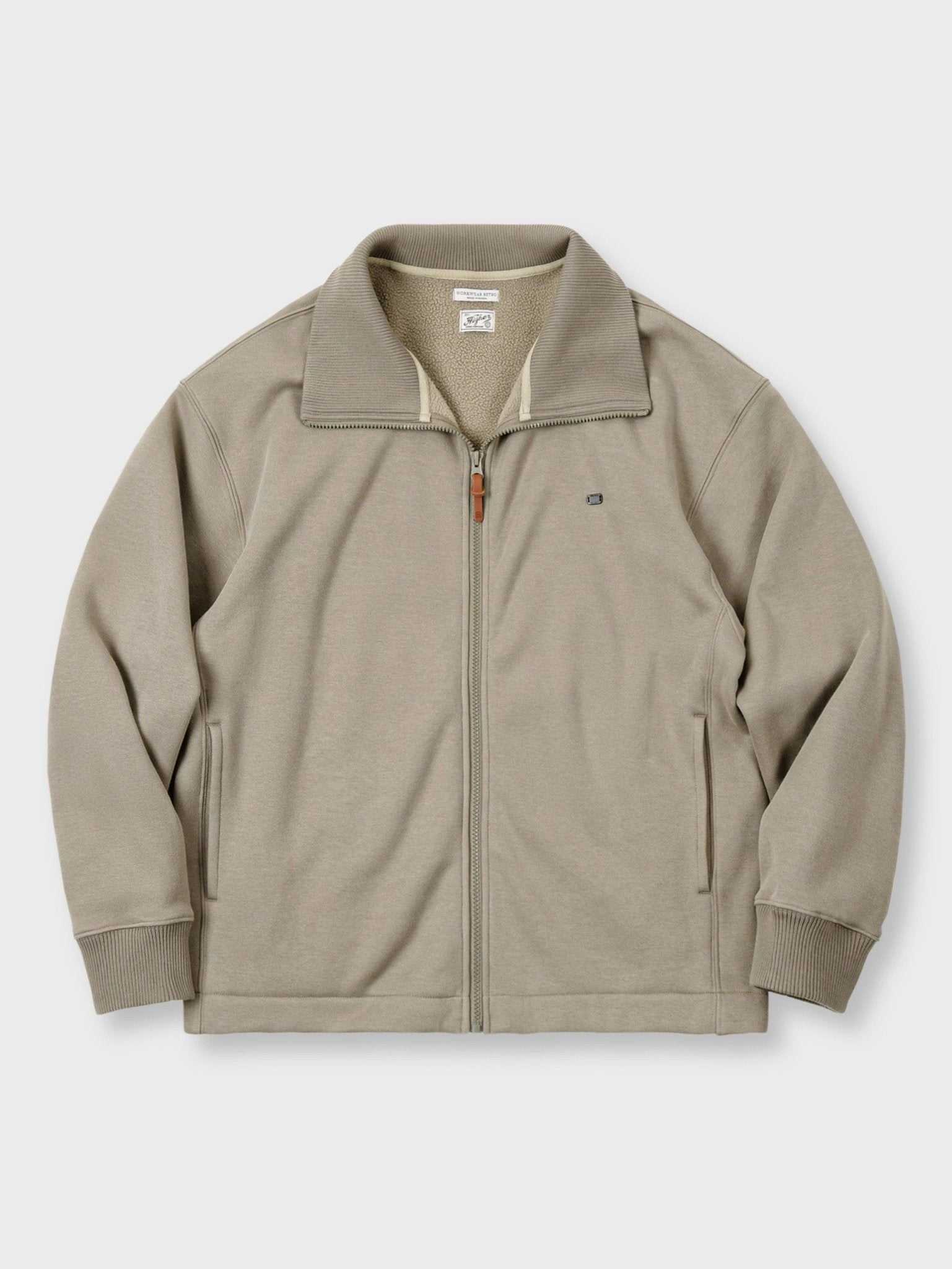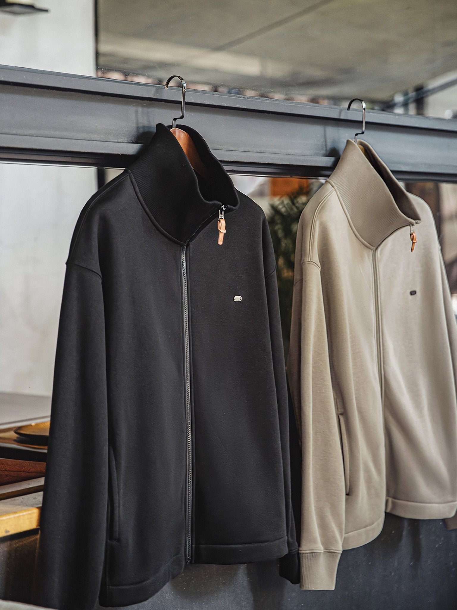 350g/mのダブルフェイス裏毛は、カスタムブレンド素材を使用し、内外で異なる編み技術が使用されています。外側は高密度の編みで、滑らかな手触りでボールができにくいです。内側はブークレで、保温性が向上し、軽快な着心地を提供します。