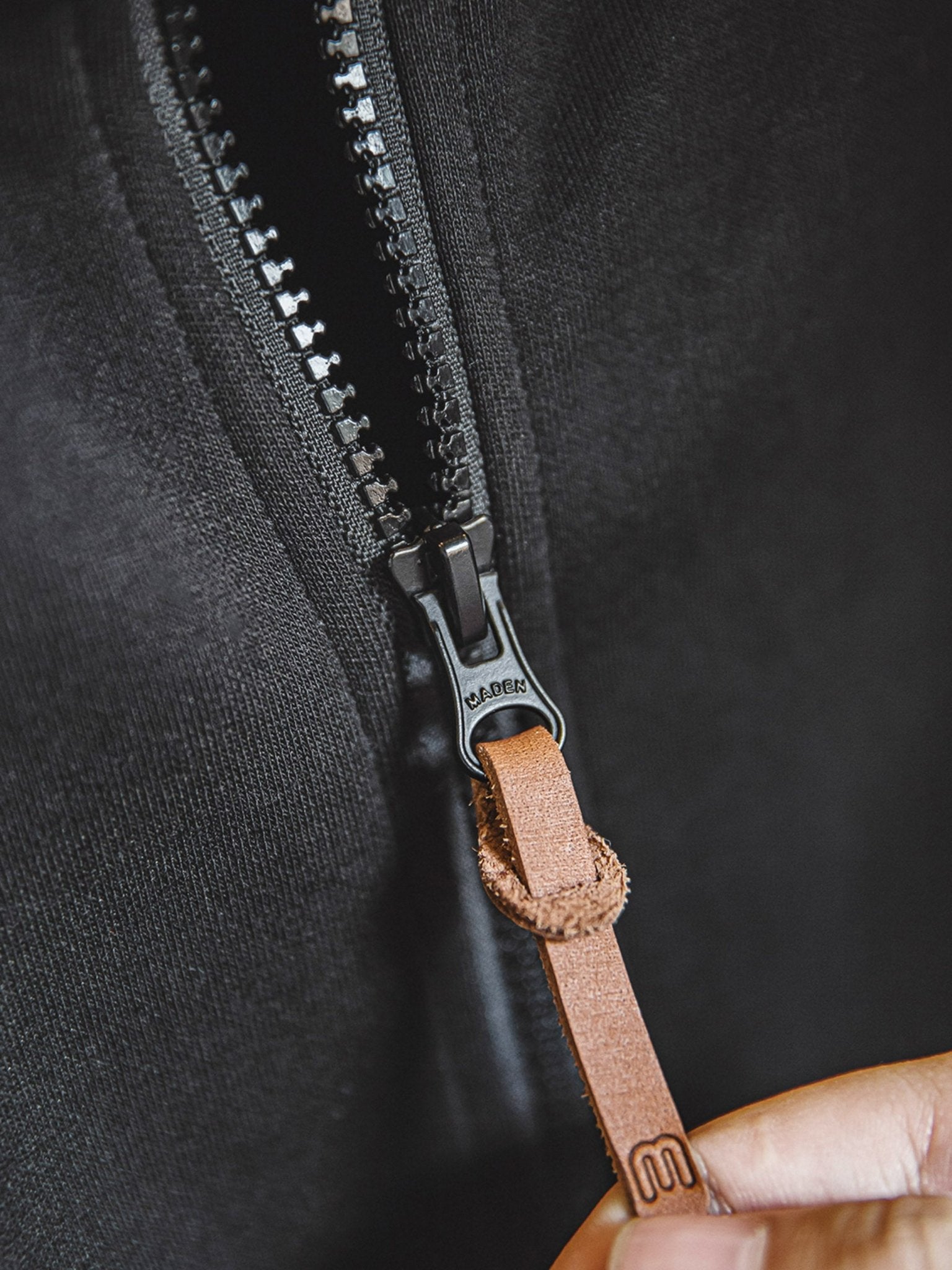生地はポリエステル67.5%と綿32.5%を採用されています。ベジタブルタンニングされた牛革のプルタブ付きジップを使用しています。