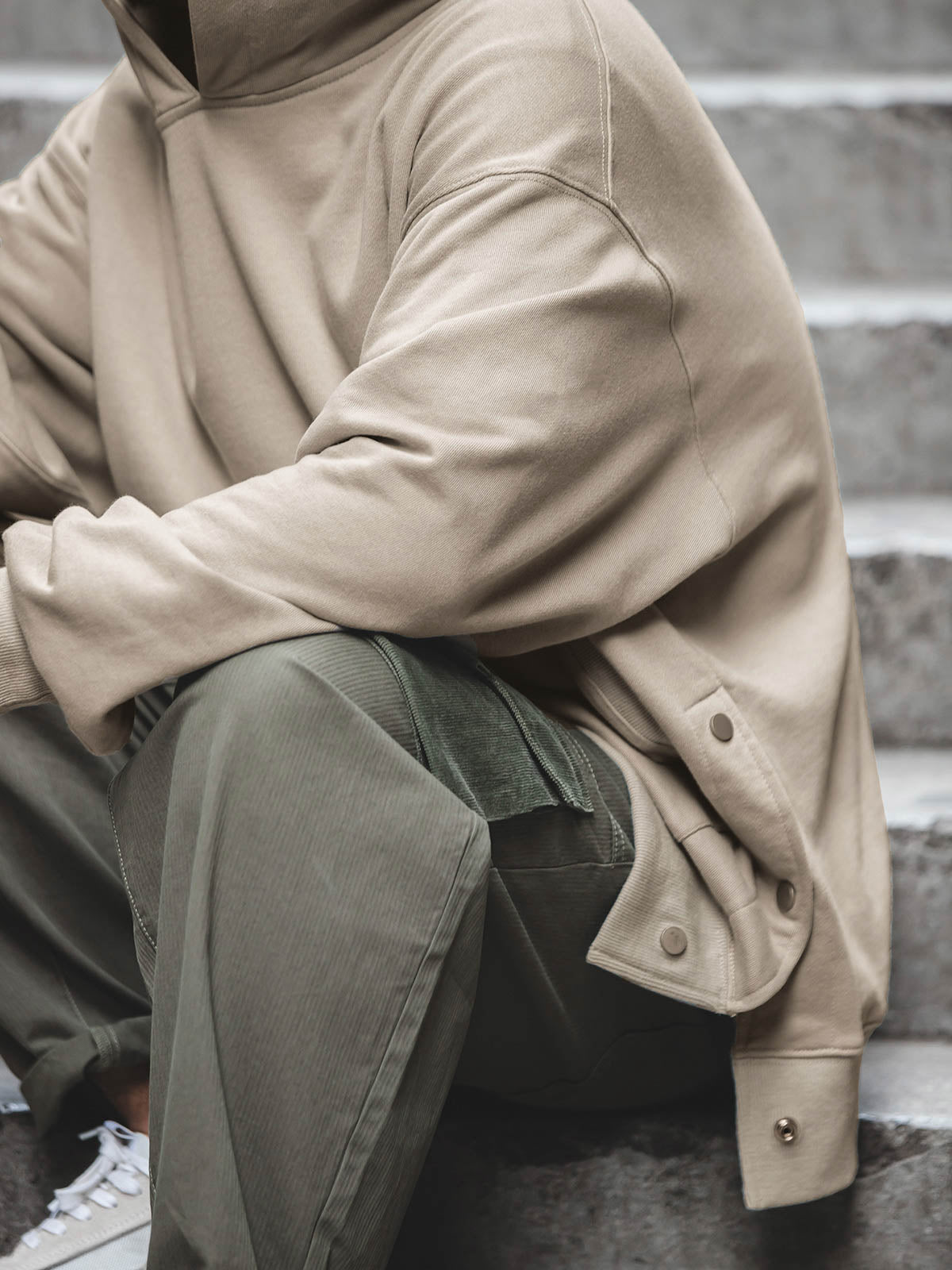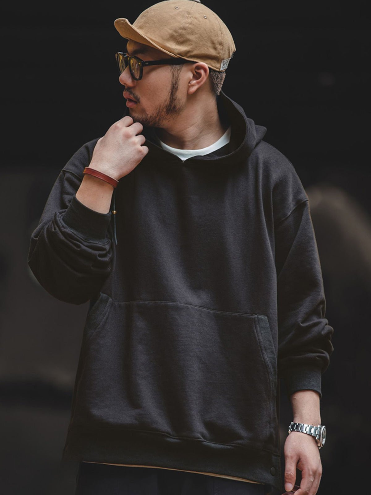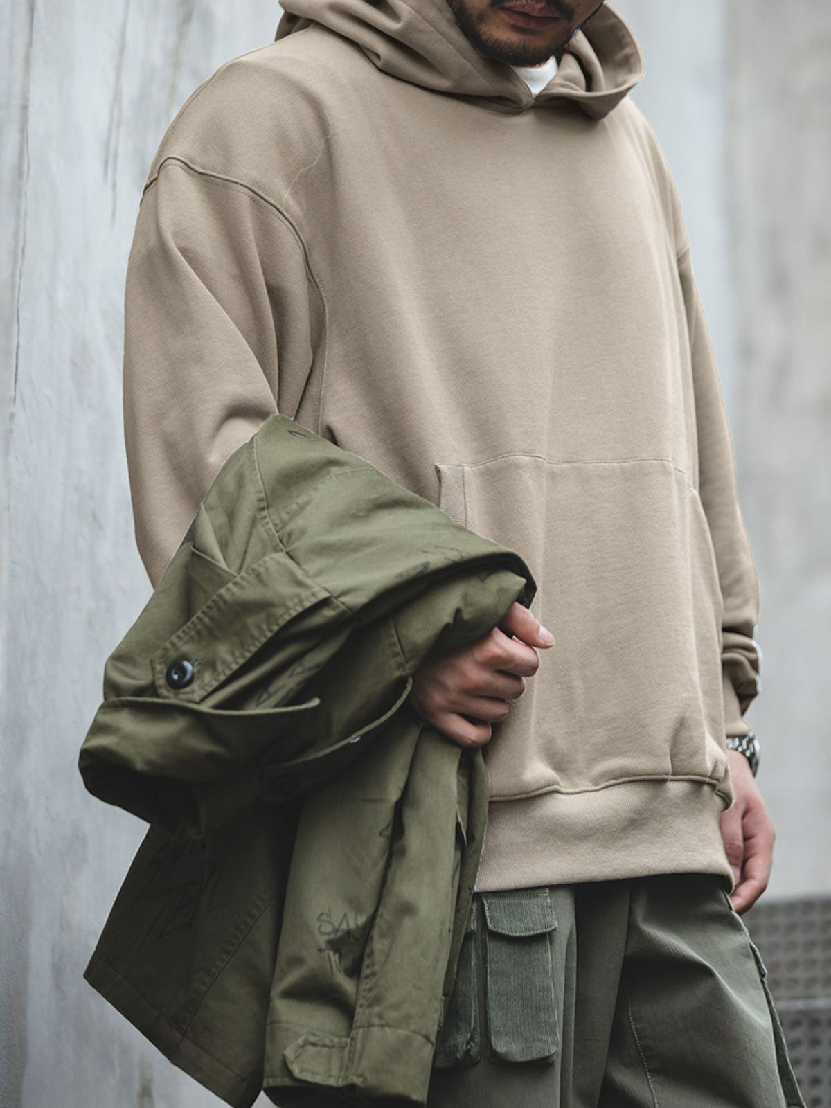 このスウェットは機能性と快適性を強調しています。フード付きスウェットシャツは20世紀のスポーツウェアから始まり、現在ではカジュアルファッションに欠かせないアイテムとなっています。