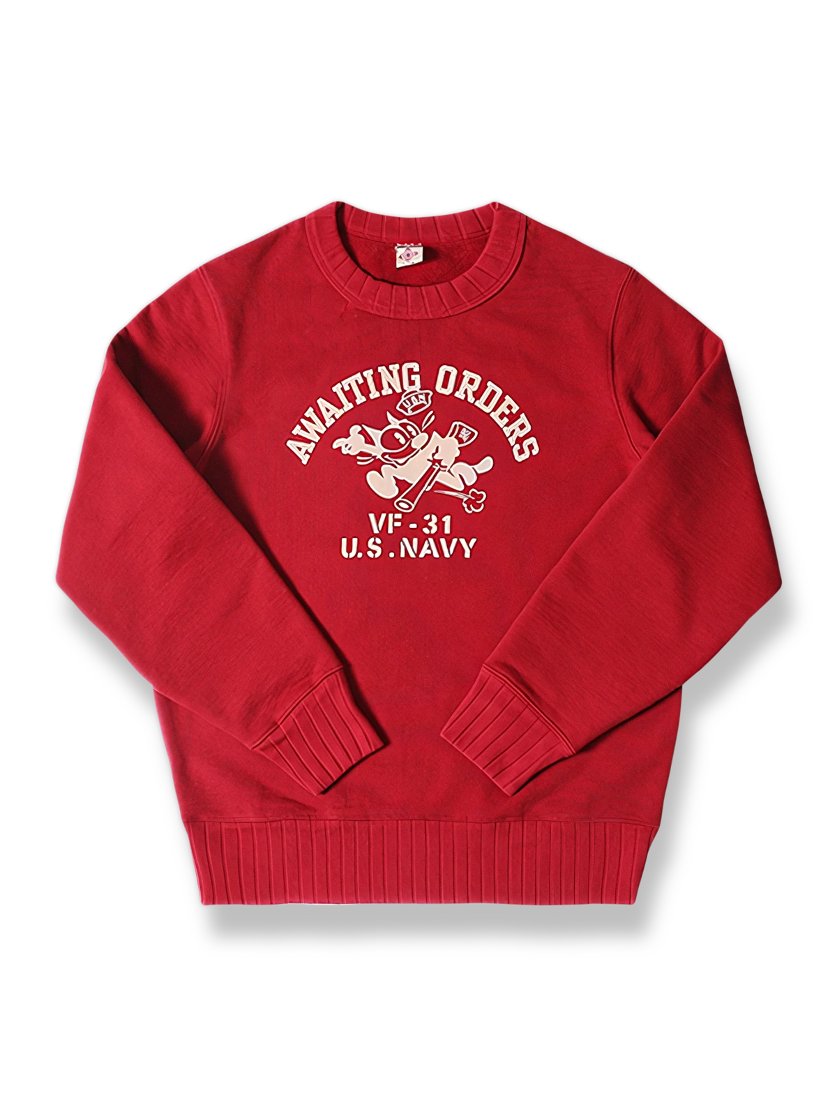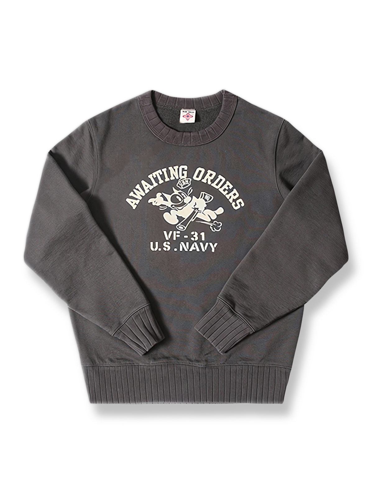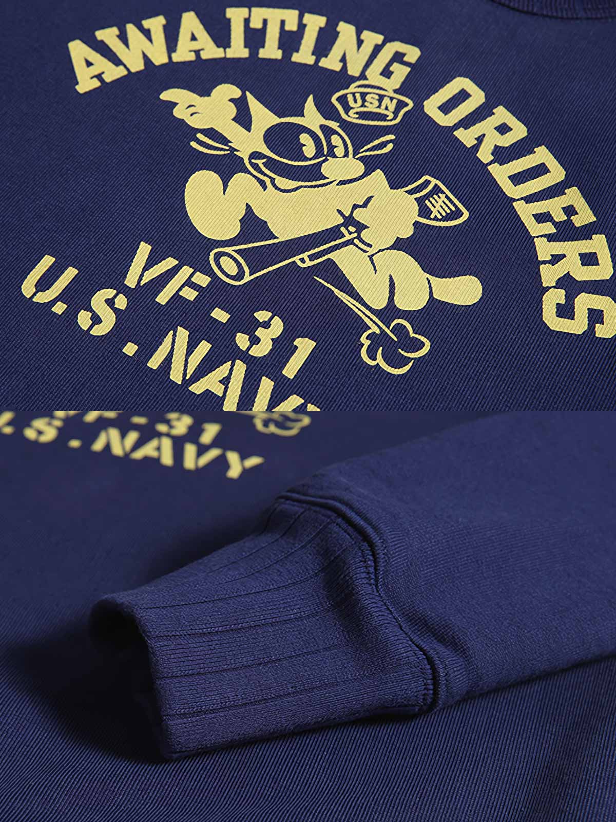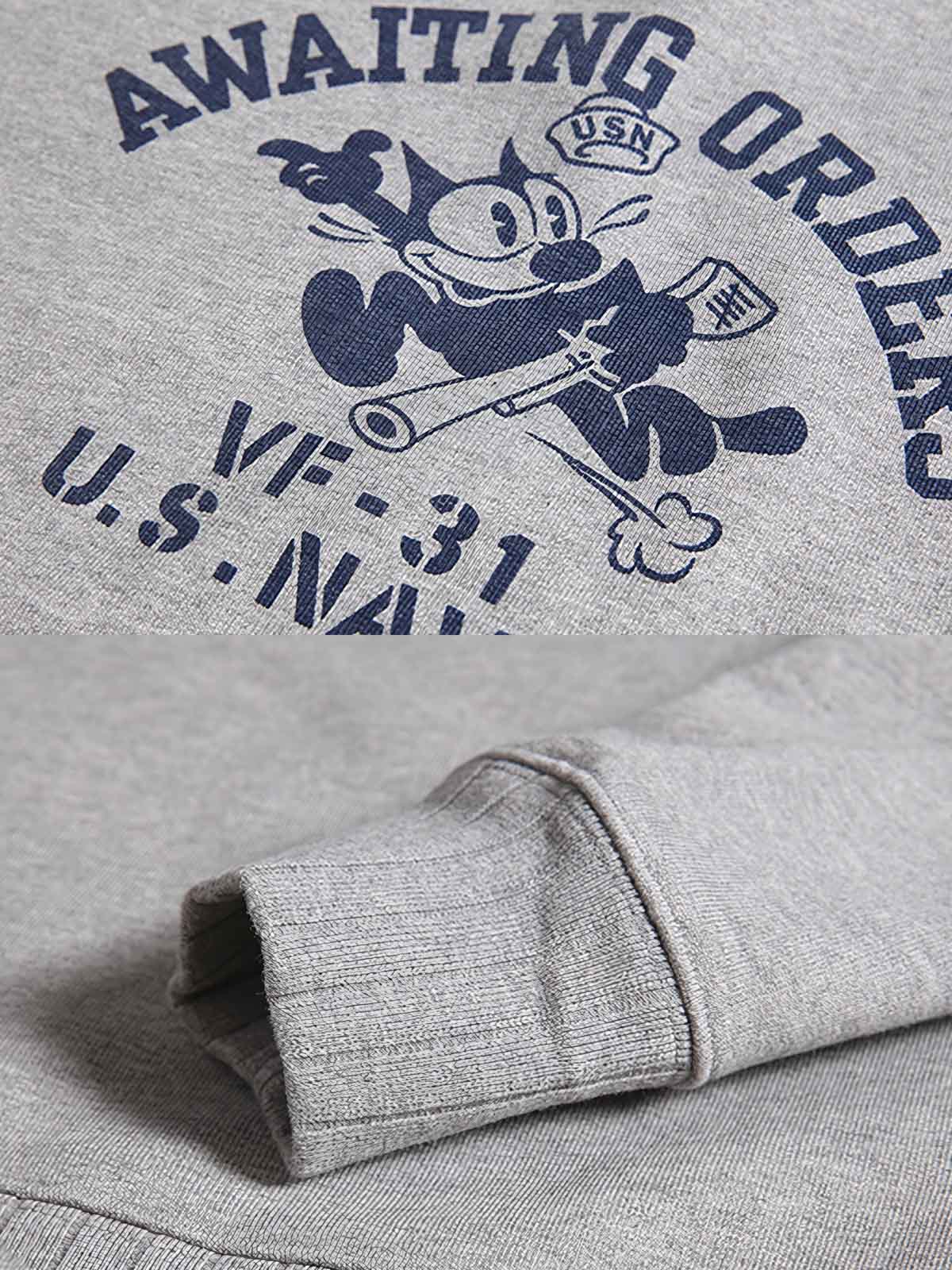 このスウェットは、アメリカ海軍VF-31「Tomcatters」中隊の象徴的なマスコット、フィリックス・ザ・キャット(Felix the Cat)のデザインを中心に展開しています。これは、強い軍事文化と歴史的背景を示しています。