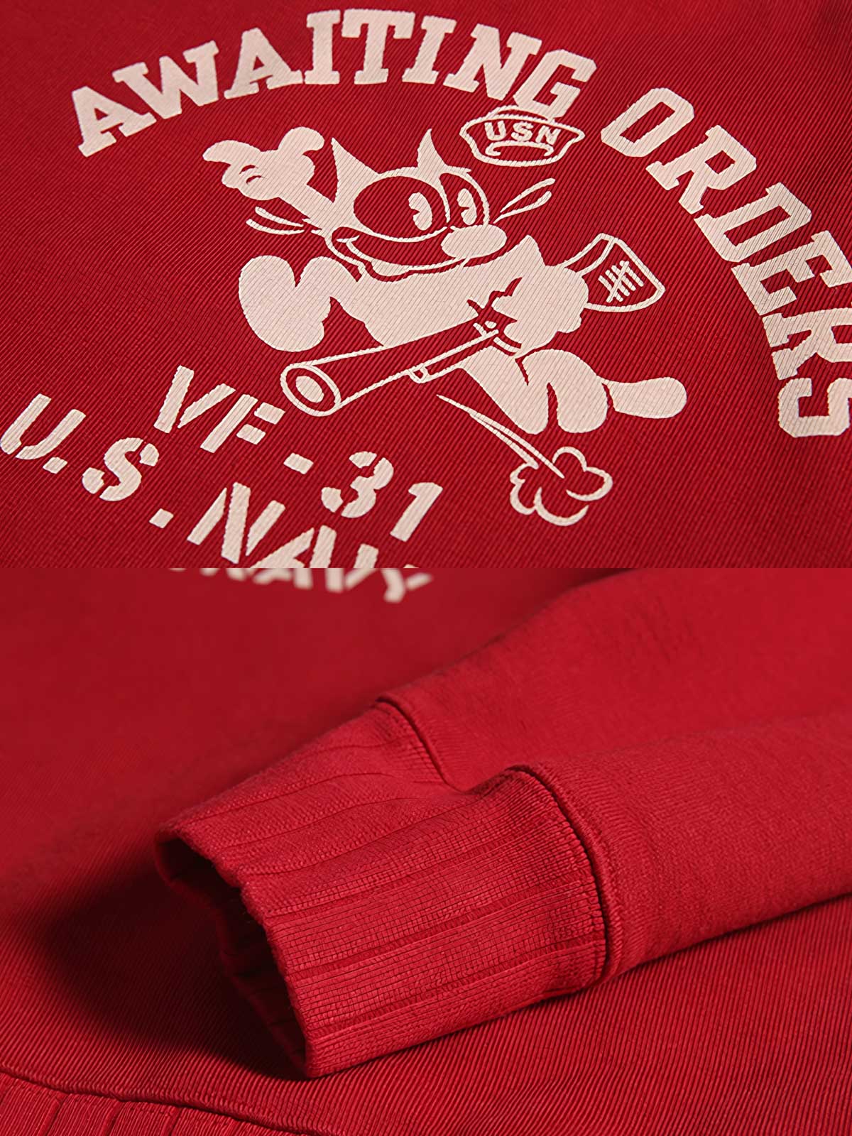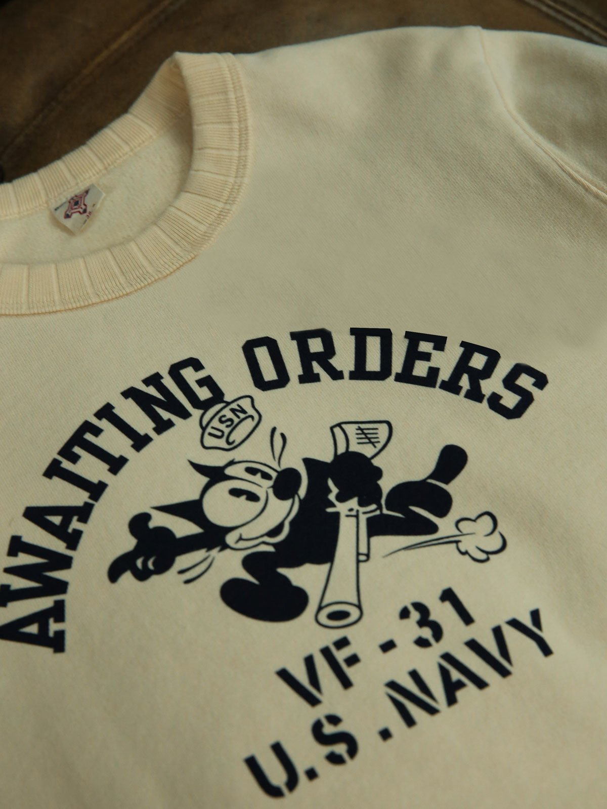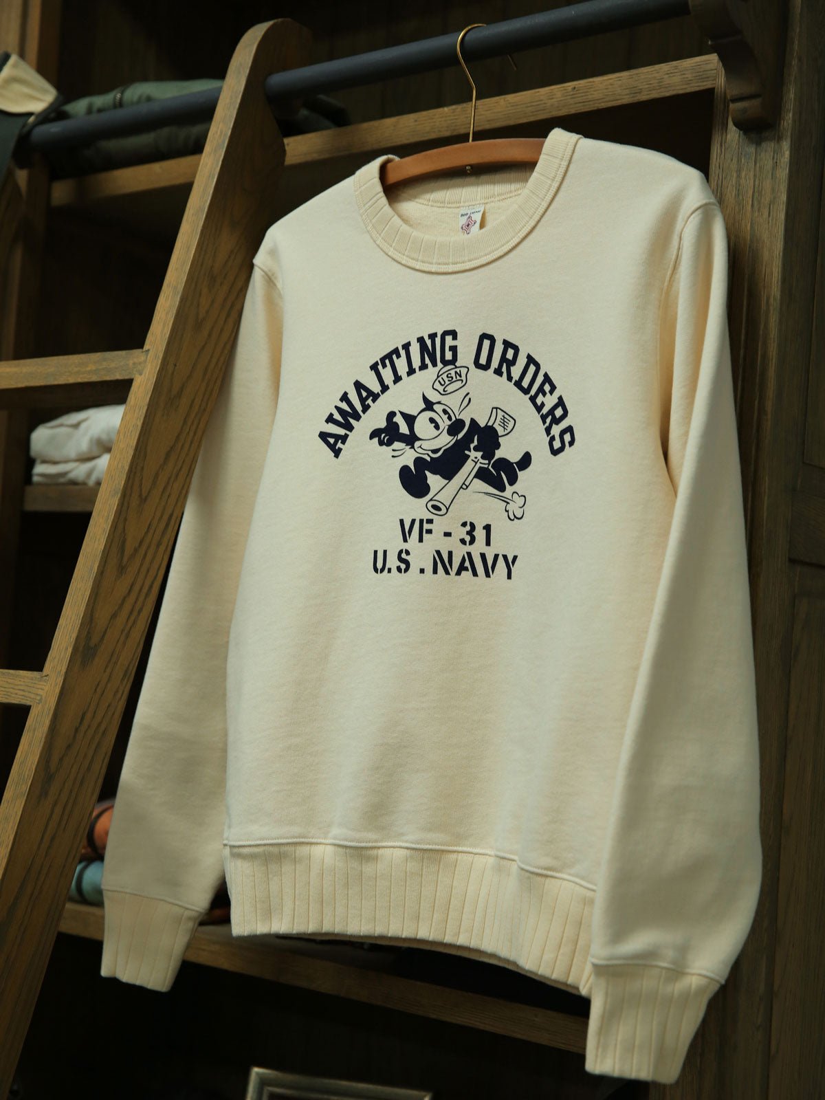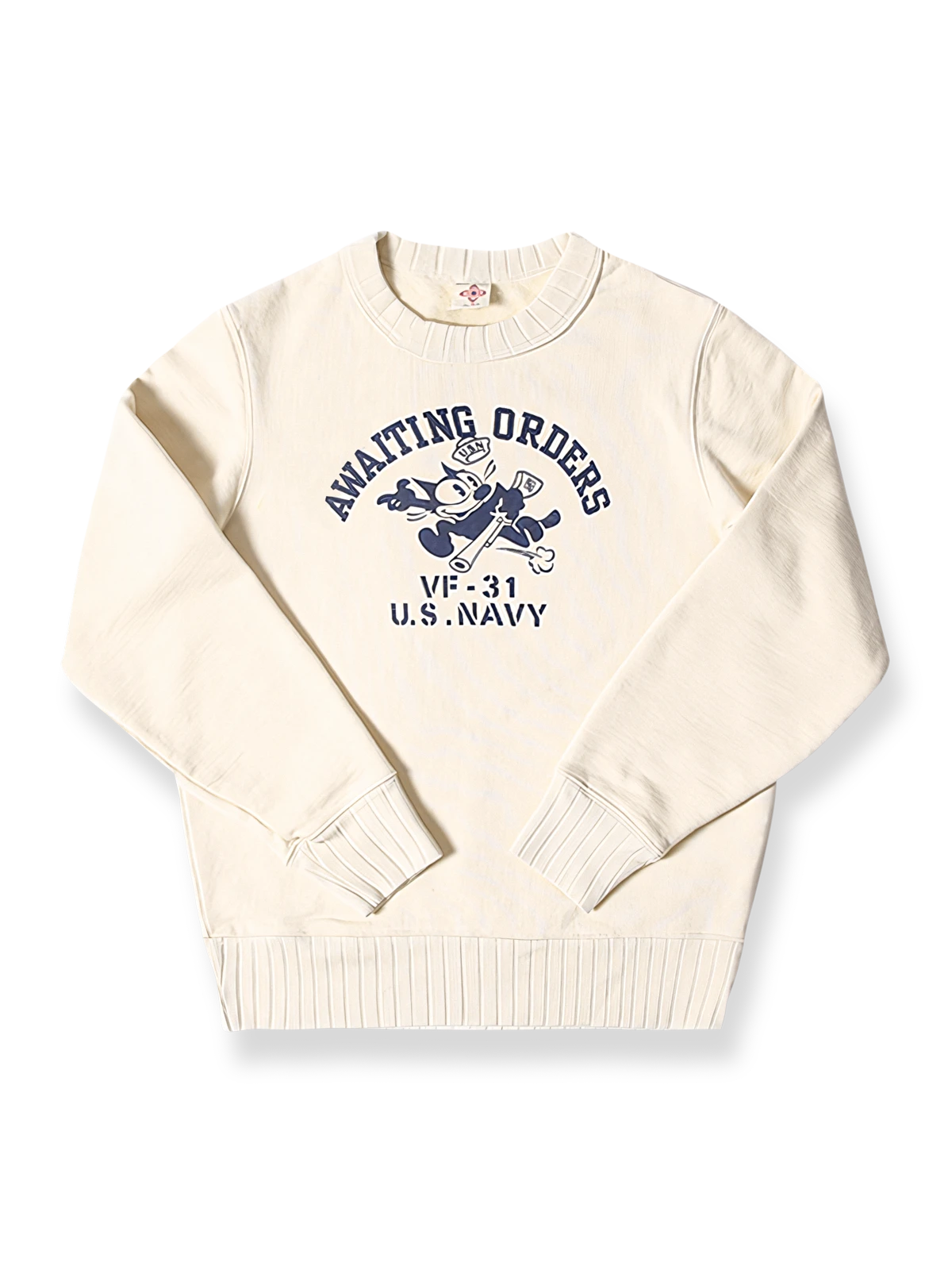 このスウェットは、アメリカ海軍VF-31「Tomcatters」中隊の象徴的なマスコット、フィリックス・ザ・キャット(Felix the Cat)のデザインを中心に展開しています。これは、強い軍事文化と歴史的背景を示しています。