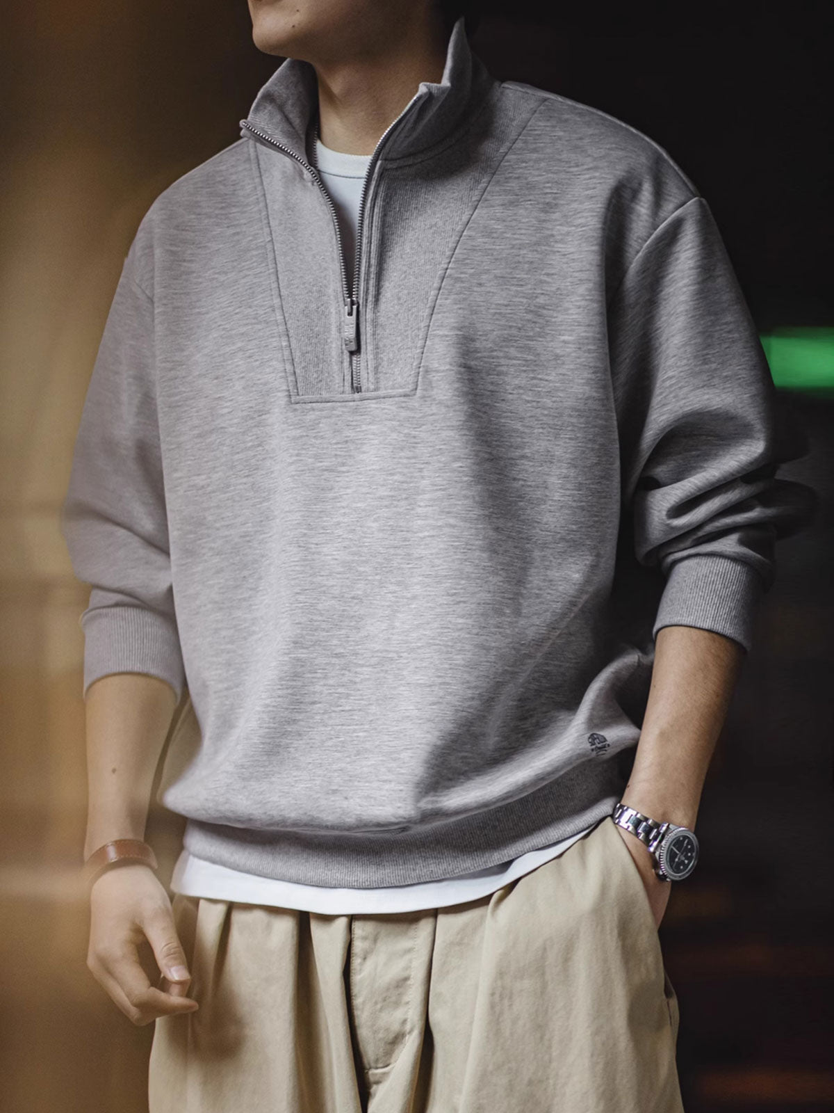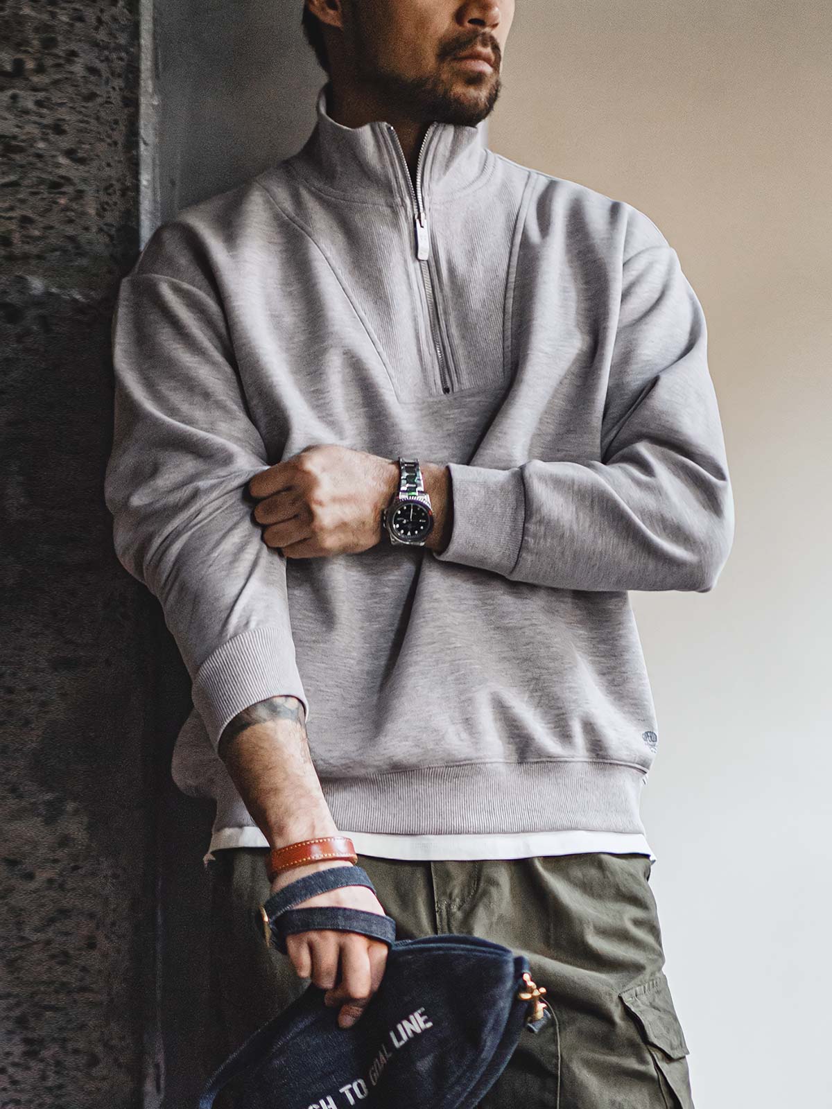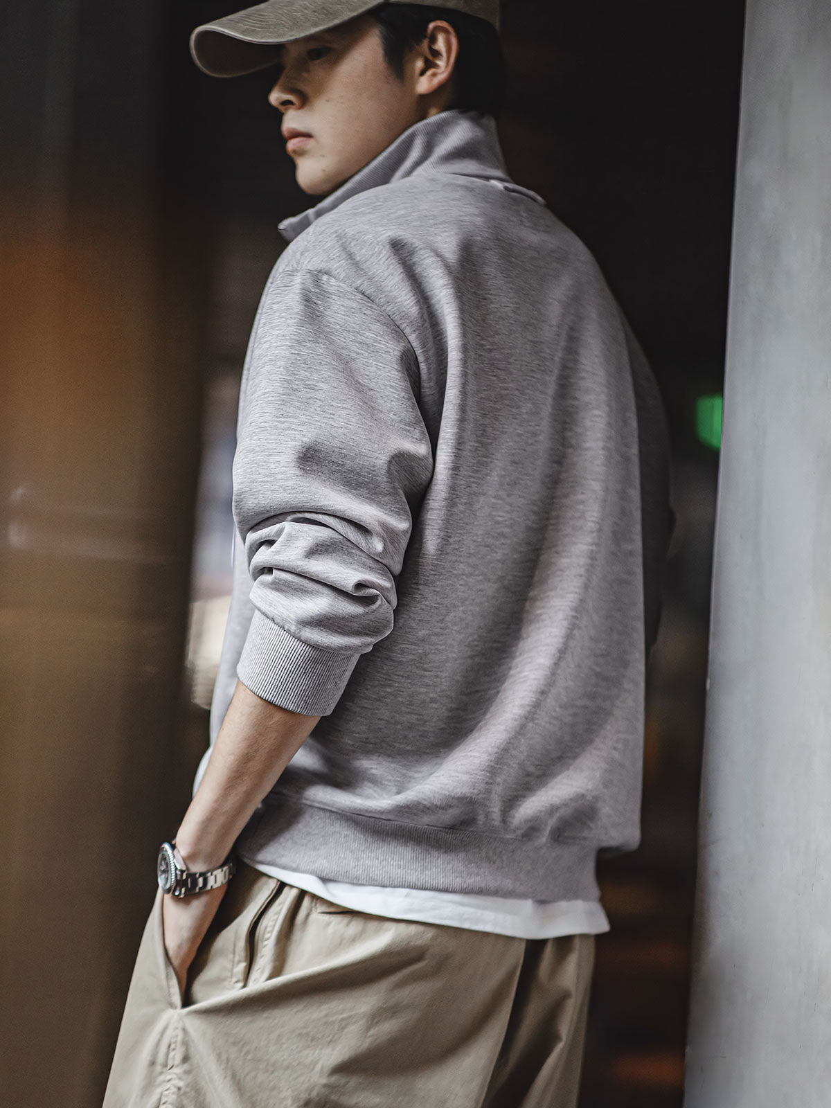 このスウェットシャツは、Ivyスタイルの洗練されたエッセンスを現代的に解釈し、新たな次元を加えています。20世紀初頭のアメリカ東海岸エリート大学のドレスコードであるIvyスタイルの特徴を受け継ぎ、このスウェットシャツは、控えめでありながらエレガントなスタイルを維持しています。特に、トラペゾイド形状のスタンドカラーは、伝統的なスウェットシャツのデザインに新鮮な動きを加え、立体的な層次感を演出し、様々な社交シーンで注目を集めるスタイルを実現します。