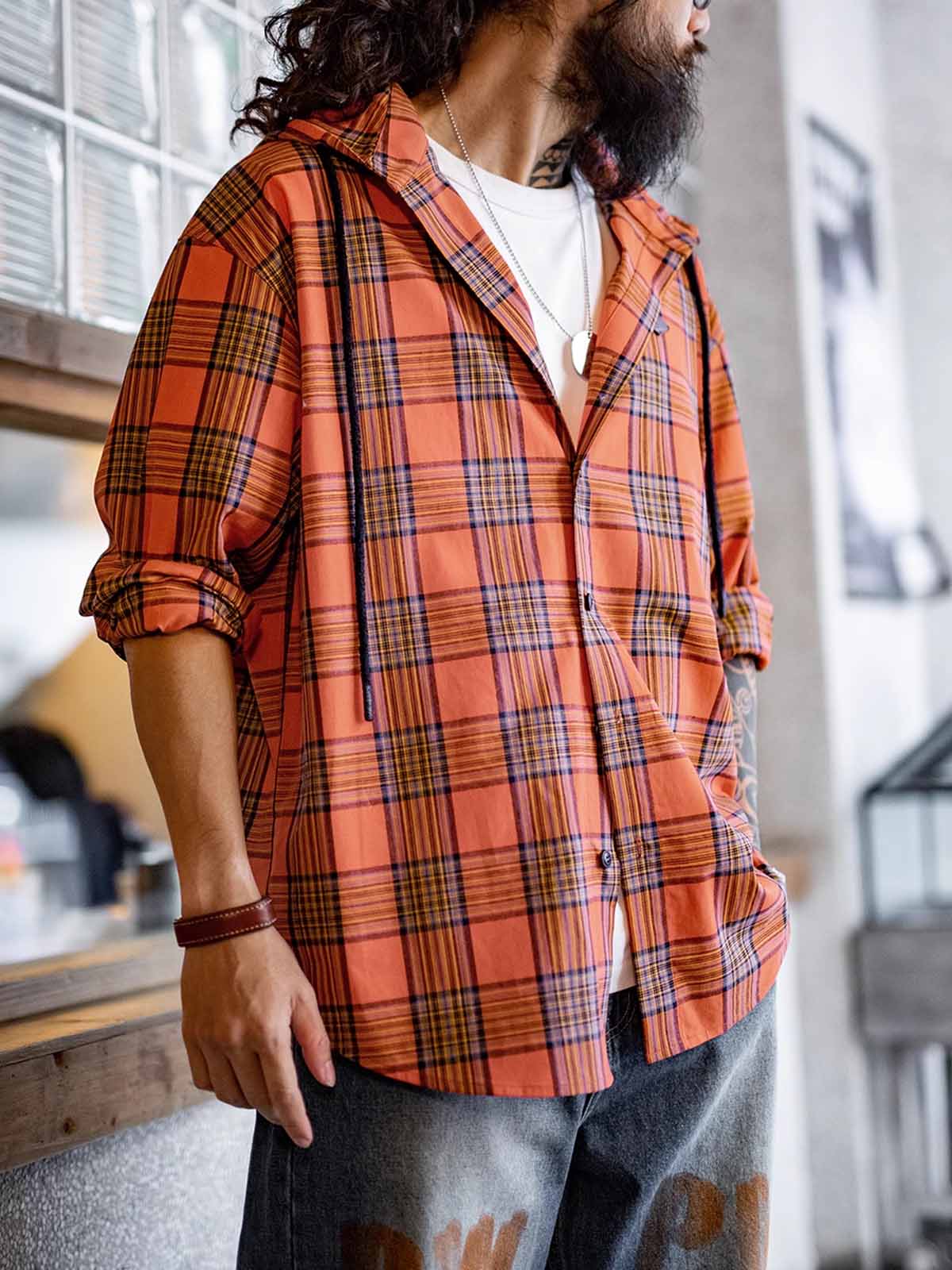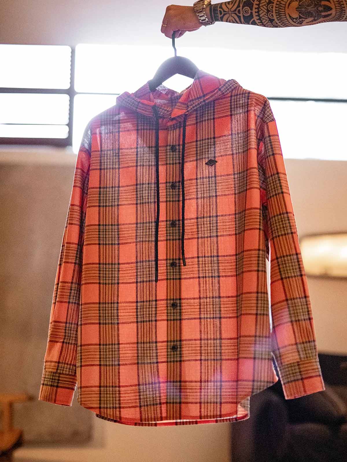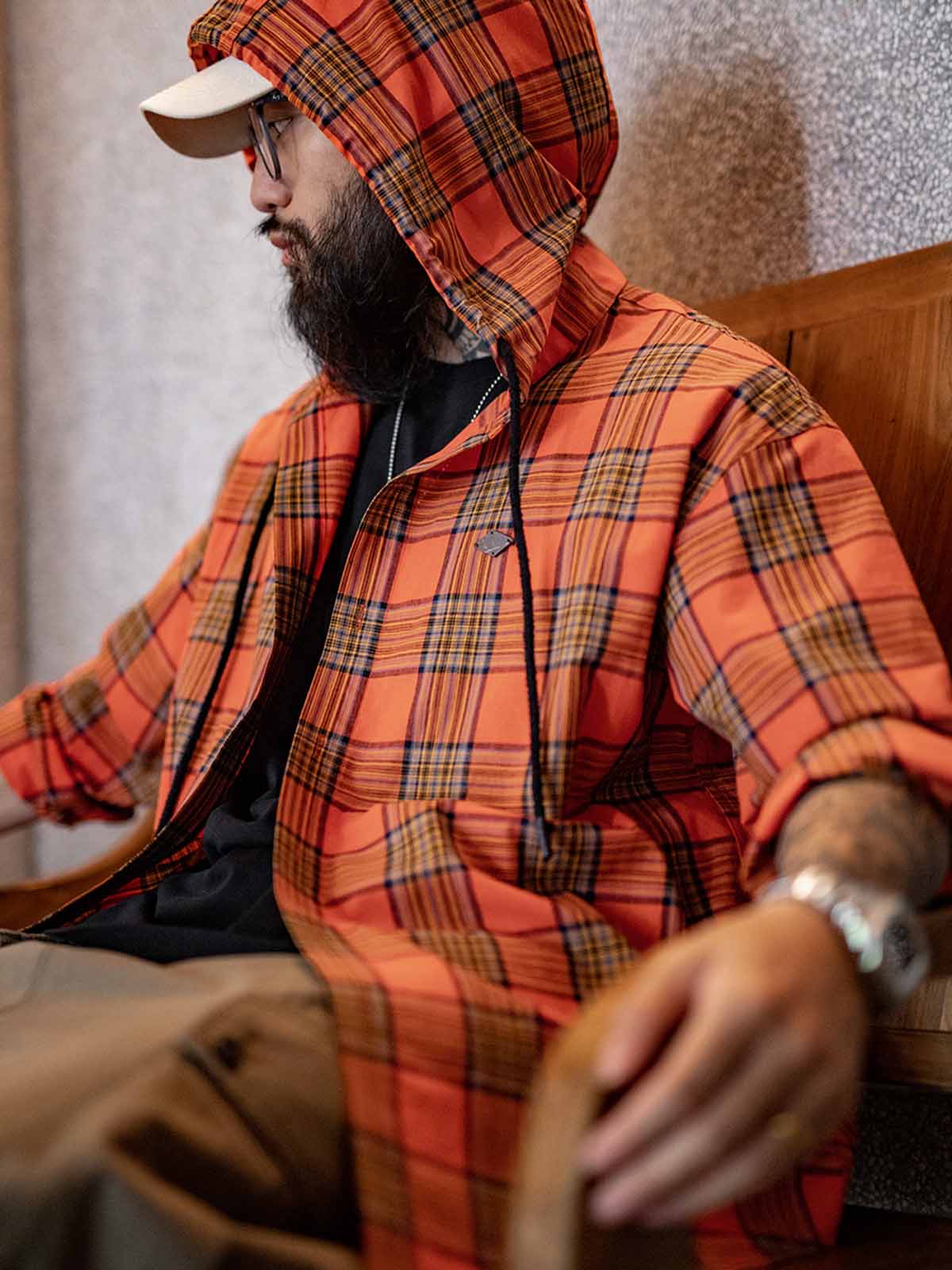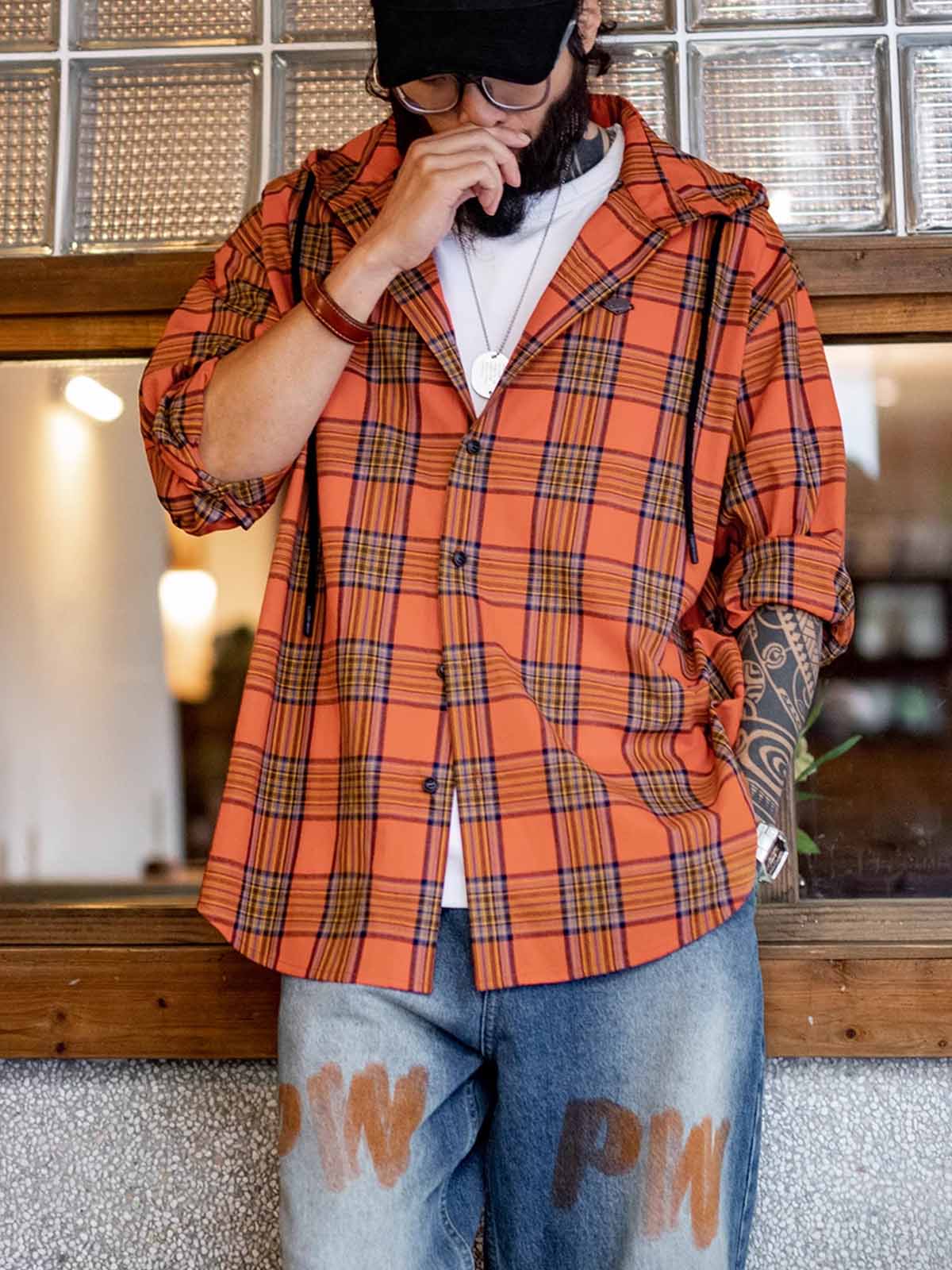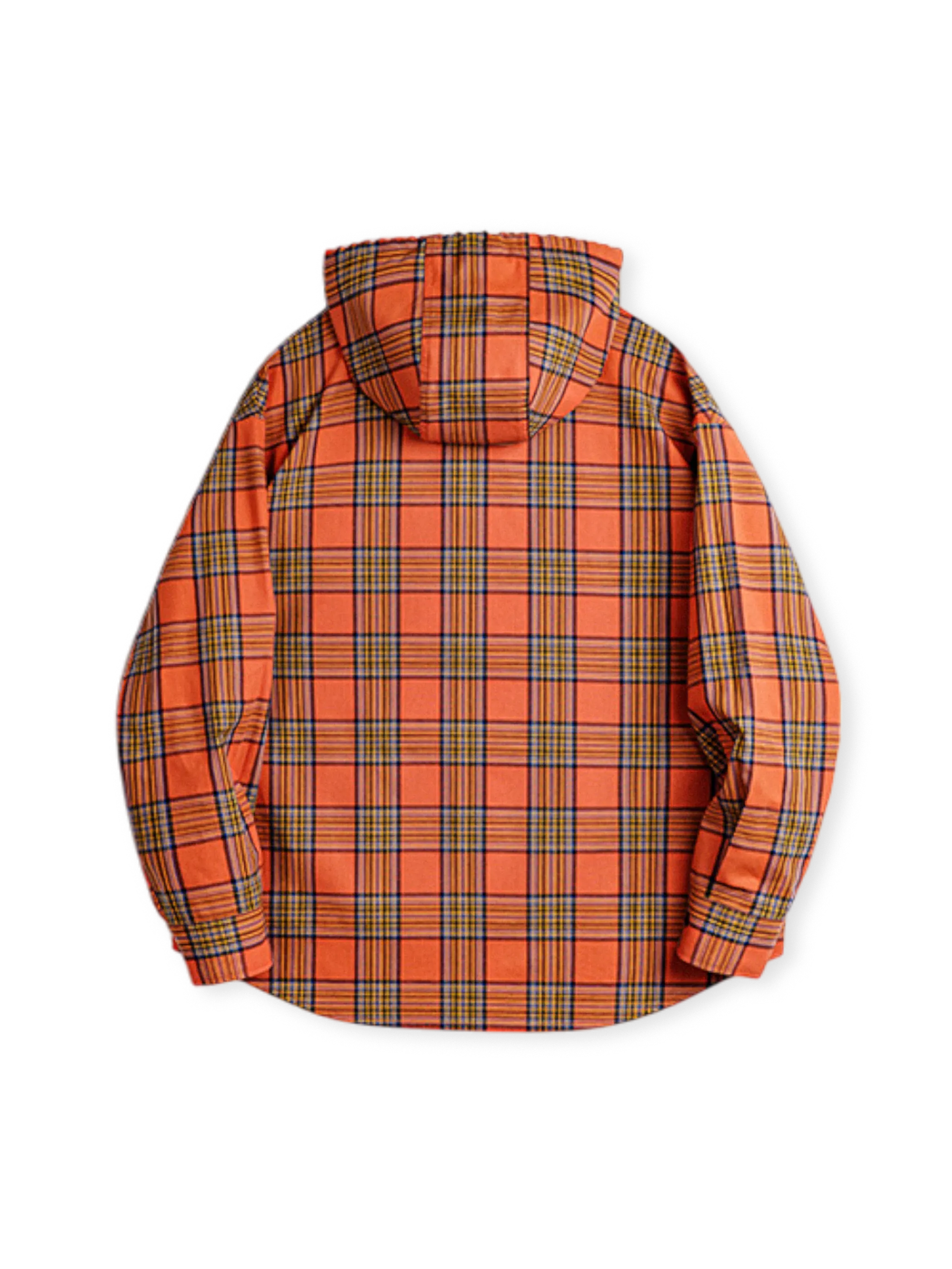 鮮やかなオレンジチェック柄とルーズなフードデザインが融合し、軽量で通気性に優れたヴィンテージカジュアルな一着です。