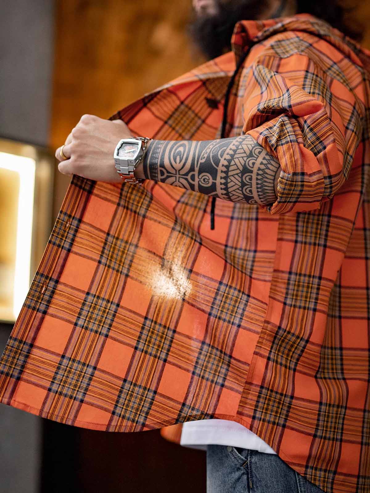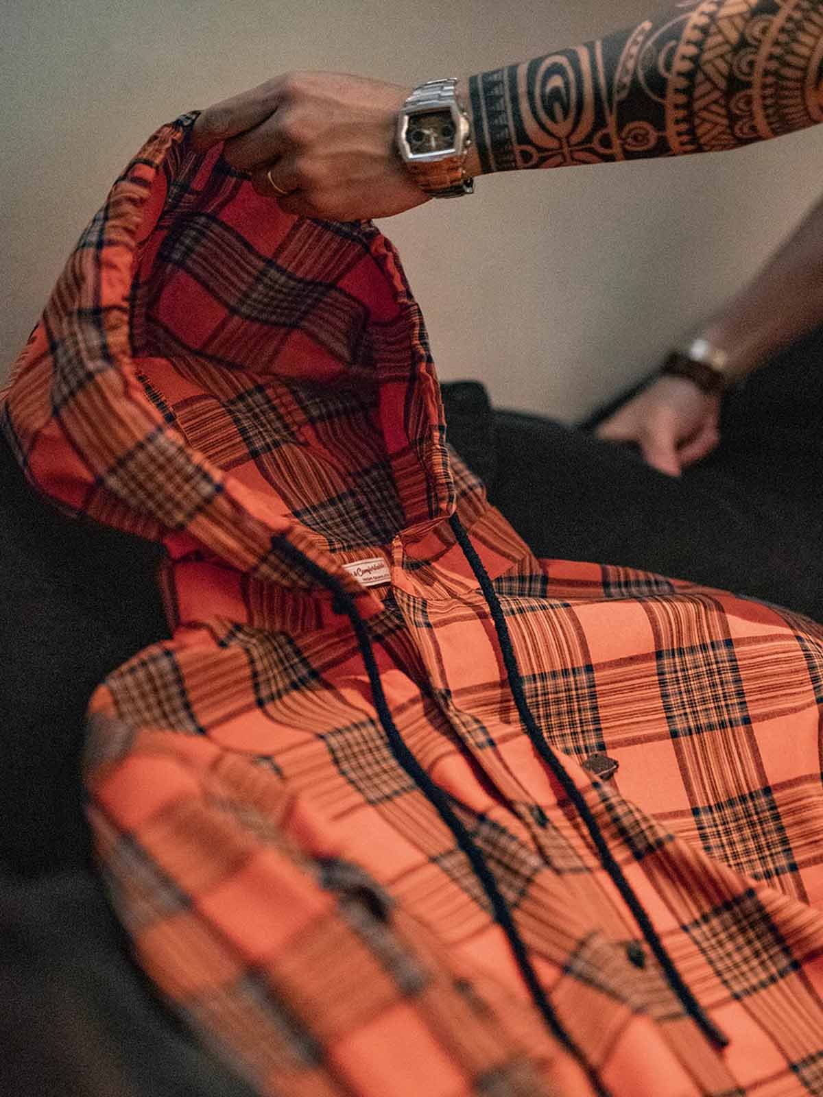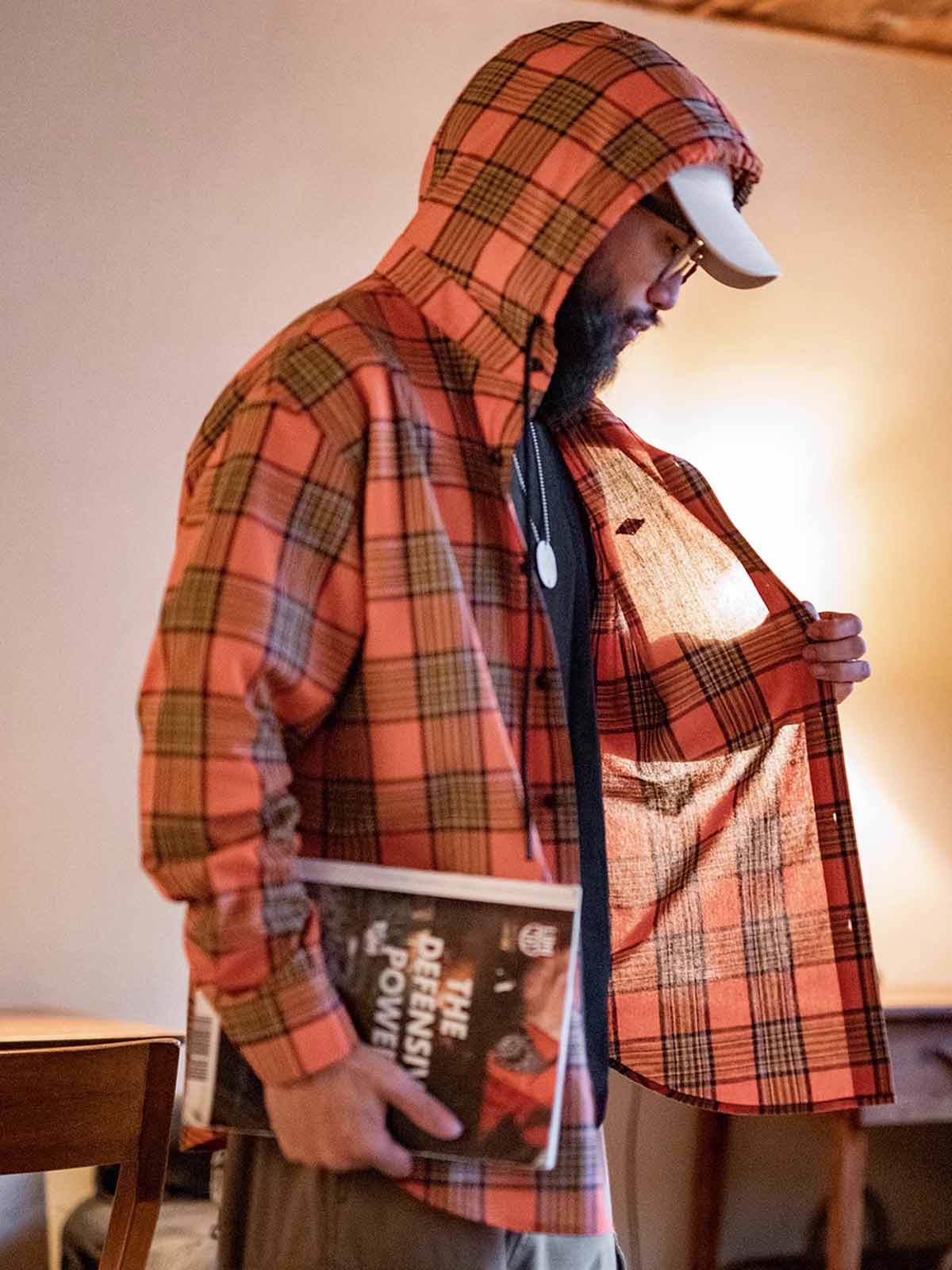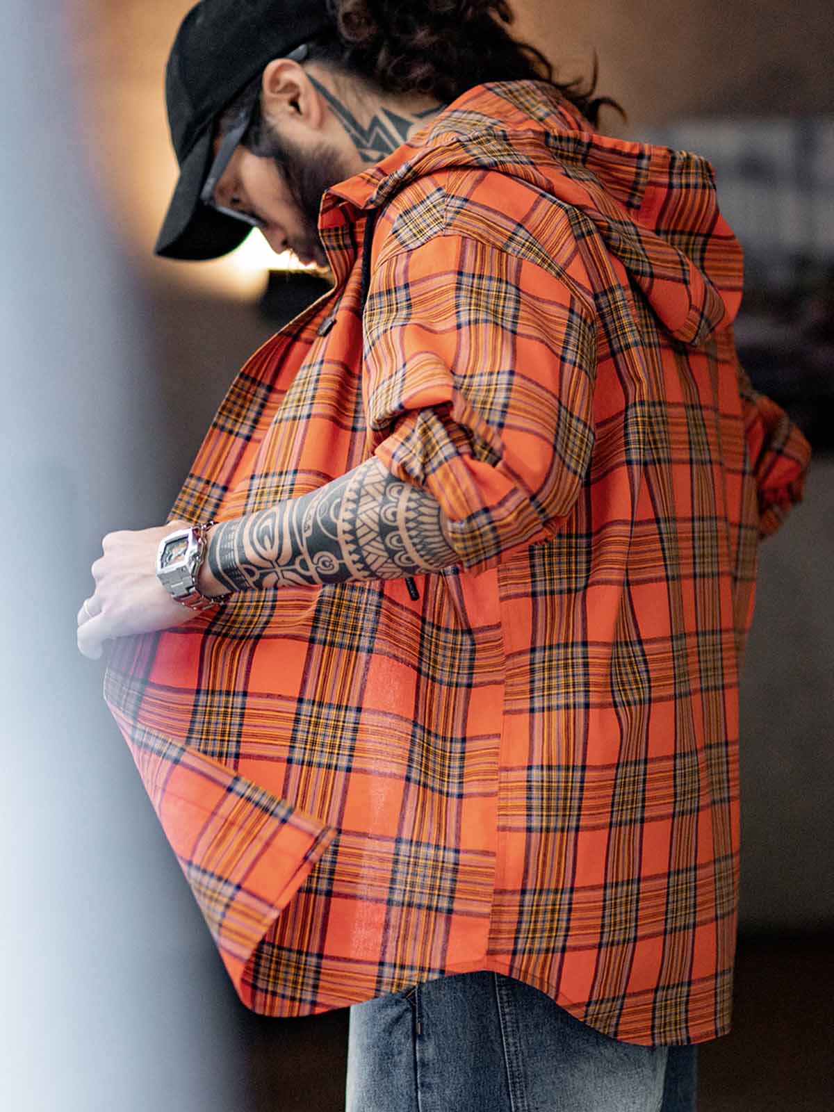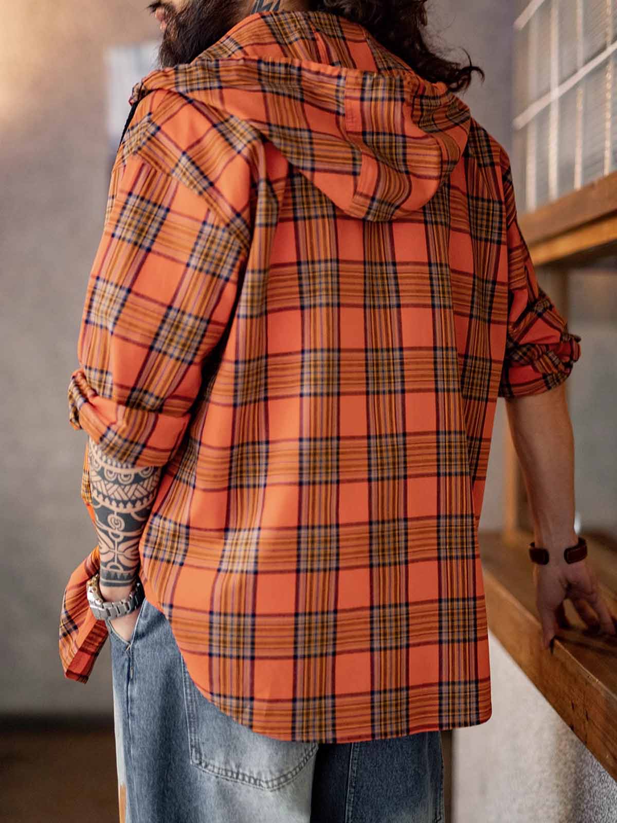 鮮やかなオレンジチェック柄とルーズなフードデザインが融合し、軽量で通気性に優れたヴィンテージカジュアルな一着です。