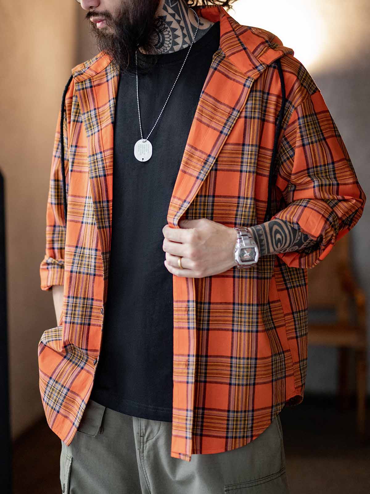 このフーディーシャツは、132g/m²の100%コットン生地を使用しており、春夏は単品でさわやかに、秋冬はレイヤードで着こなせる万能なアイテムです。アメリカンヴィンテージ工装の影響を受けた鮮やかなオレンジチェック柄が、大胆さと活力を表現。フードはドローコード付きで、着用者のスタイルに合わせて調節可能。さらに、弧状の裾デザインが全体のシルエットに柔らかな印象を与え、Tシャツ、ジーンズ、カーゴパンツなどとの相性も抜群。シンプルながらも存在感のあるデザインが、日常のカジュアルからアウトドアシーンまで幅広く活躍します。