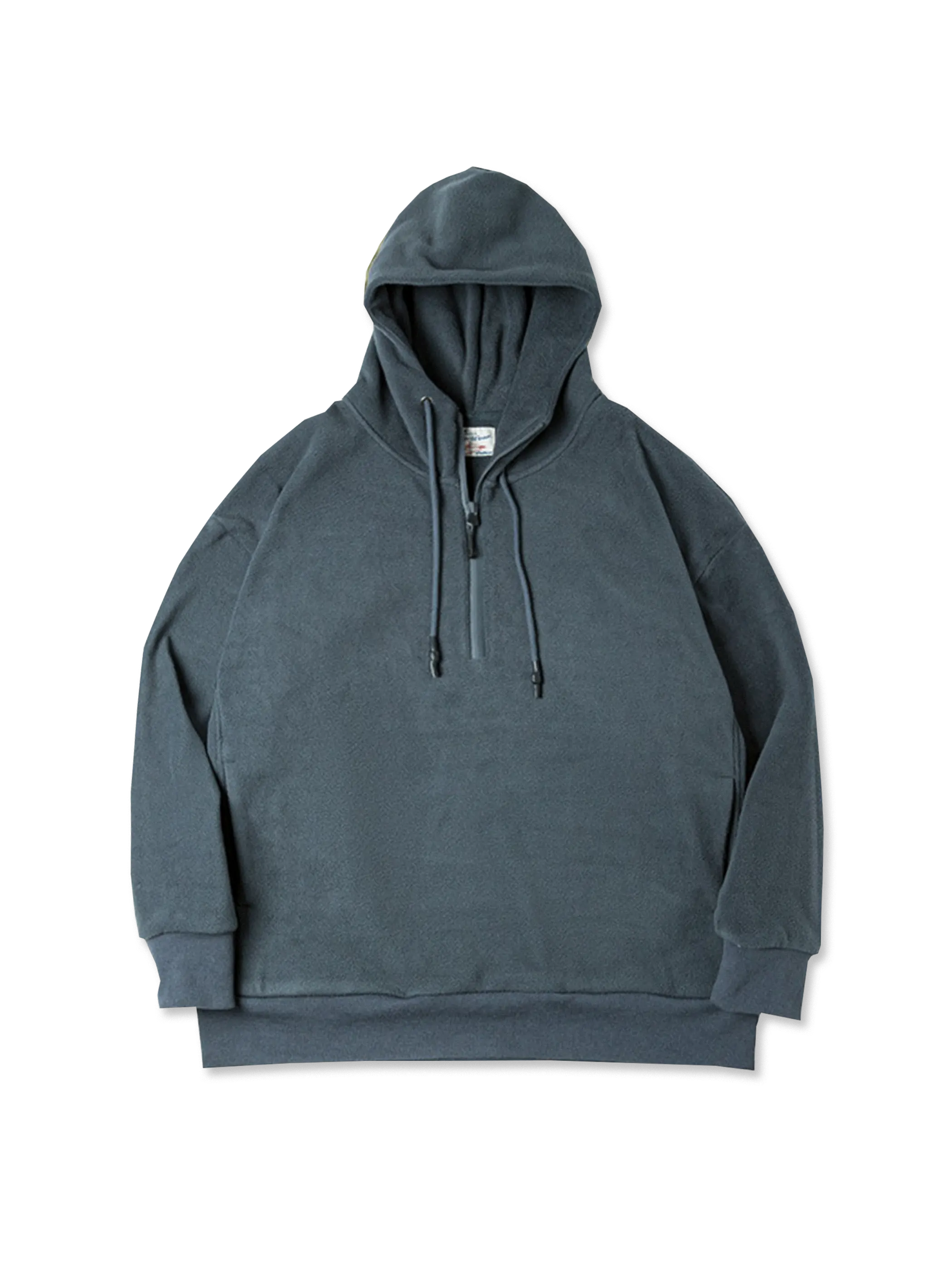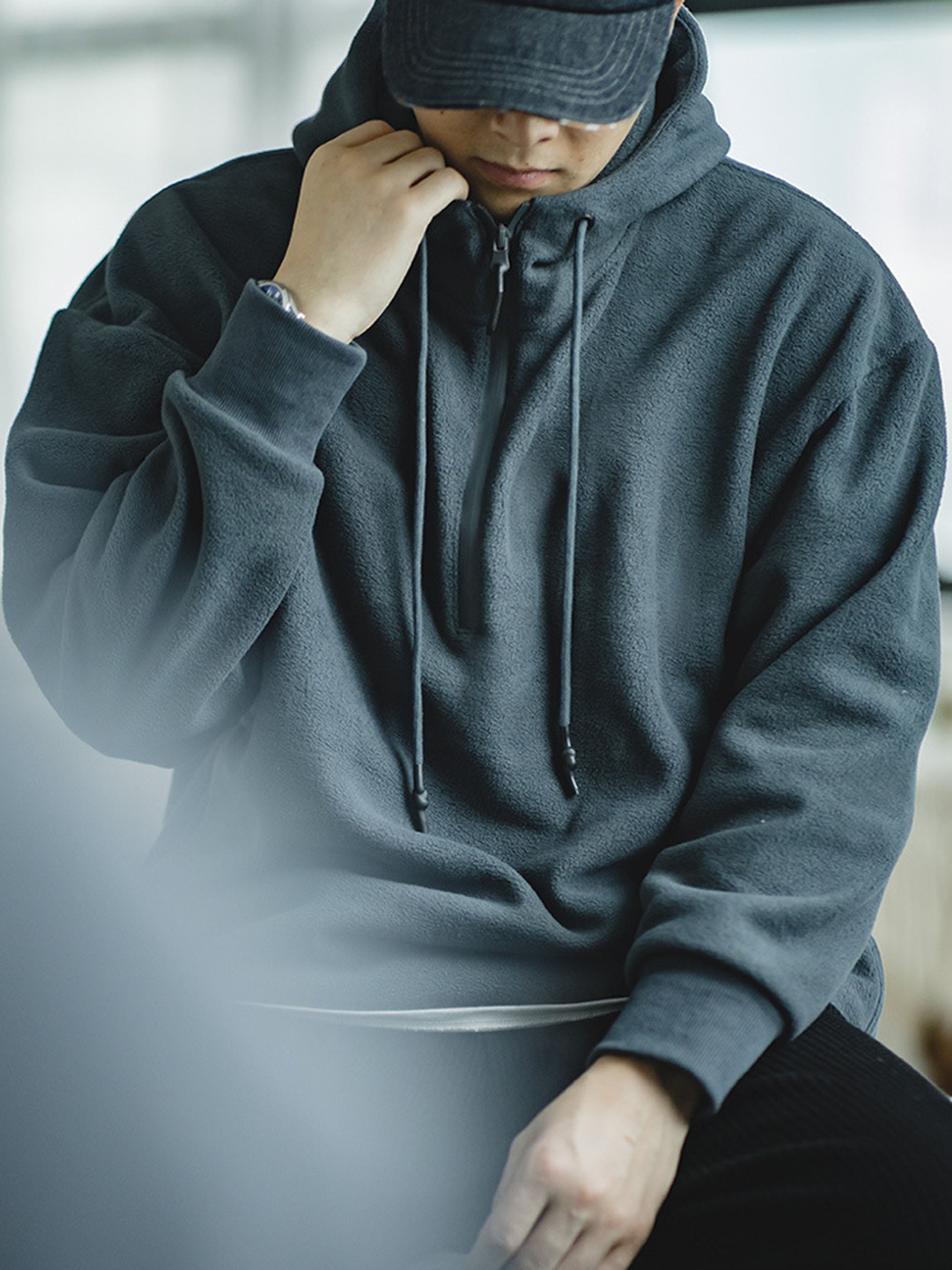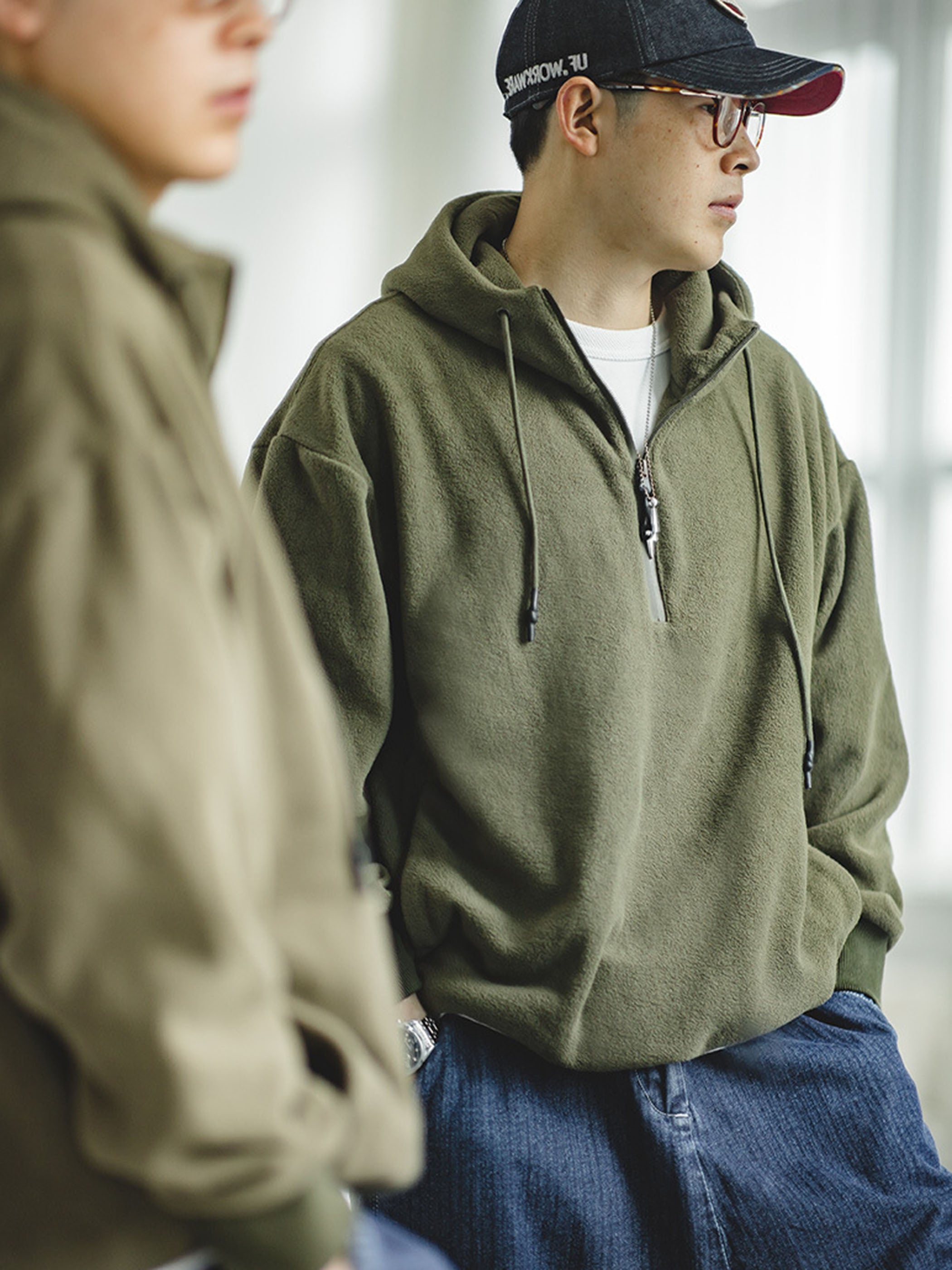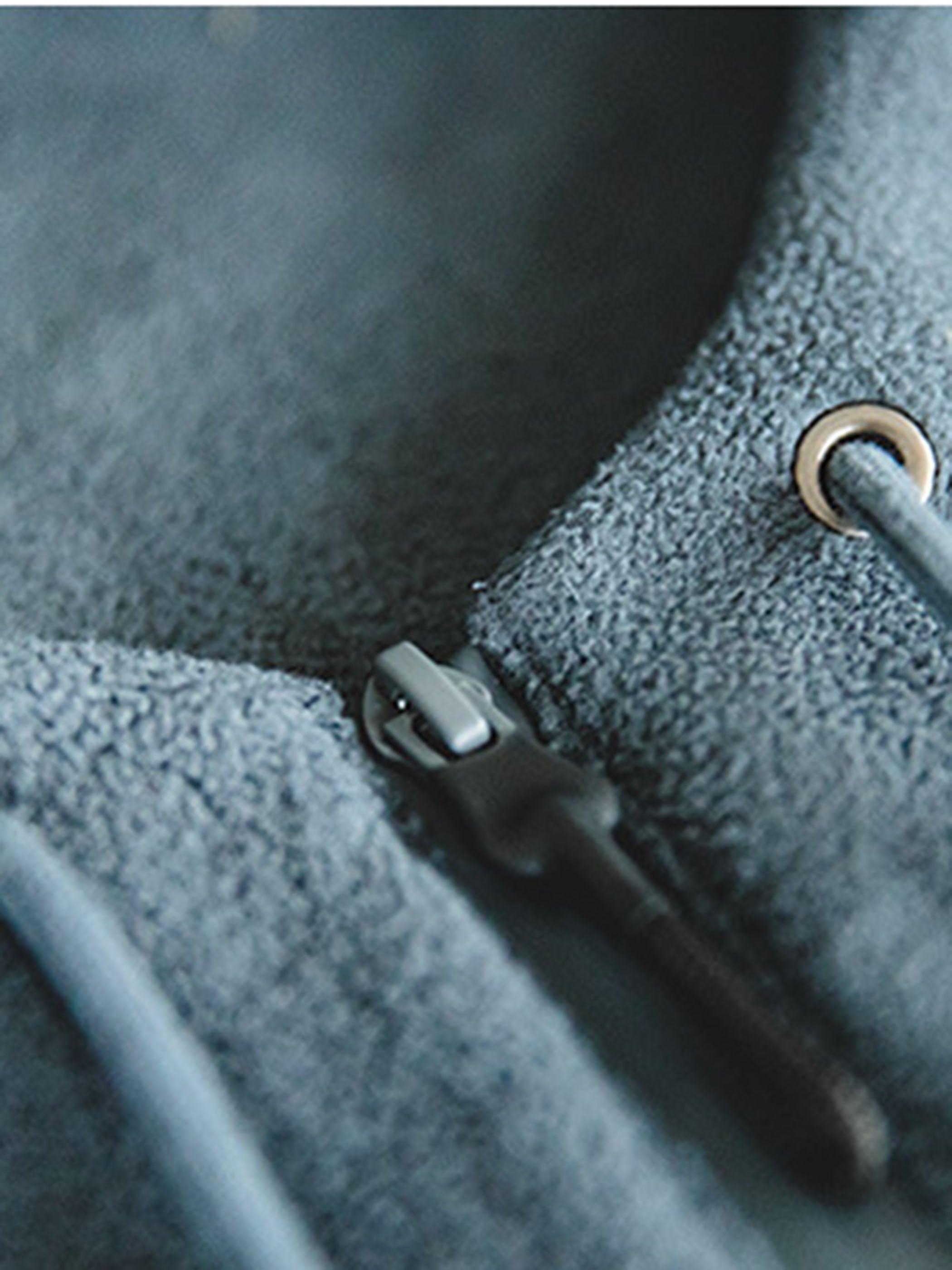 両面フリース素材を使用し、ふんわりとした肌触りと高い保温性を実現。ハーフジップ仕様のハイネックデザインが首元をしっかりカバーし、防風性を強化。防水加工を施した圧着ジップがスポーティな印象をプラスし、悪天候でも快適な着用感を実現。