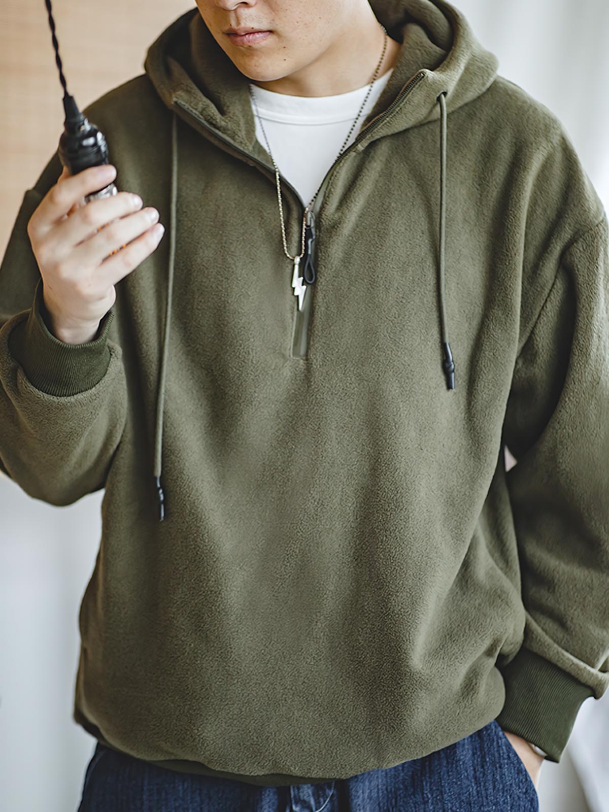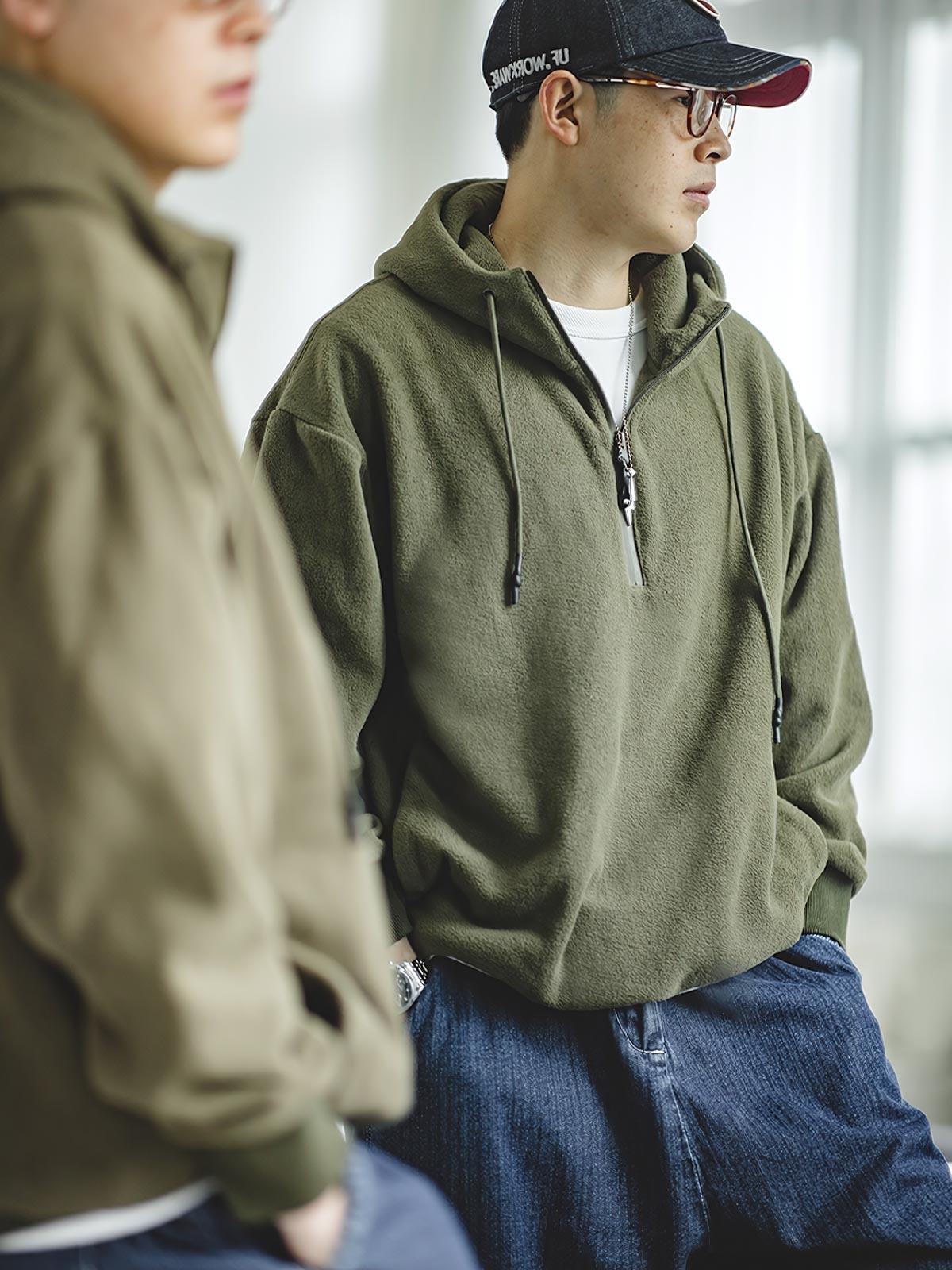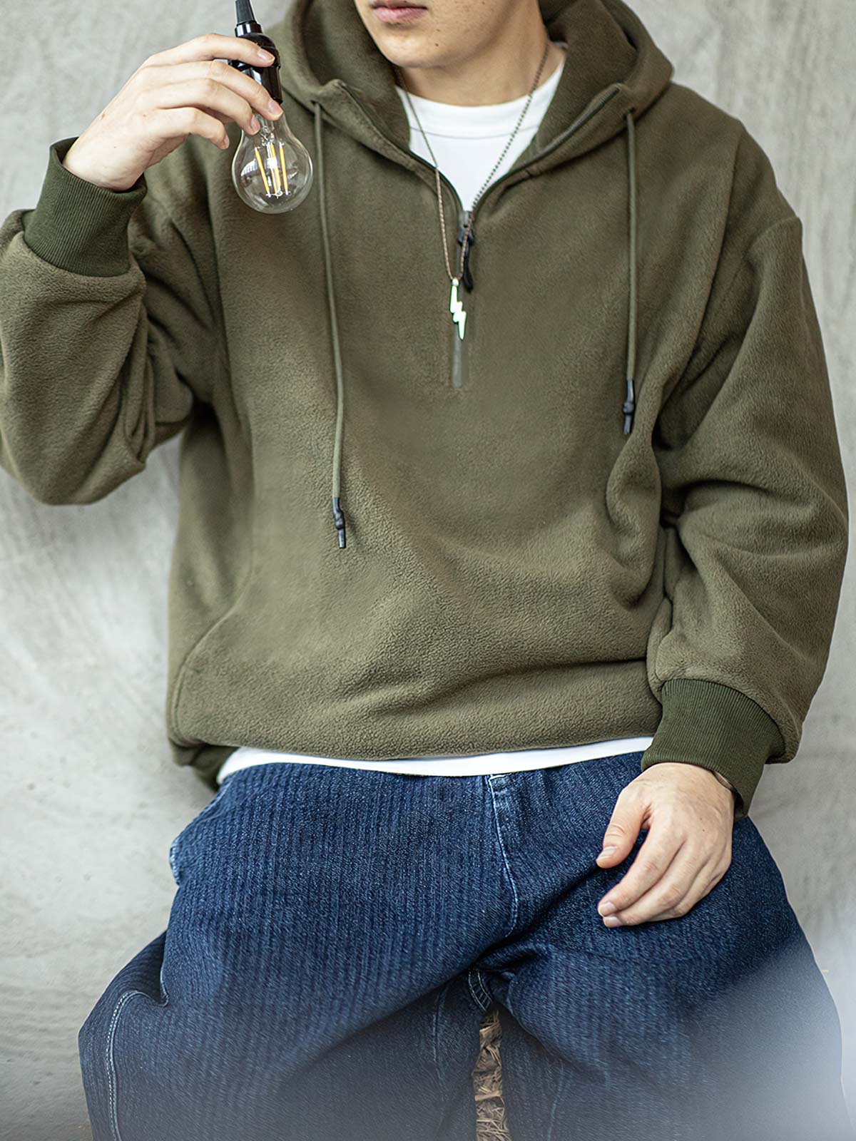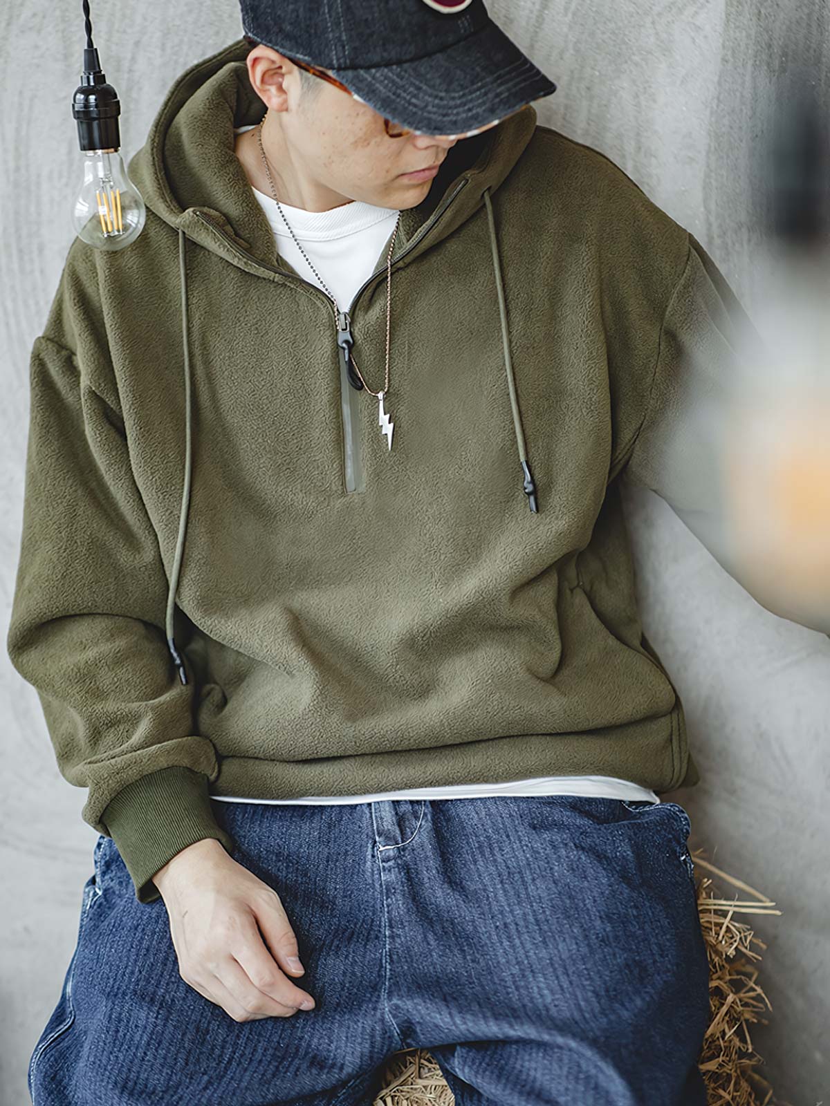 このパーカーは、クラシックなミリタリーグリーンを採用し、色彩のインスピレーションは軍服から来ています。これは耐久性と実用性を象徴しています。ハーフジップのデザインは、伝統的なパーカーのカジュアルなスタイルと現代の機能性を融合し、便利な着脱体験を提供します。フリース素材はアウトドアスポーツウェアから採用され、保温性に重点を置きつつ、カジュアルウェアに質感と快適さを加えています。