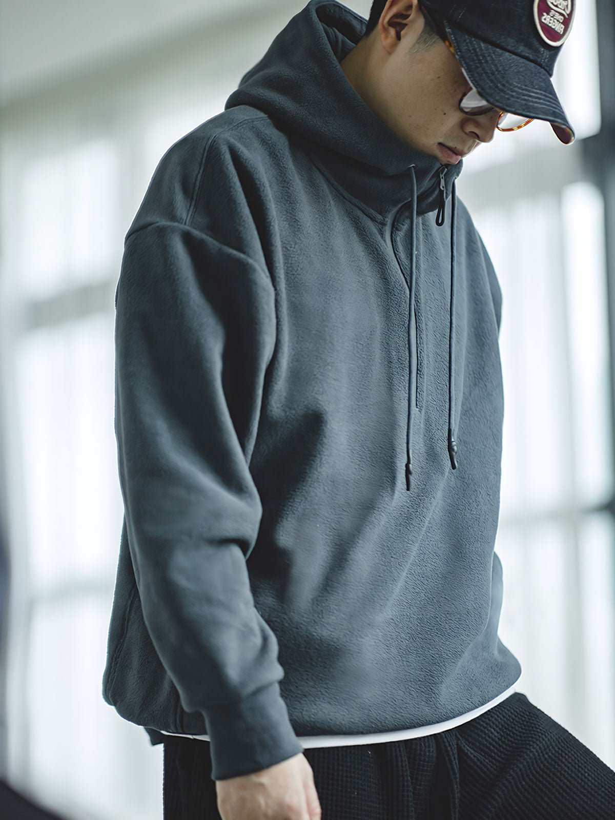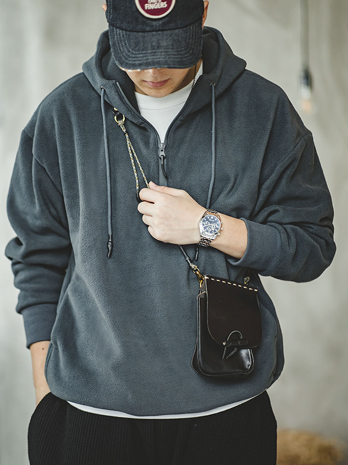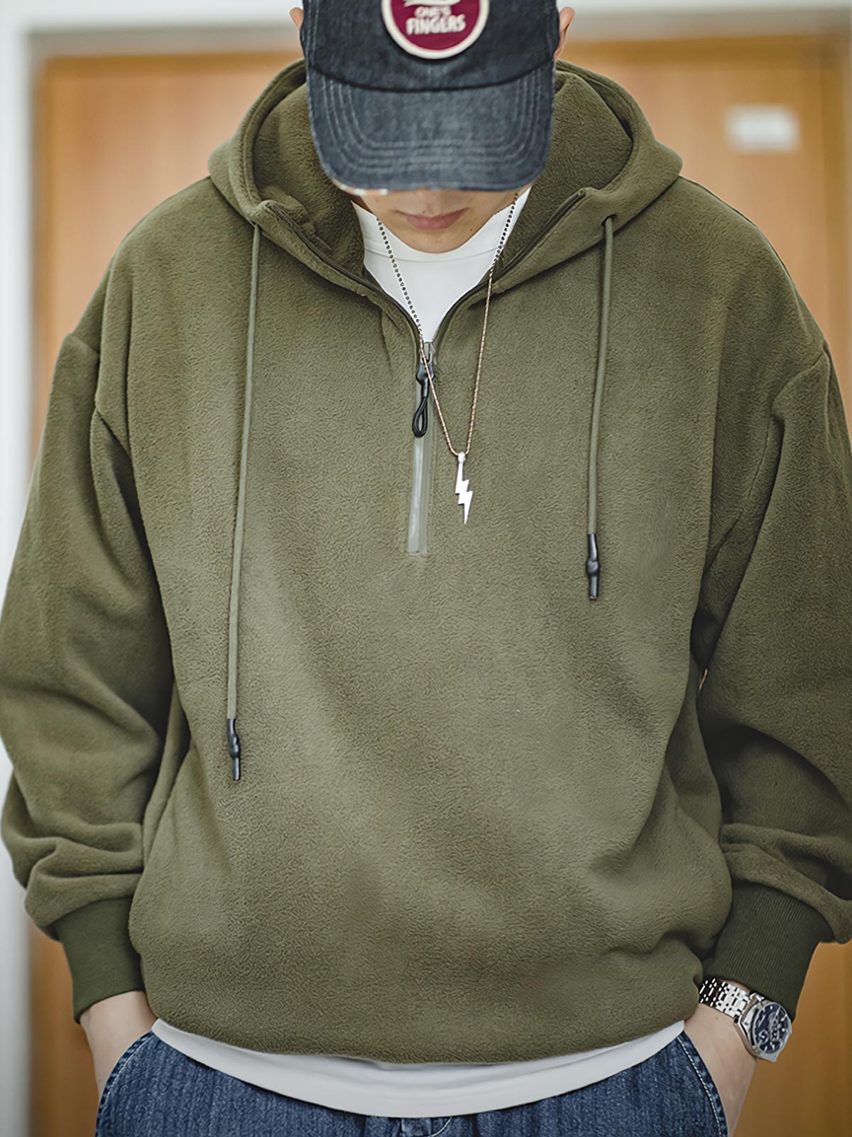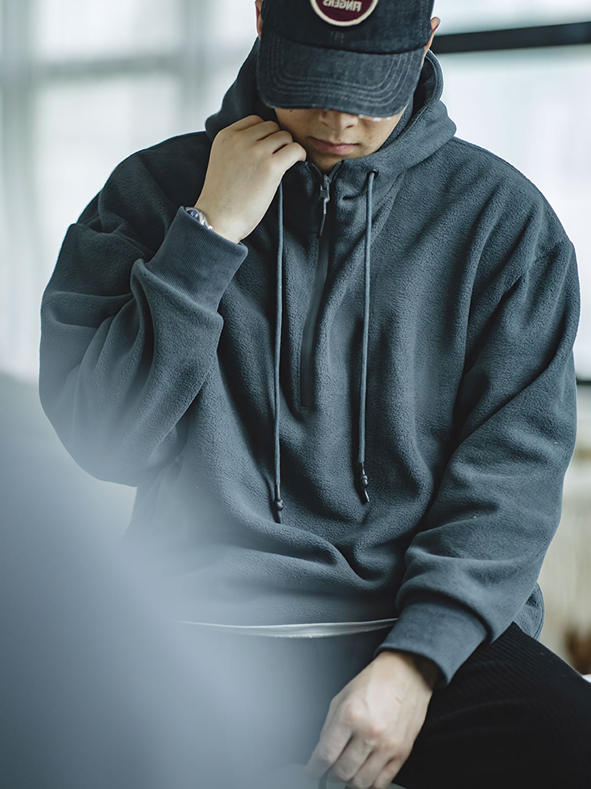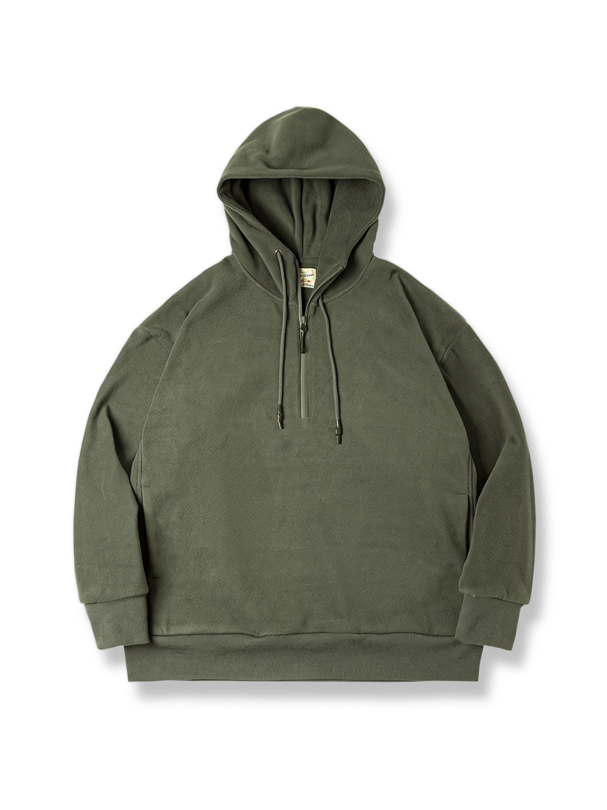 このパーカーは、クラシックなミリタリーグリーンを採用し、色彩のインスピレーションは軍服から来ています。これは耐久性と実用性を象徴しています。ハーフジップのデザインは、伝統的なパーカーのカジュアルなスタイルと現代の機能性を融合し、便利な着脱体験を提供します。フリース素材はアウトドアスポーツウェアから採用され、保温性に重点を置きつつ、カジュアルウェアに質感と快適さを加えています。