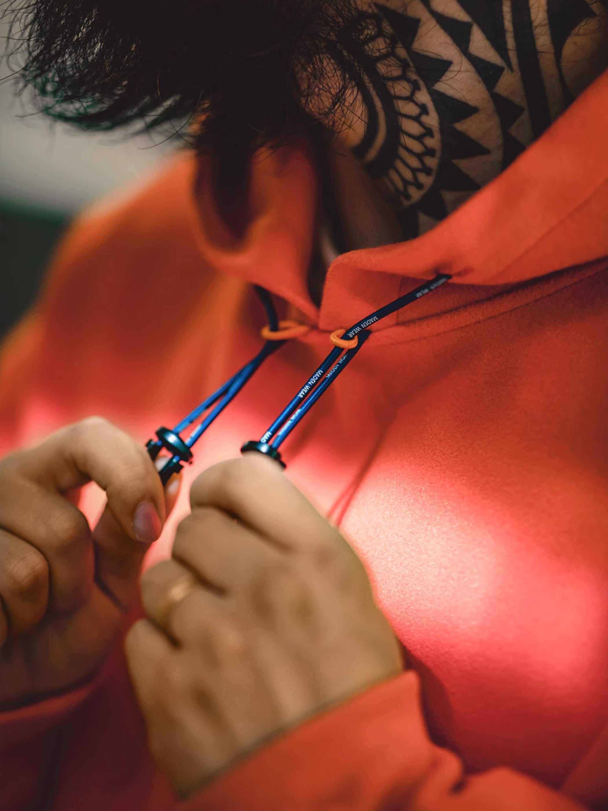 このパーカーは、インディアンの"荒地"の装飾の影響を受けたデザインで、独特の文化的雰囲気を醸し出しています。金属製のU字型のボタンとアウトドア感のあるカラフルな帽子紐は、アウトドアアドベンチャーのファッション要素を際立たせています。