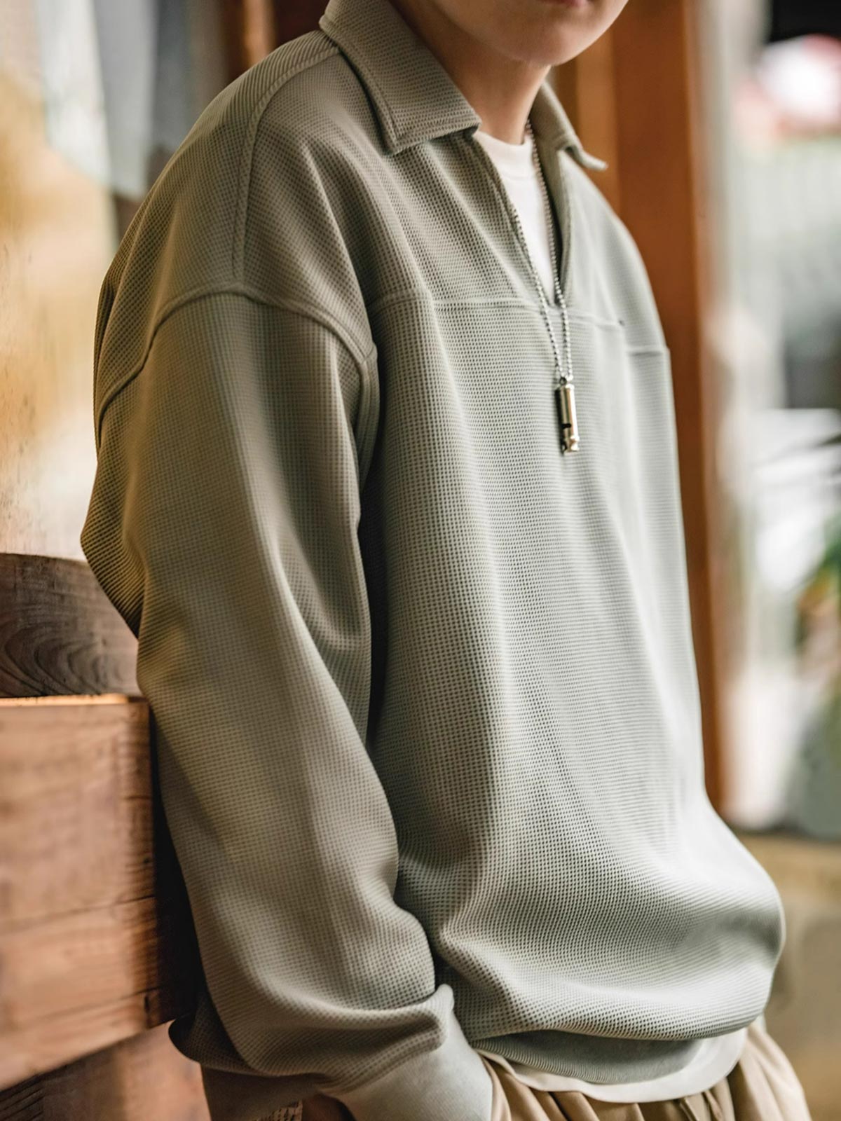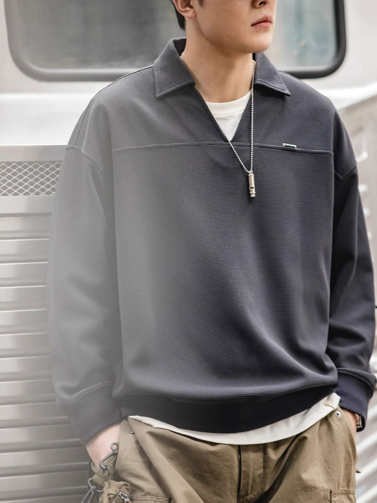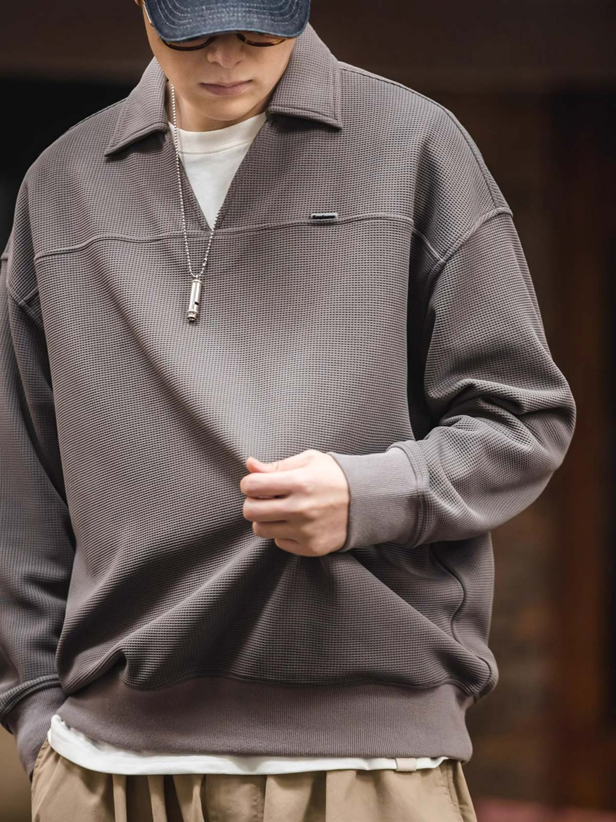 ワッフル織りは、そのユニークな幾何学的構造と快適な質感で、休日の装いの中でエレガントな象徴とされてきました。このVネックポロシャツは、伝統的なワッフル織りを現代のカジュアルウェアデザインと融合させ、クラシックな服装の歴史的文化的背景を継承するとともに、現代の都市生活の着用ニーズに応えています。裾と袖口のしっかりとした伸縮性のあるデザインは、動きやすさを保ちながらもシャツの全体的なシルエットを保持します。
