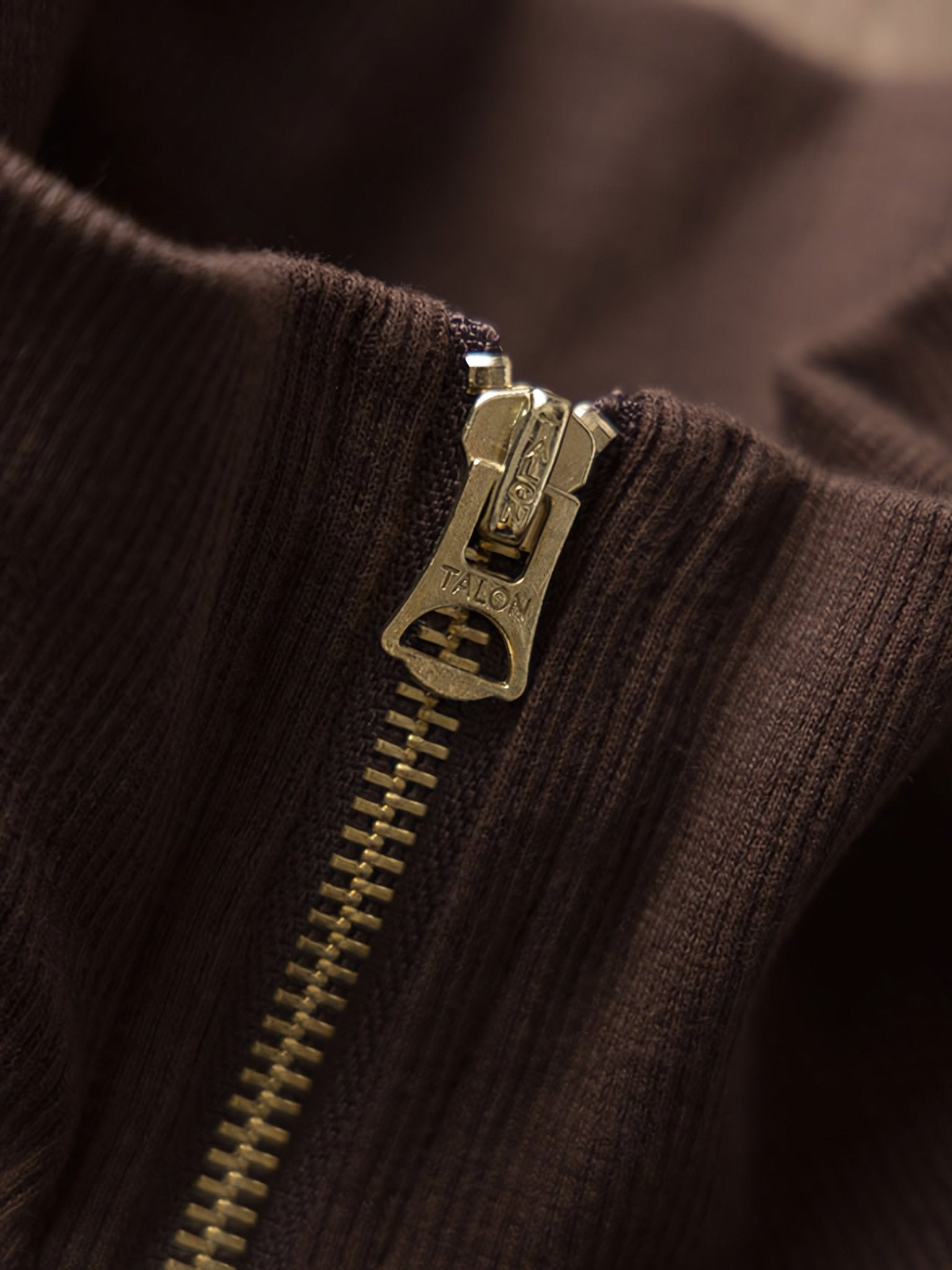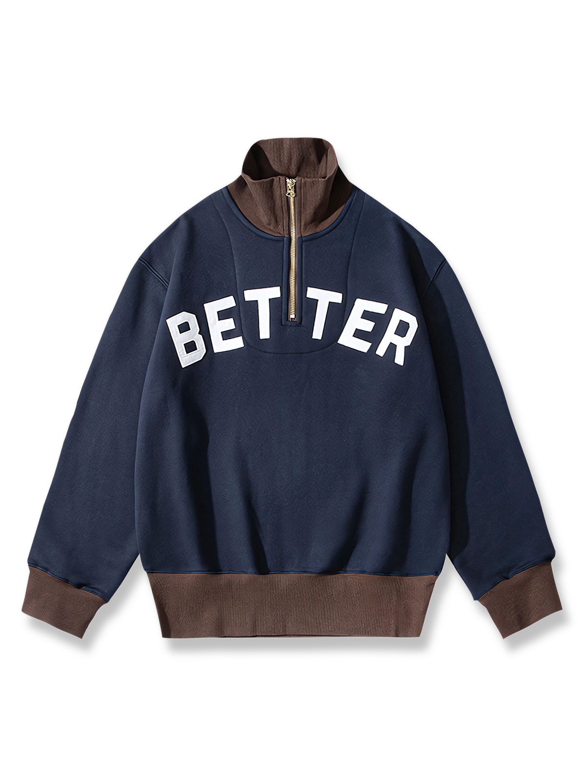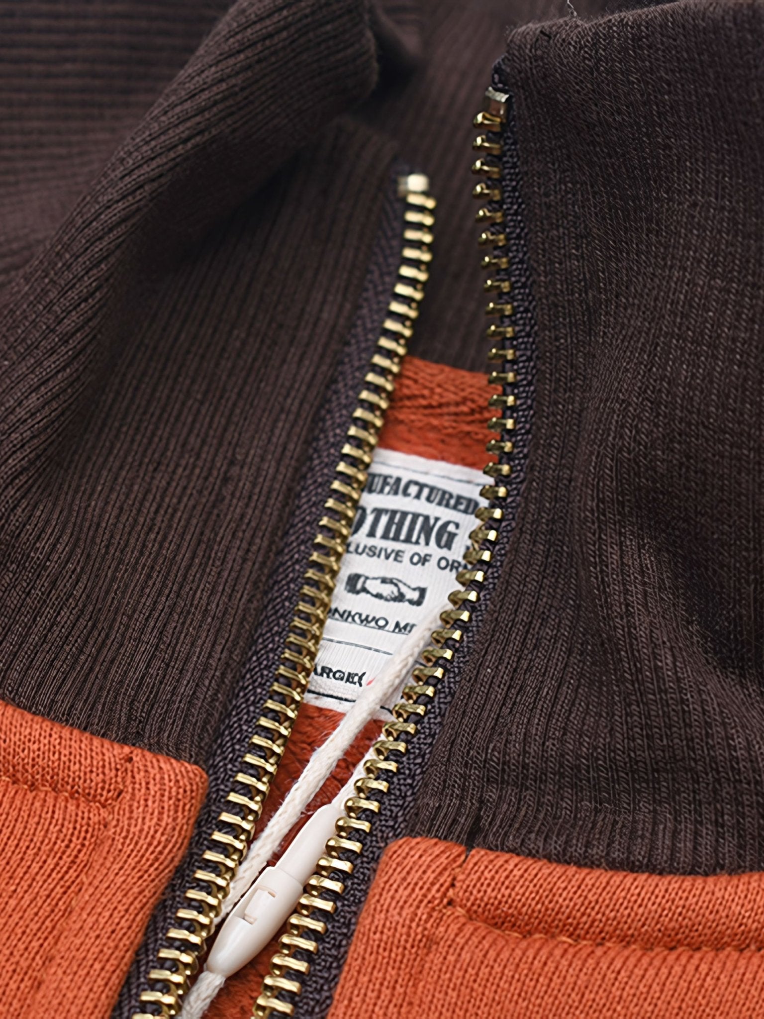 スウェットはタートルネックデザインとなっており、首元の保温性を高めます。また、ハーフジップが配置されており、首元の開閉を調節することができ、スタイリングのバリエーションを追加することも可能です。これにより、ユニークな雰囲気を演出できます。