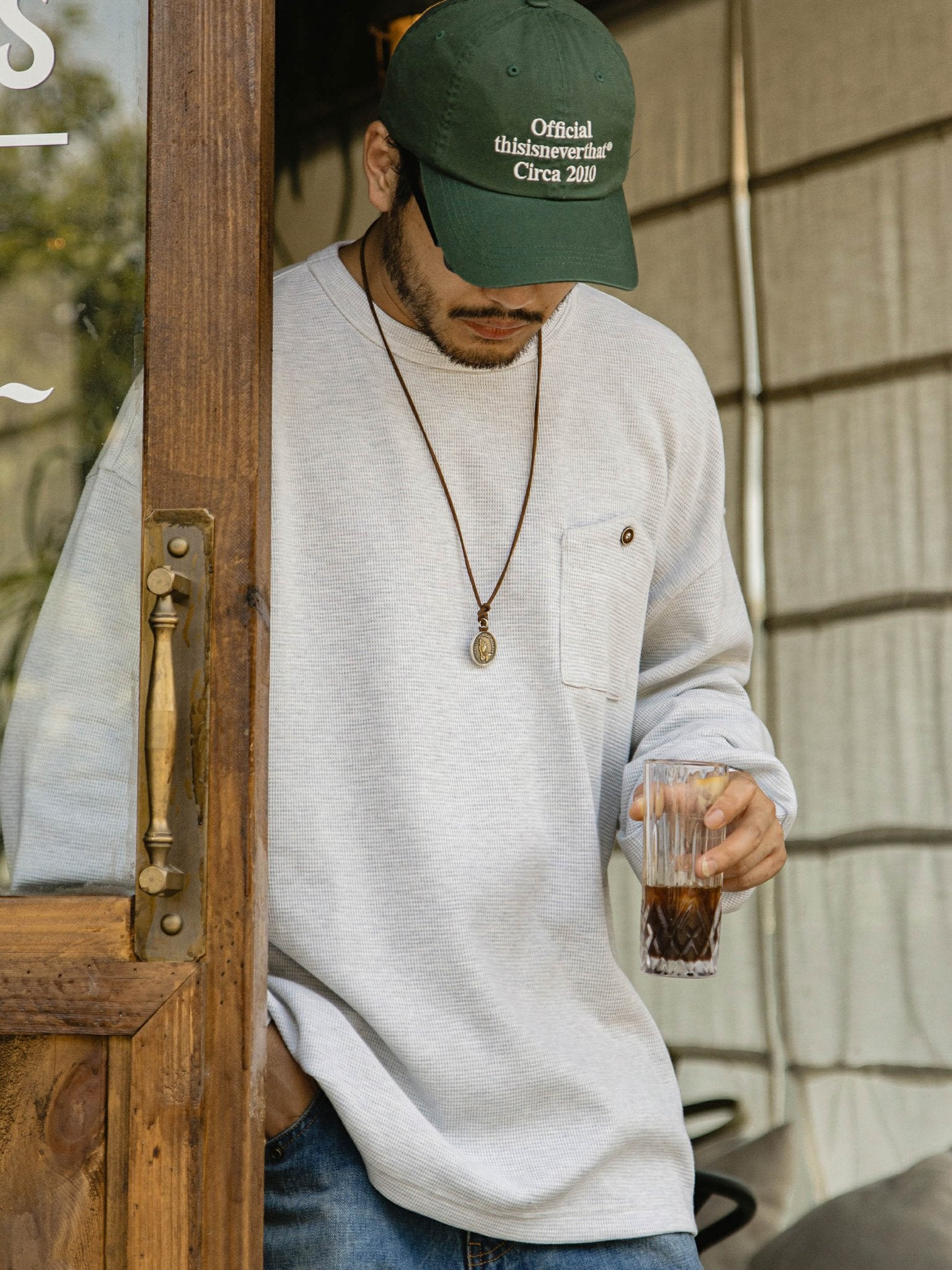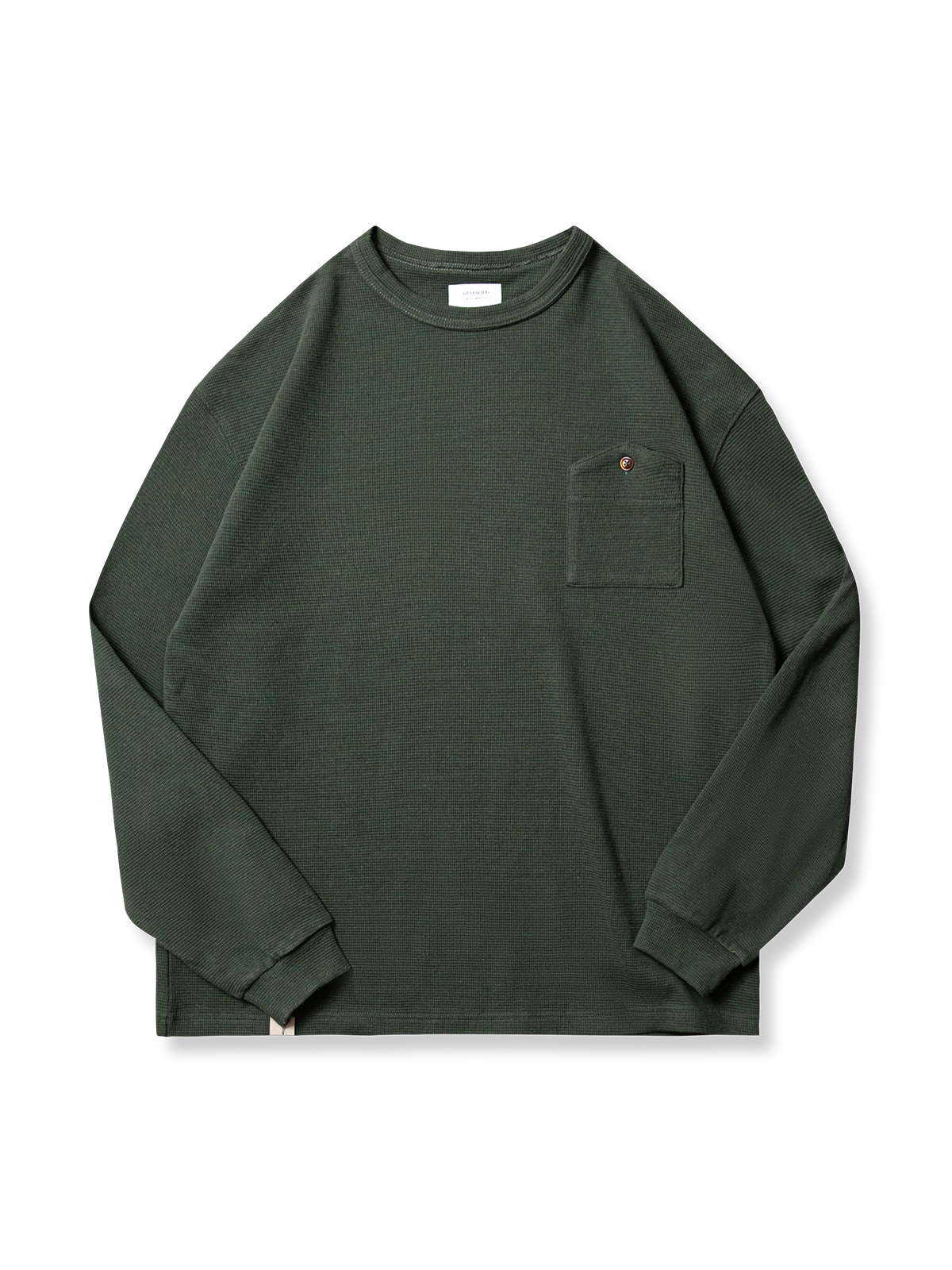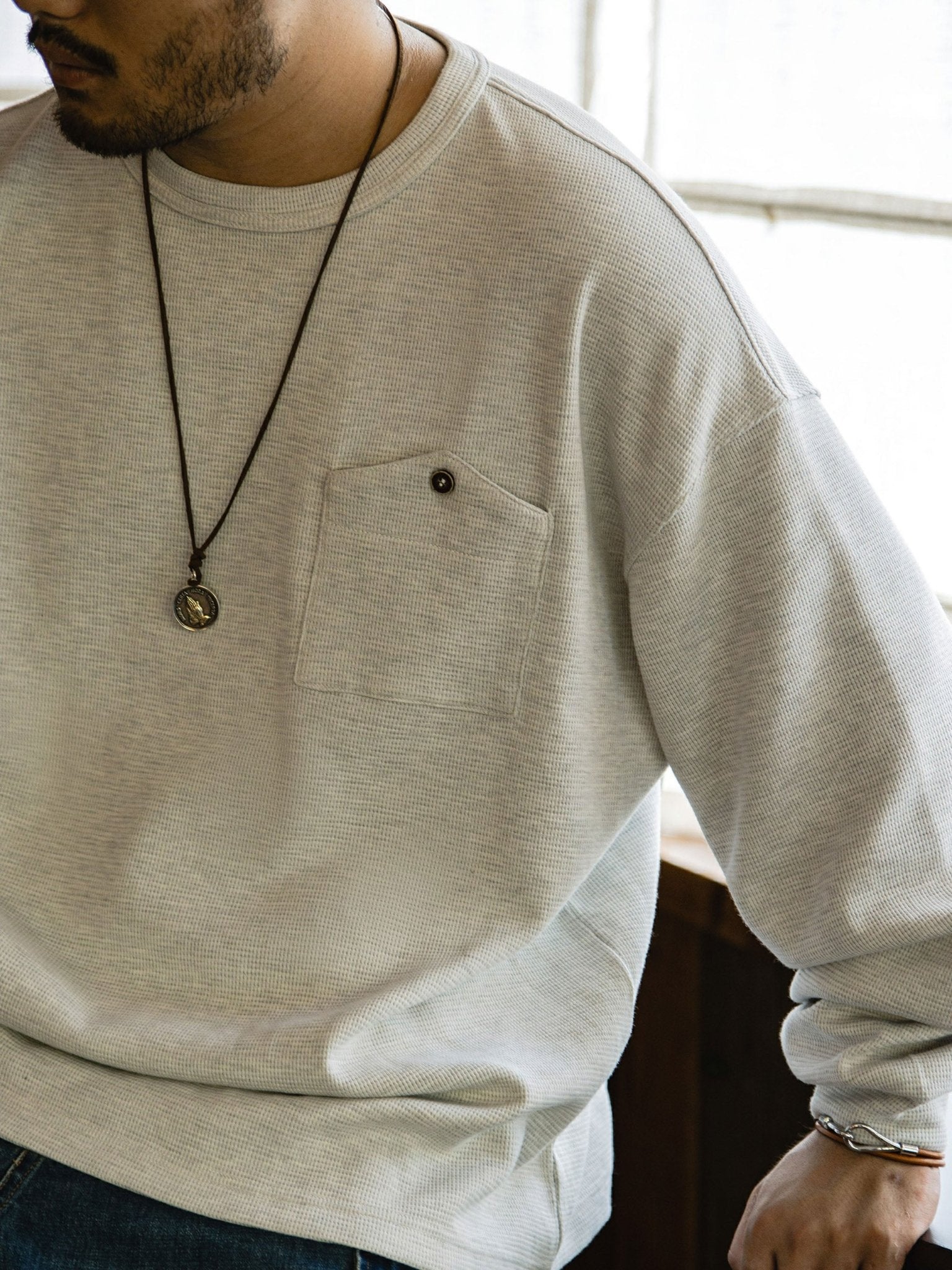 ワッフル柄ベーシックモデルの2色長袖スウェット。23AWの最初のアイテムとしてワッフル柄を選んだ理由の1つは、その独特な織り技術にあります。
