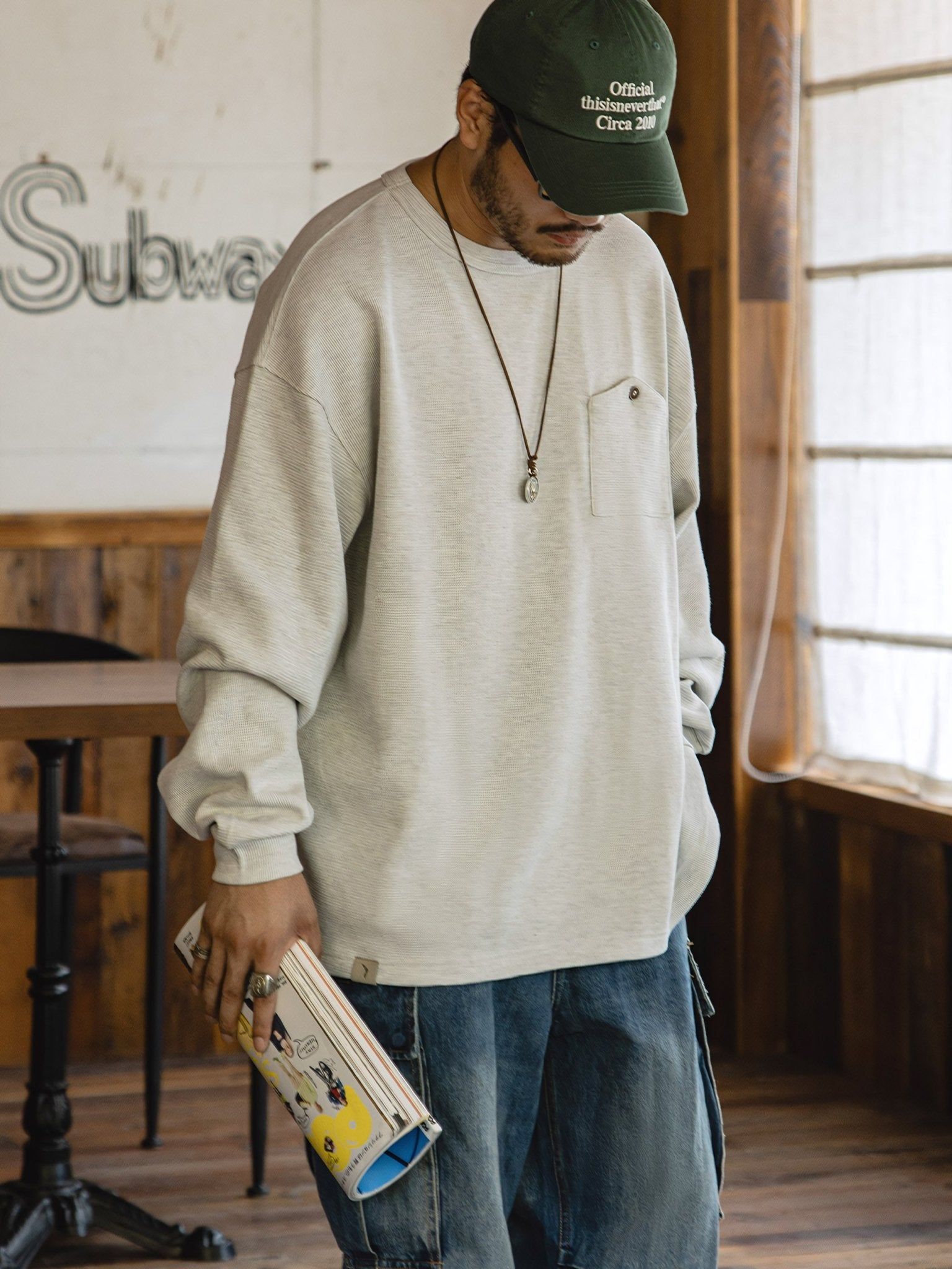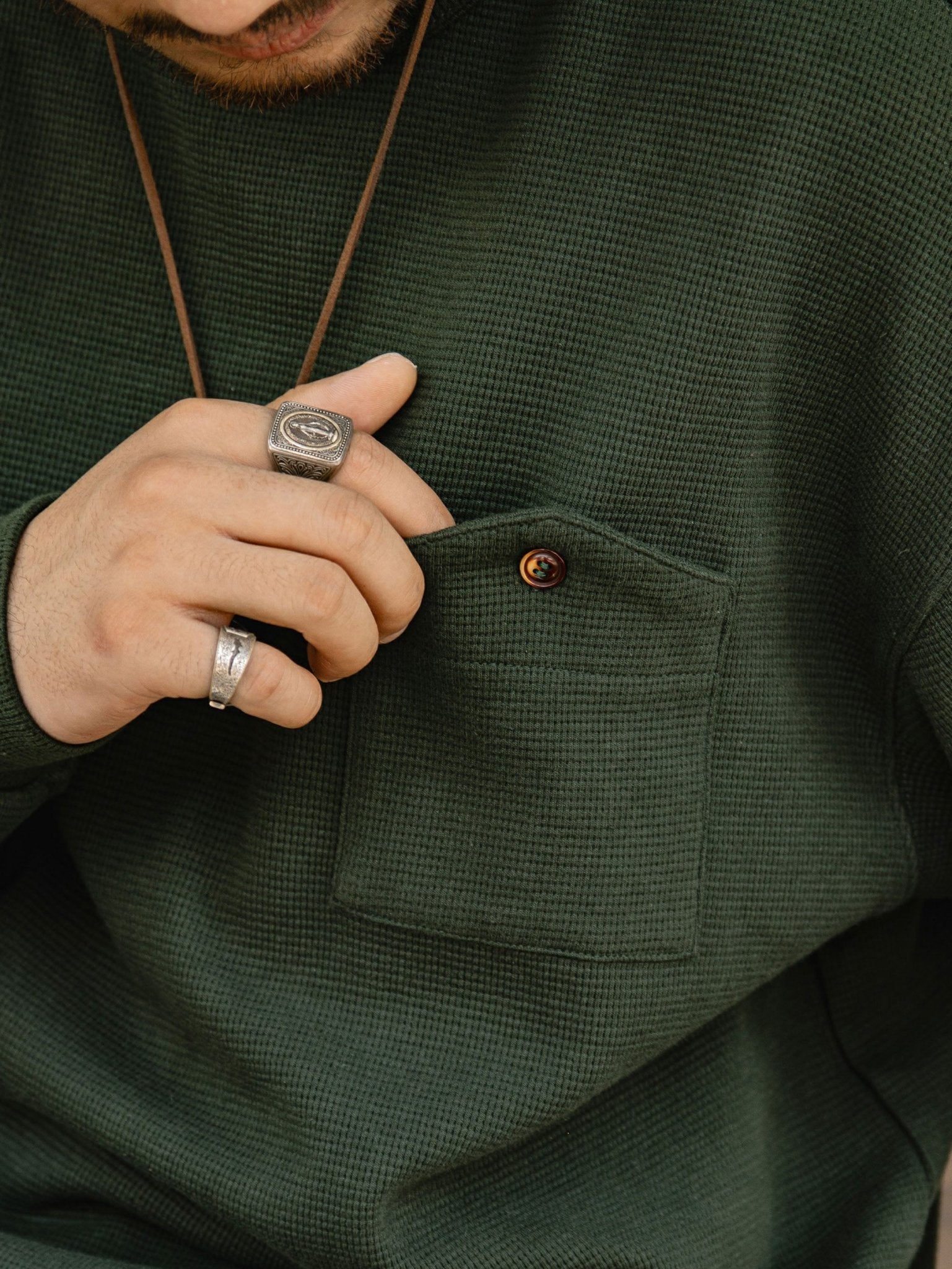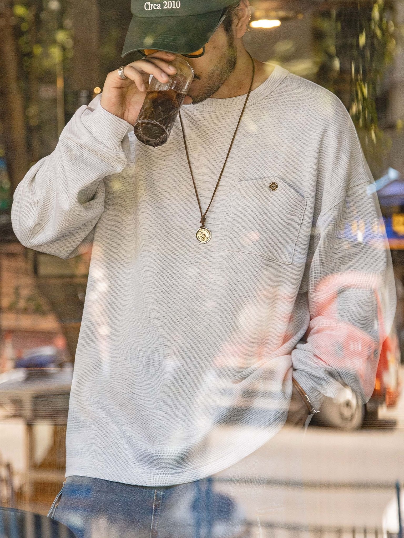 ワッフル柄ベーシックモデルの2色長袖スウェット。23AWの最初のアイテムとしてワッフル柄を選んだ理由の1つは、その独特な織り技術にあります。