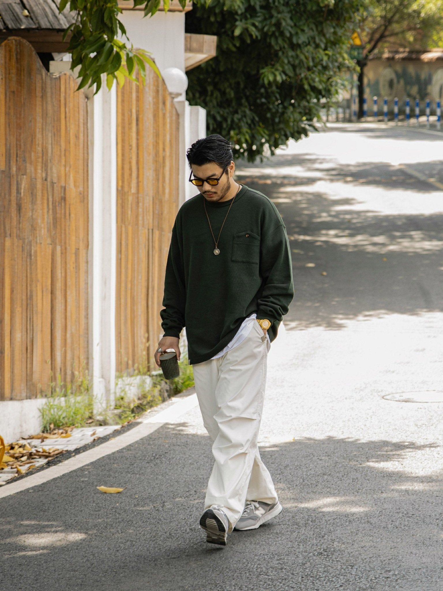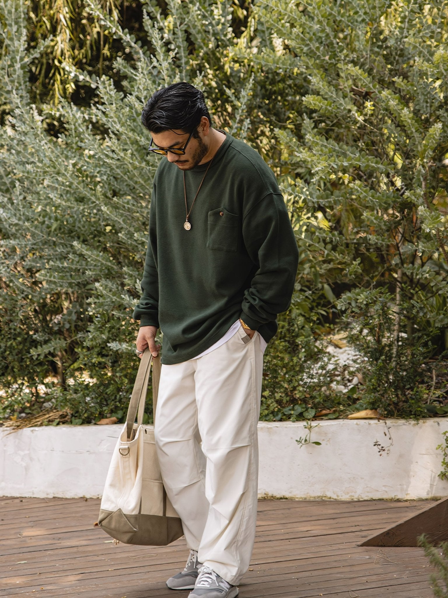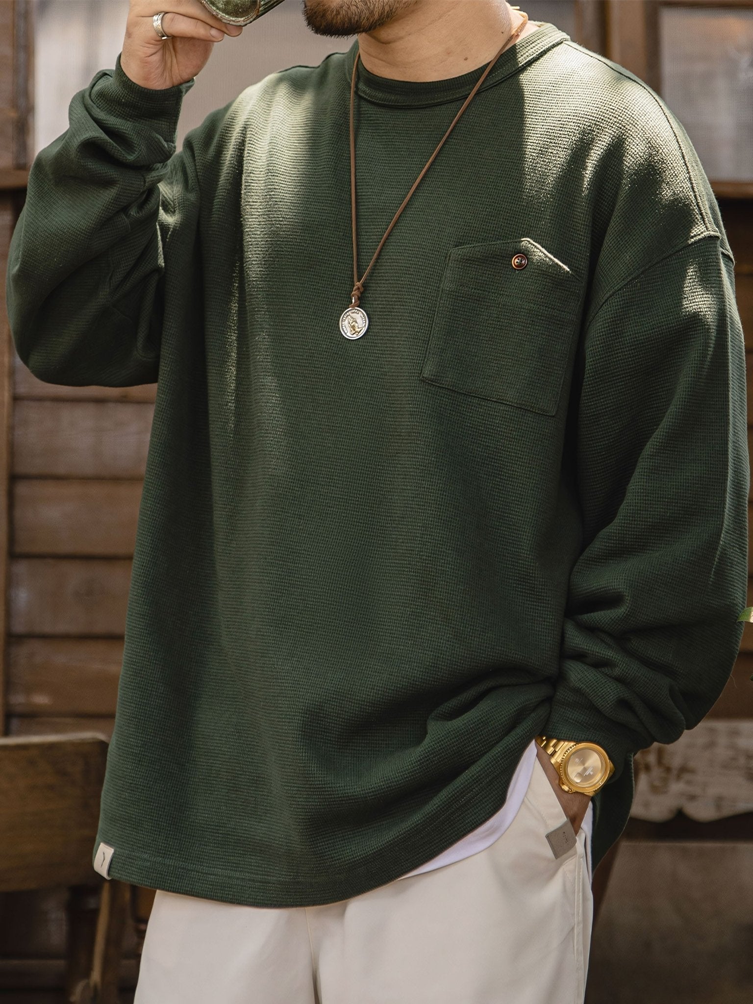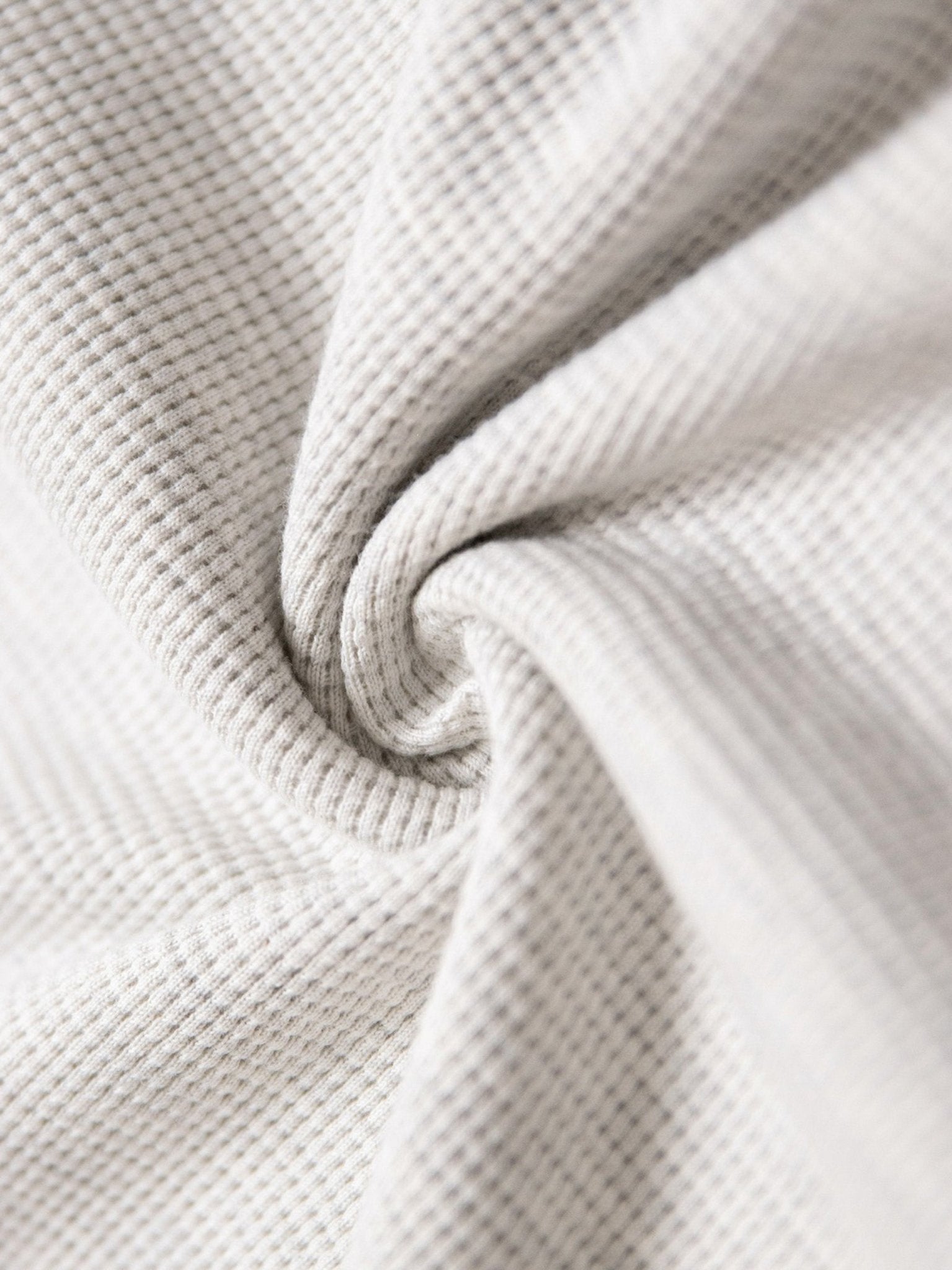 オーバーサイズのデザインで、340gのワッフル生地を使用。一般のコットンに比べて優れた落ち感があり、袖口が積み重なっても自然に垂れるなど、袖の形状を維持できます。