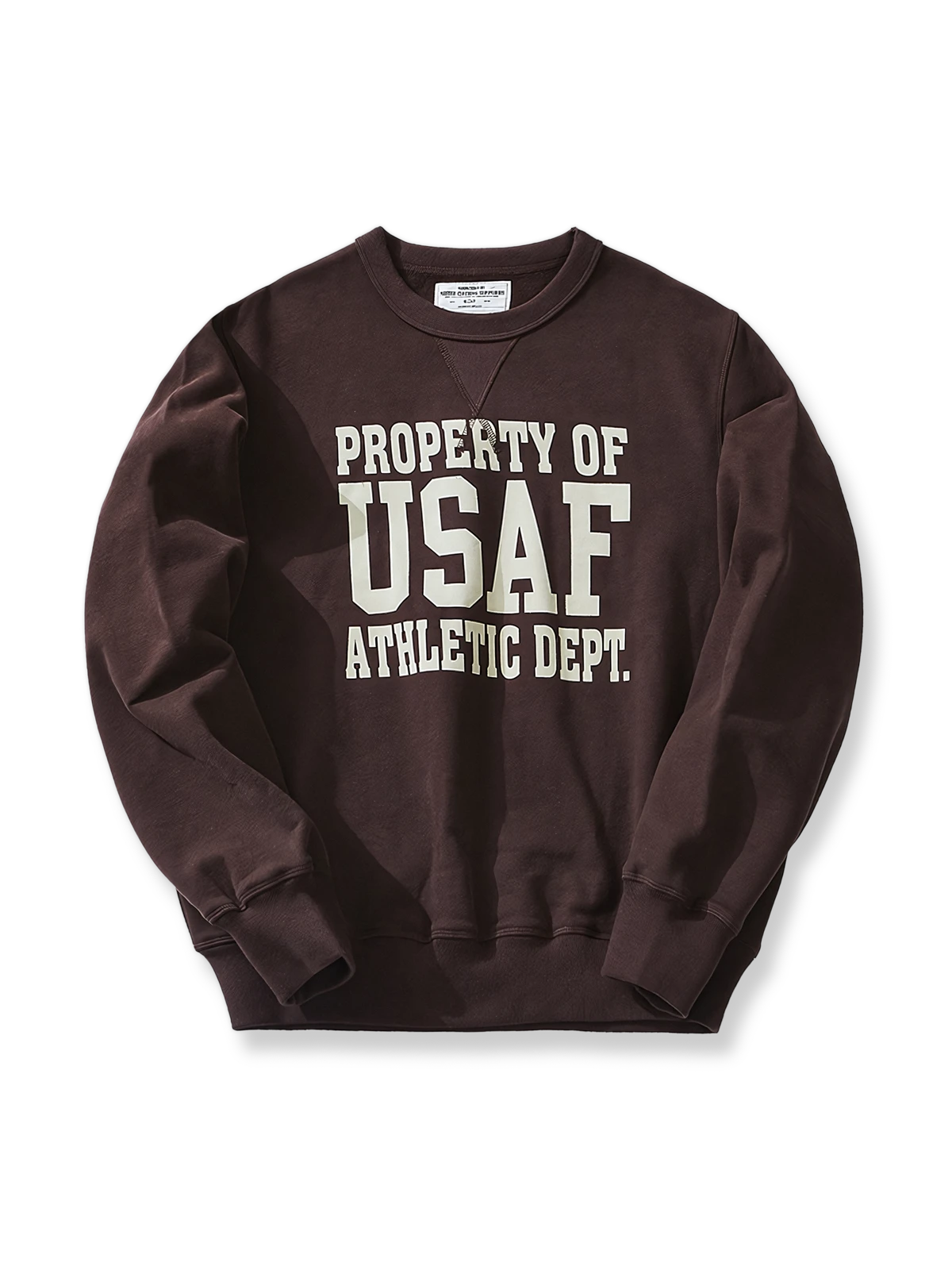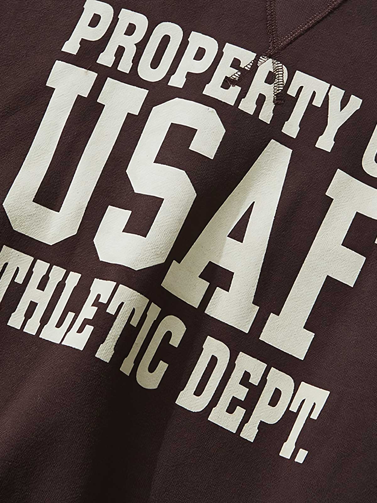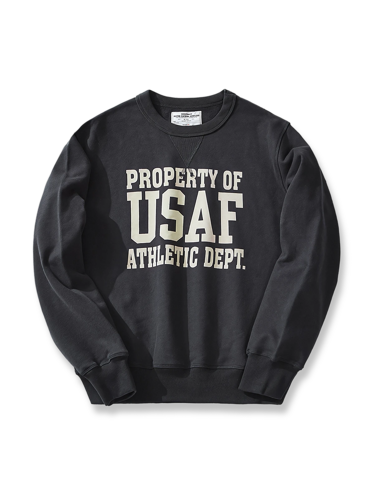 このスウェットは、アメリカ空軍(USAF)のクラシックな要素を取り入れており、レタリングプリントがレトロな軍事アカデミースタイルを演出しています。このようなデザインは、しばしばチーム精神の表現や軍事歴史への敬意として使用され、現在のストリートウェアにおけるレトロやミリタリースタイルの流行傾向にも合致しています。