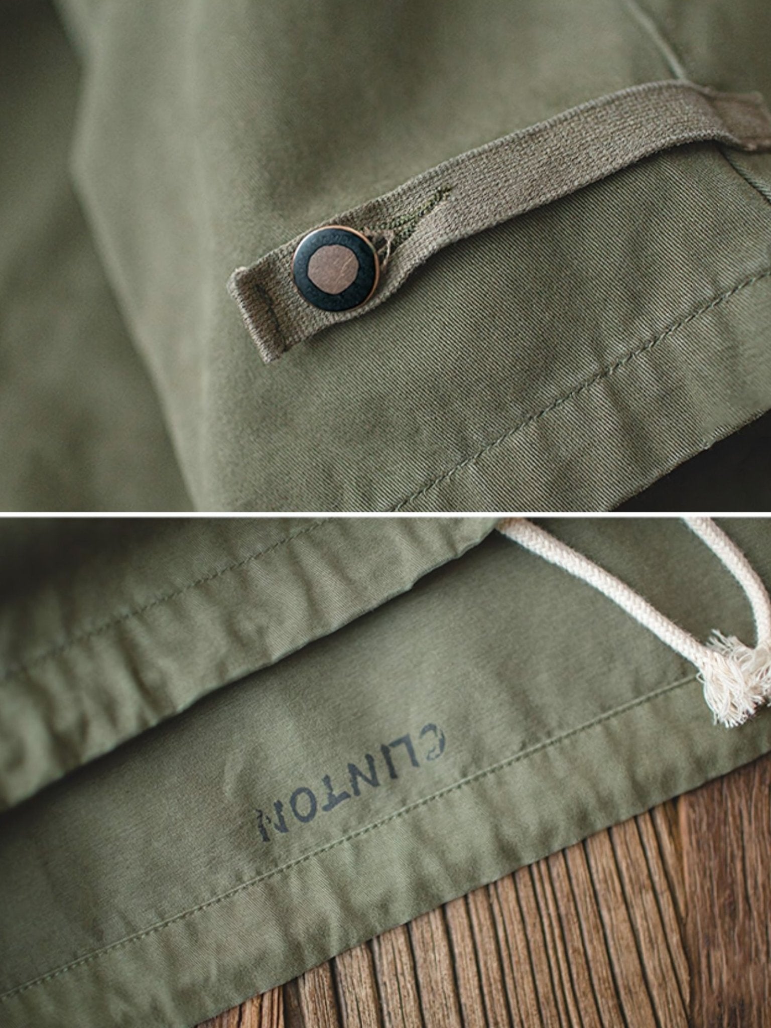 細部にわたる配慮が感じられるディテールが特徴です。抽紐デザインの襟ぐりやレトロなボタンなど、細部のデザインは実用性とスタイルを両立させています。