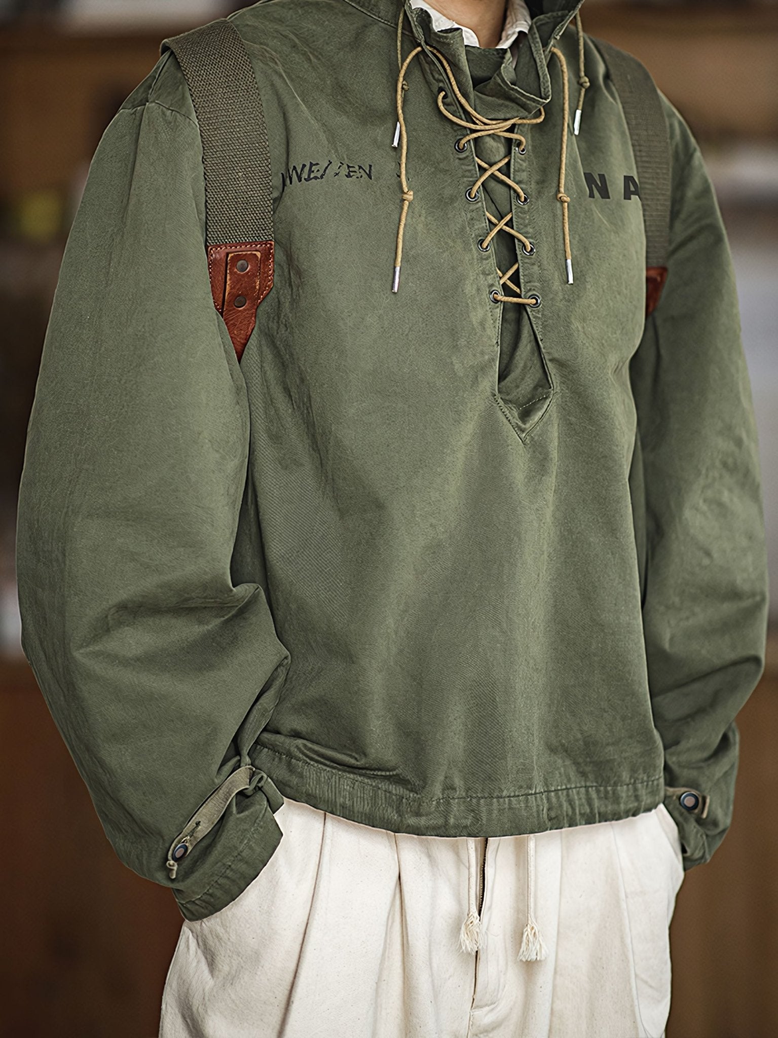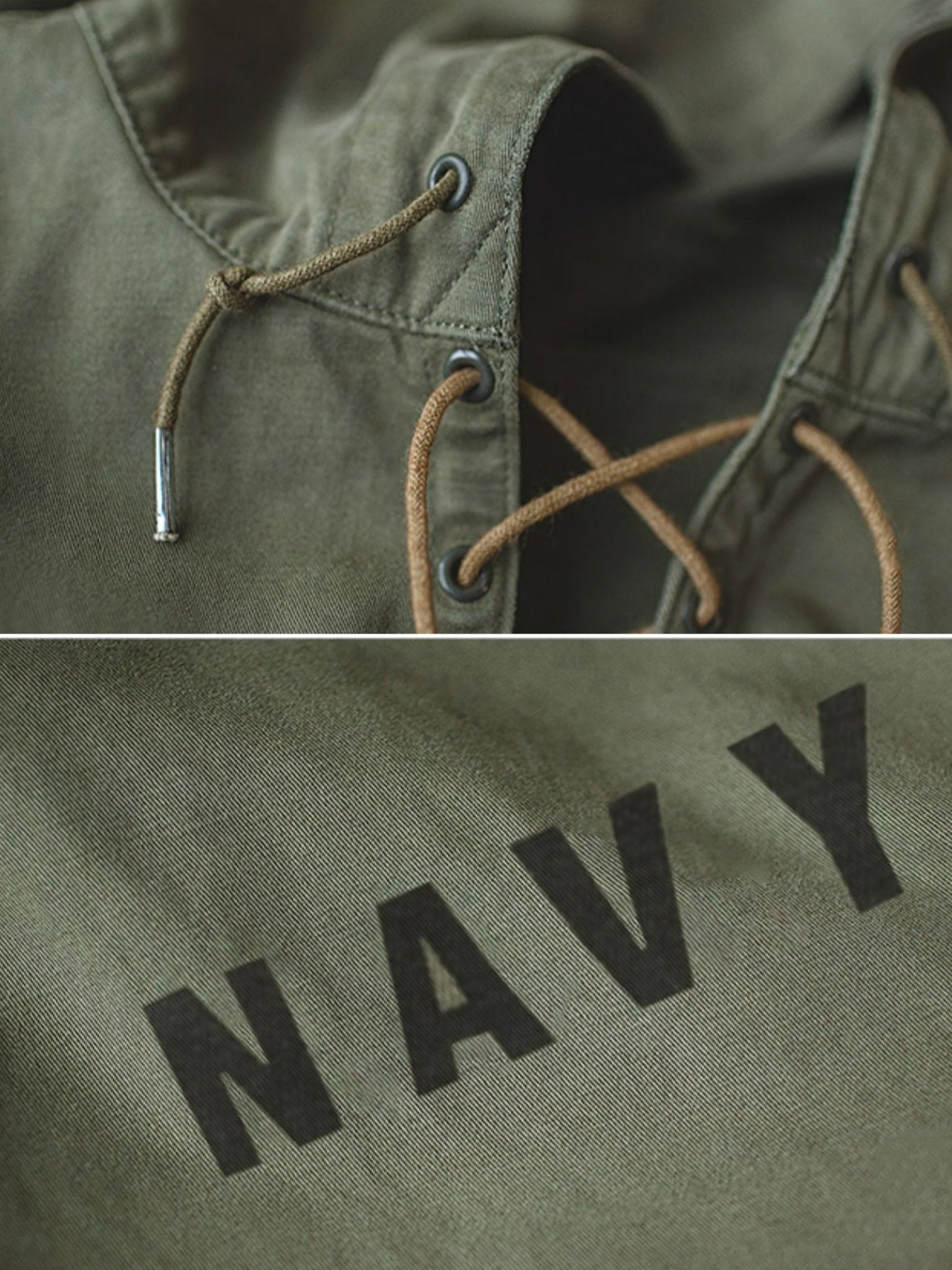 このレトロなデッキジャケットは、活動の便宜性を考慮してゆったりとしたカットが施されています。着脱を容易にするため、襟ぐりは調節可能な紐デザインが採用されています。ボタンには、使用中の摩耗と酸化を模倣したレトロな効果のある赤銅色が使用されています。