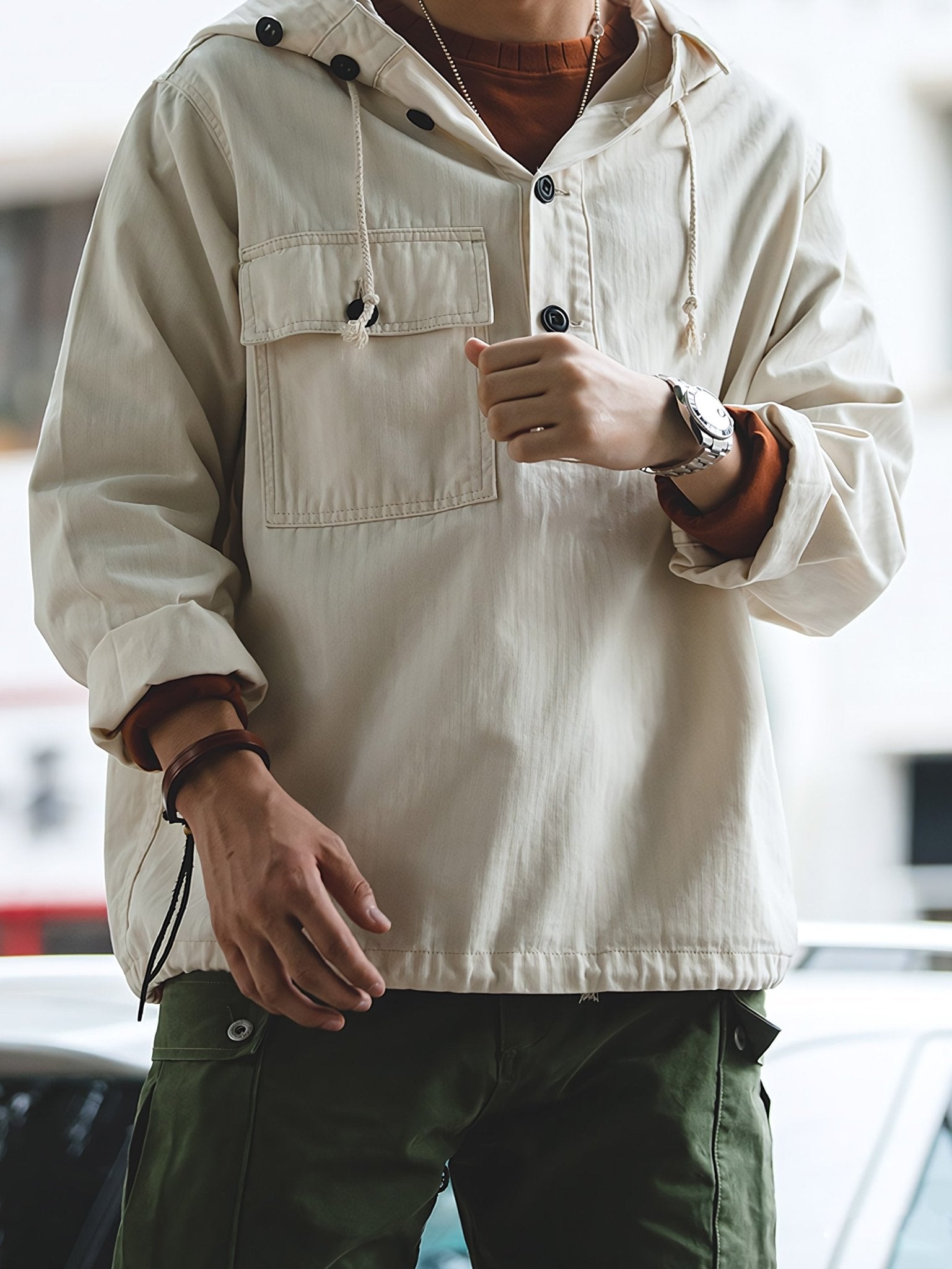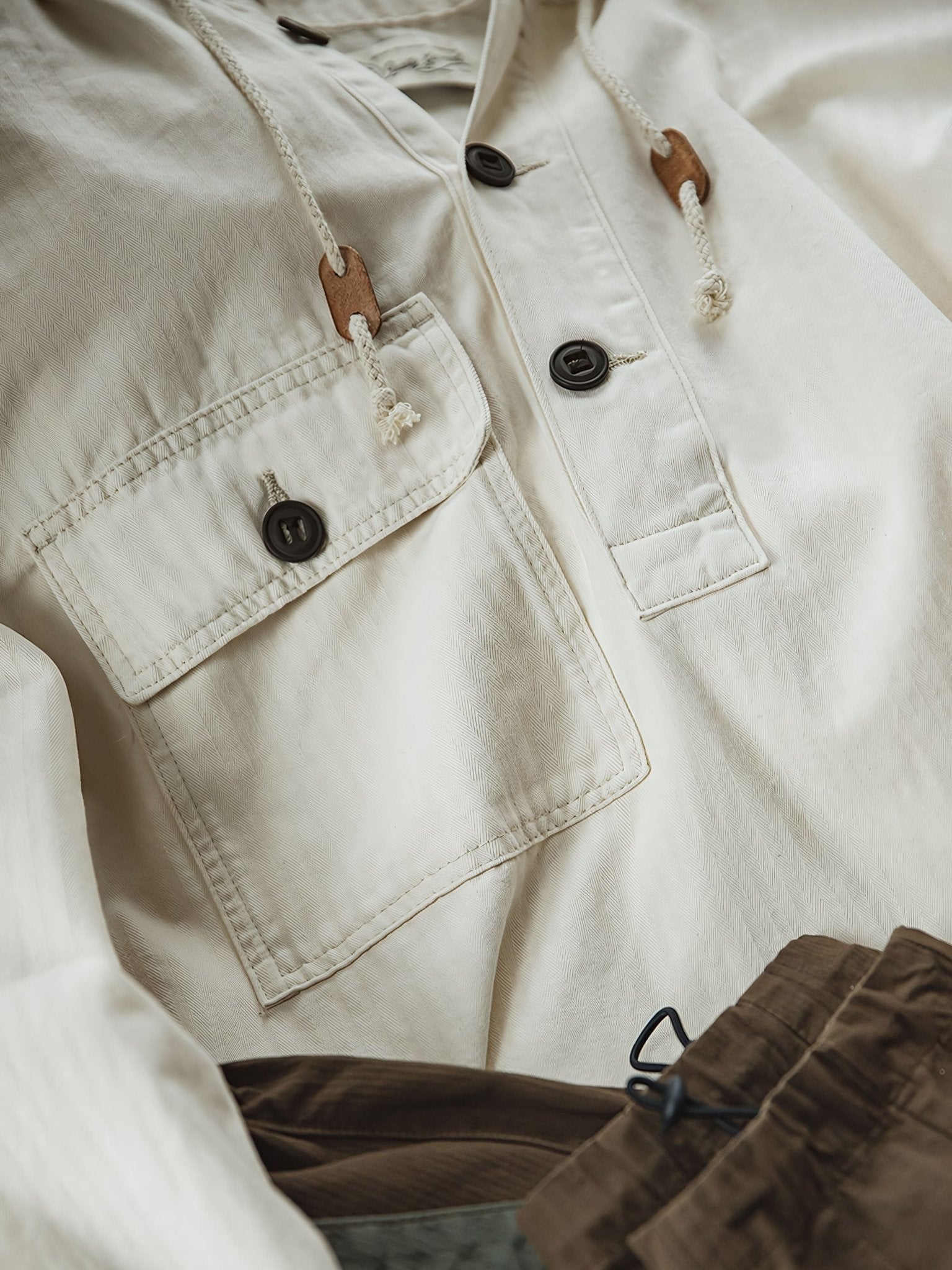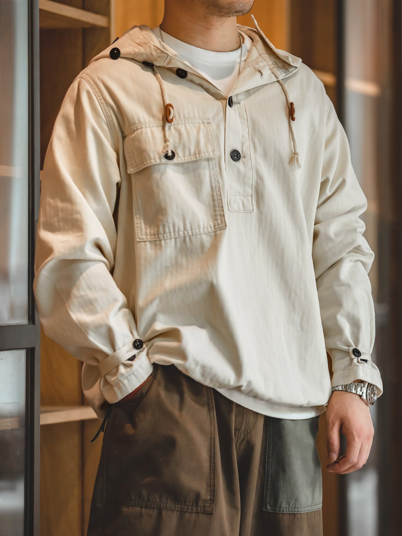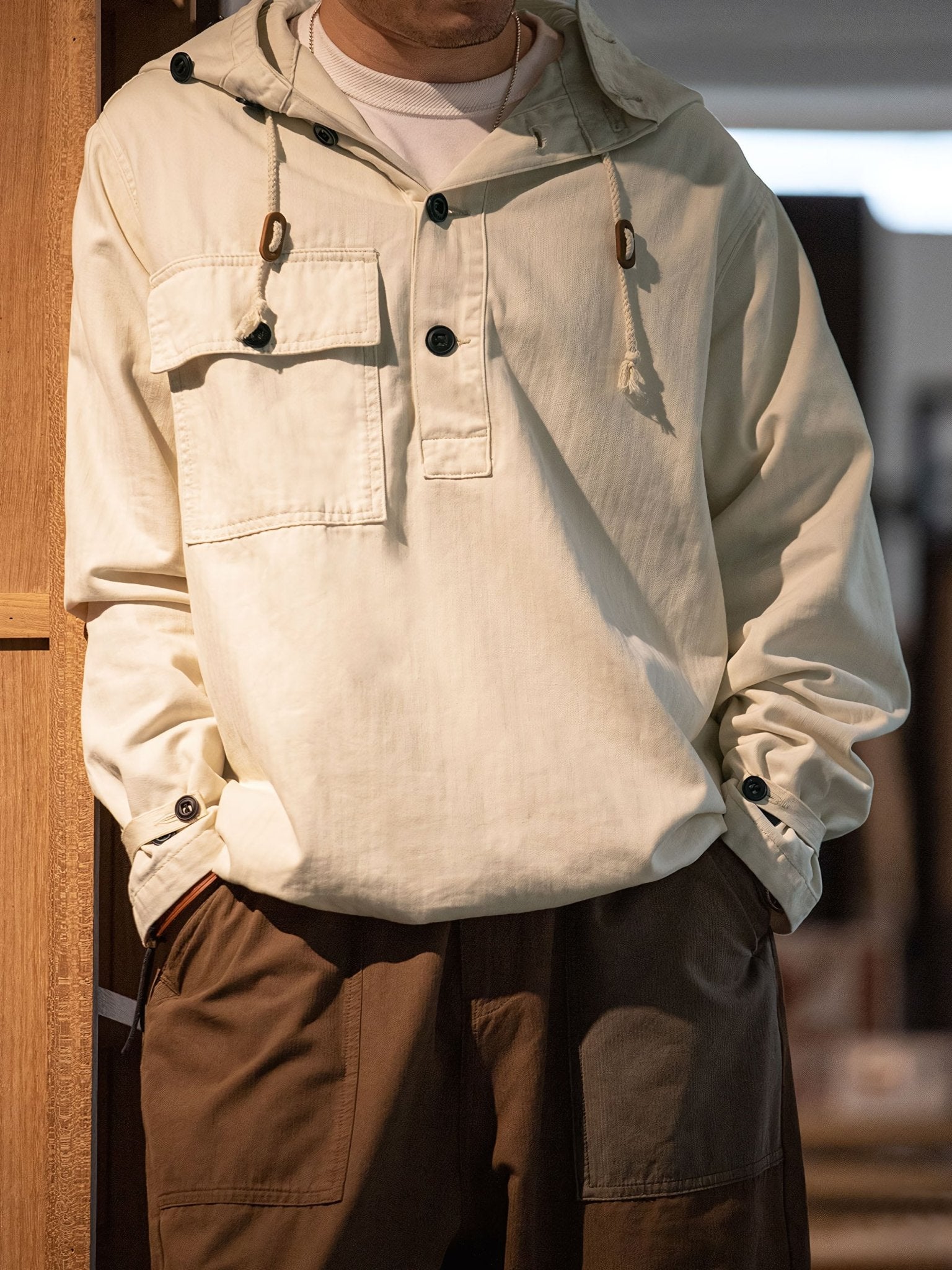 特徴的なヘンリーネック風のボタンデザインがあり、シーンに合わせてスタイリングを楽しむことができます。白の無地をメインに採用し、フードもサルベージパーカーを基にデザインされています。