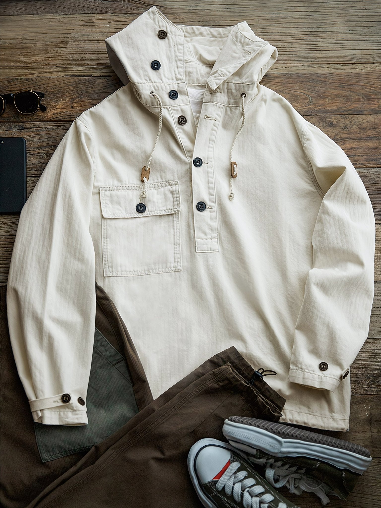 このアイテムは、アメリカ海軍の作業用パーカーをモチーフにしたミリタリーサルベージフード付きパーカーです。