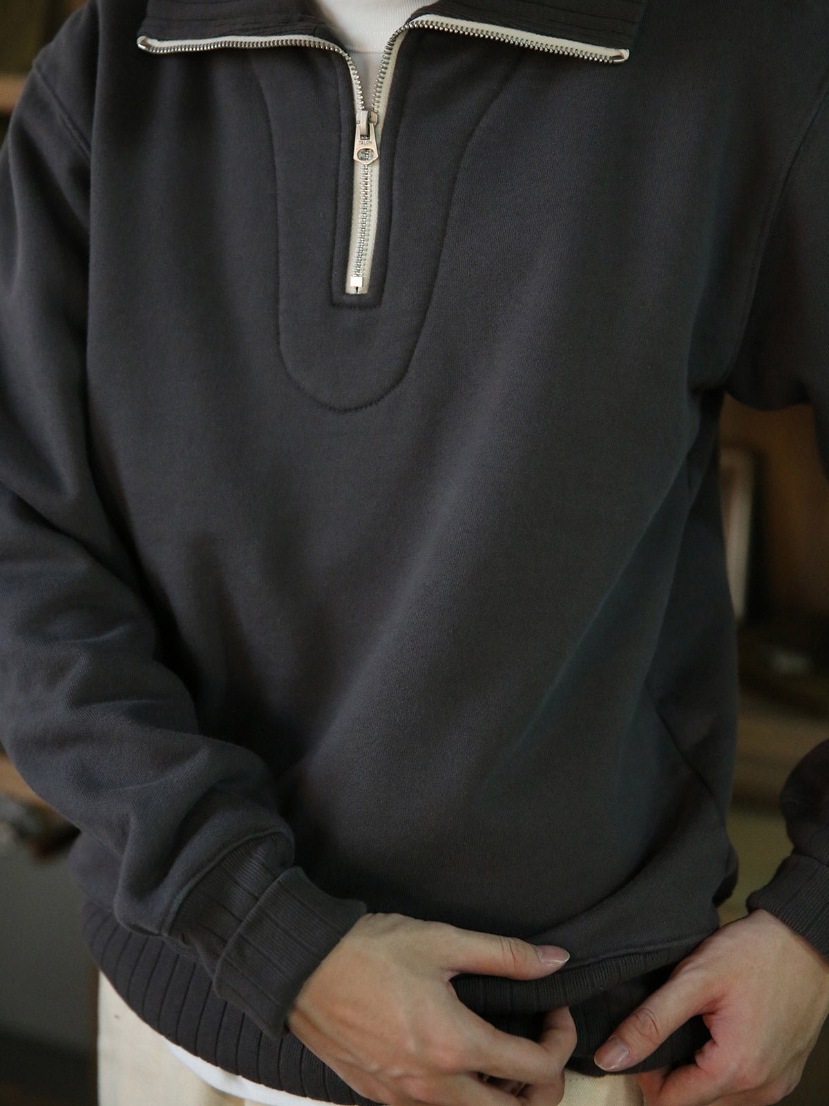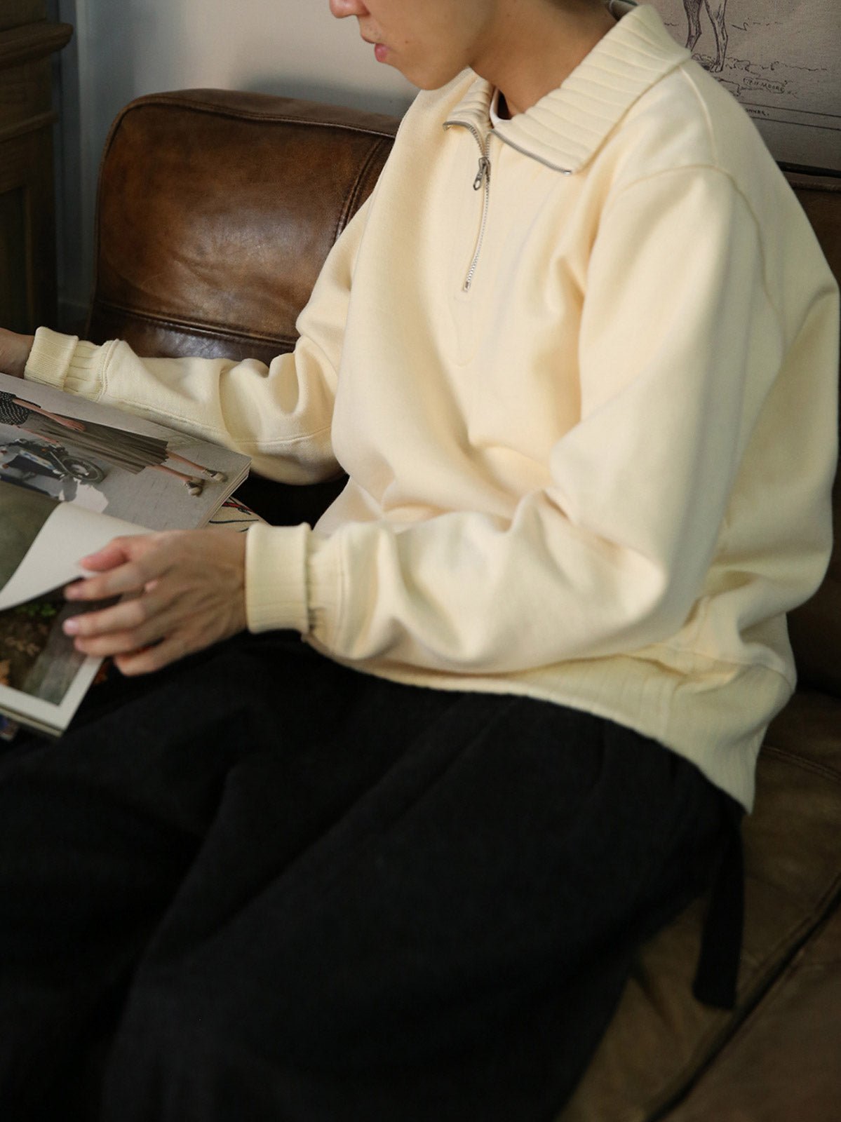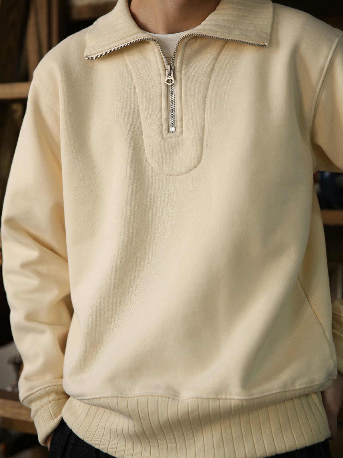 630gのコットン素材を選択しており、この素材は手触りが厚く、質感がしっかりしており、耐久性と洗濯耐性に優れています。色調は柔らかく暖かい視覚感を与え、半ジップデザインはカジュアルで便利な雰囲気を演出し、品質とディテールへの重点を反映しています。