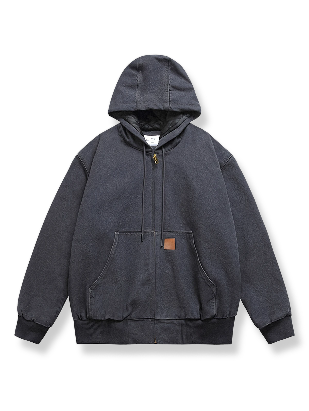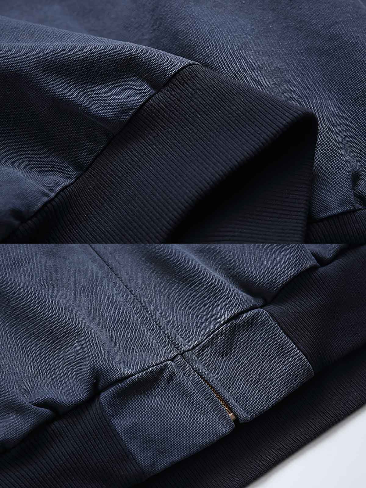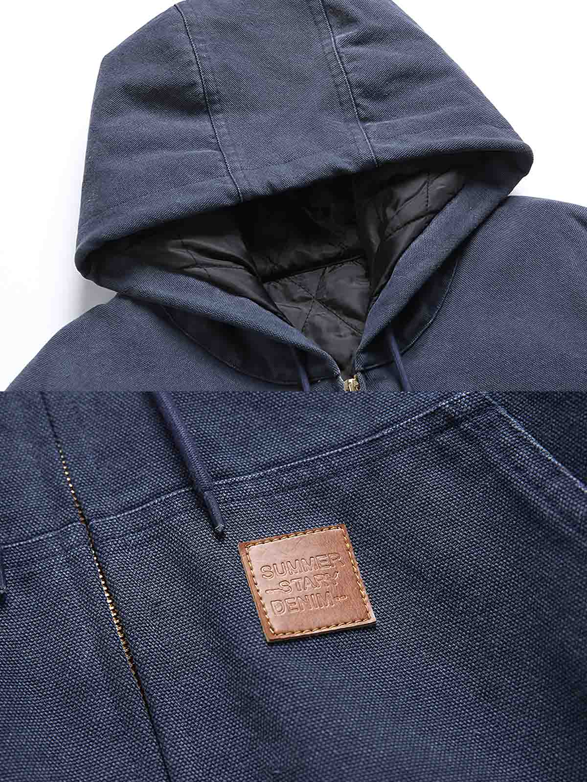 このジャケットはネイビーブルーを基調とし、デニムの粗野な質感を保持しつつ、都会的なカジュアルなファッションセンスを表現しています。内側には柔らかい裏地が付いており、保温性を高めています。フード付きのデザインは、変わりやすい屋外の気候に対応し、秋冬の理想的な選択肢となっています。