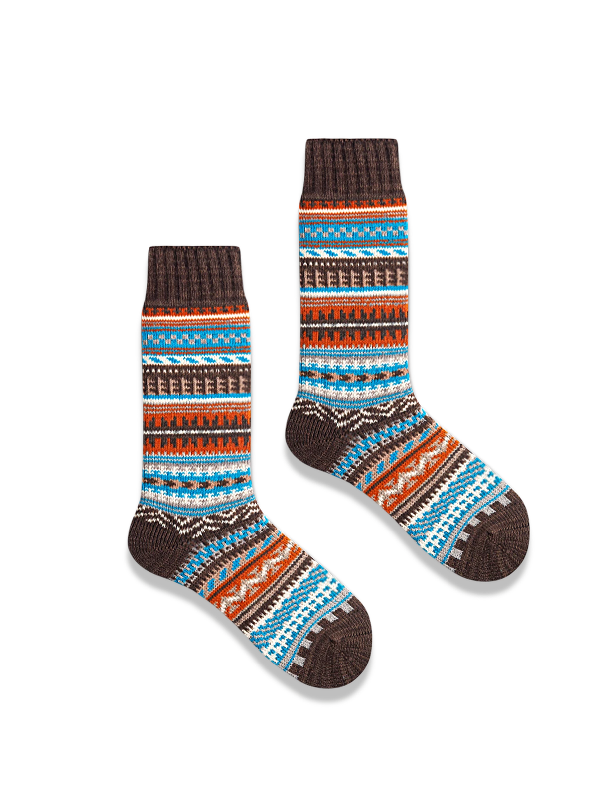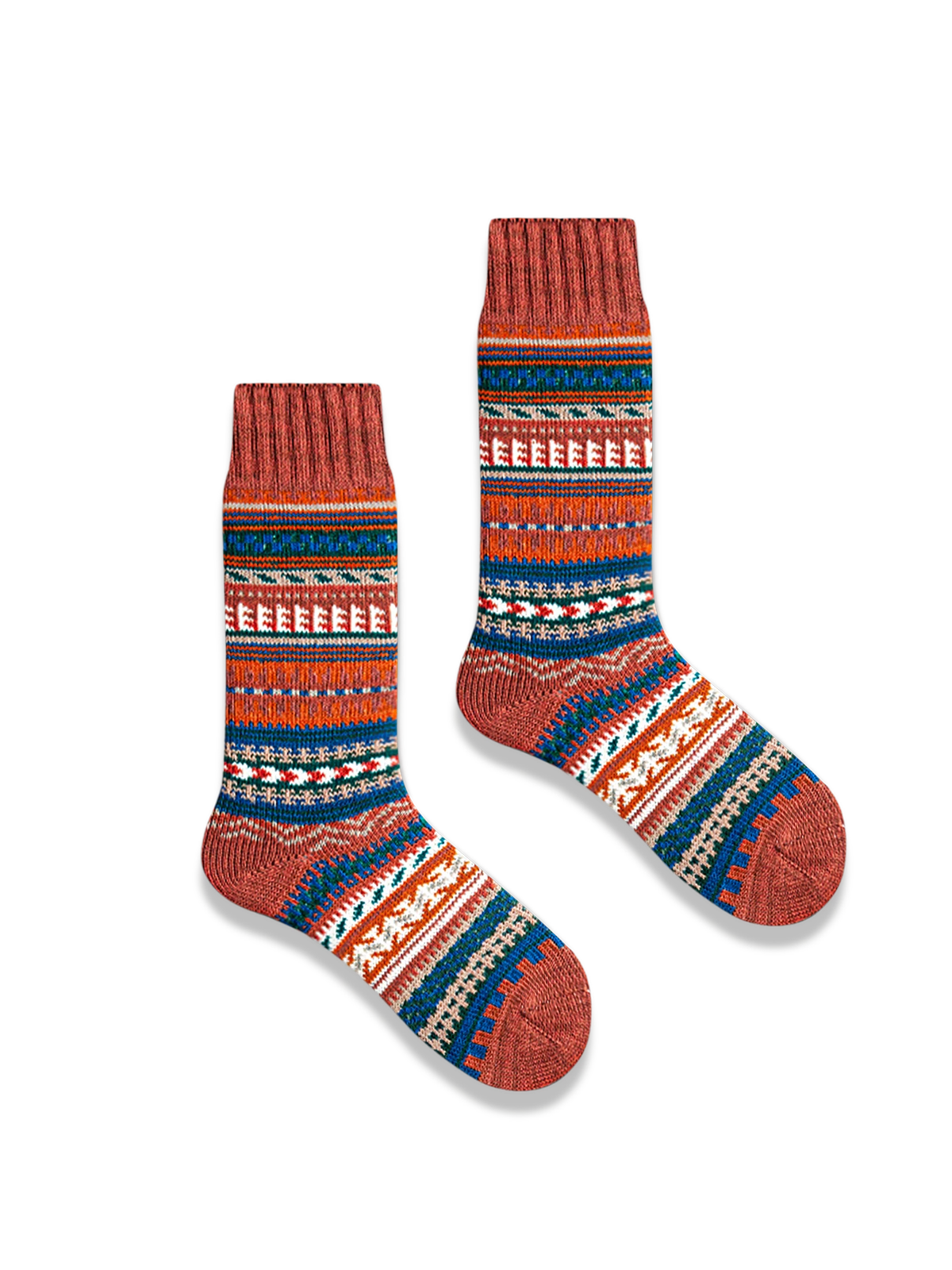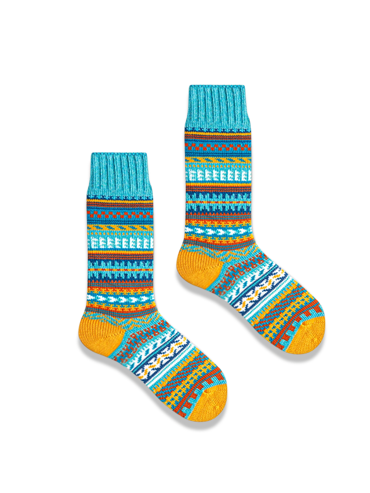 鮮やかな色合いの民族風デザインに、ソックスのつま先部分に対照的な色を加えることで、スタイリングに簡単にアクセントを加えることができます。ソックスの口元は厚めの弾力性を持たせ、ぴったりとフィットし、脚の形にしっかりと沿います。