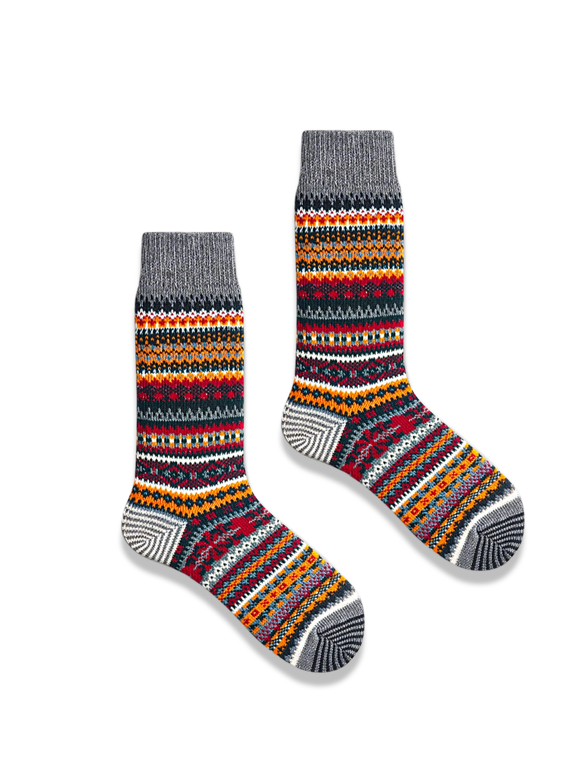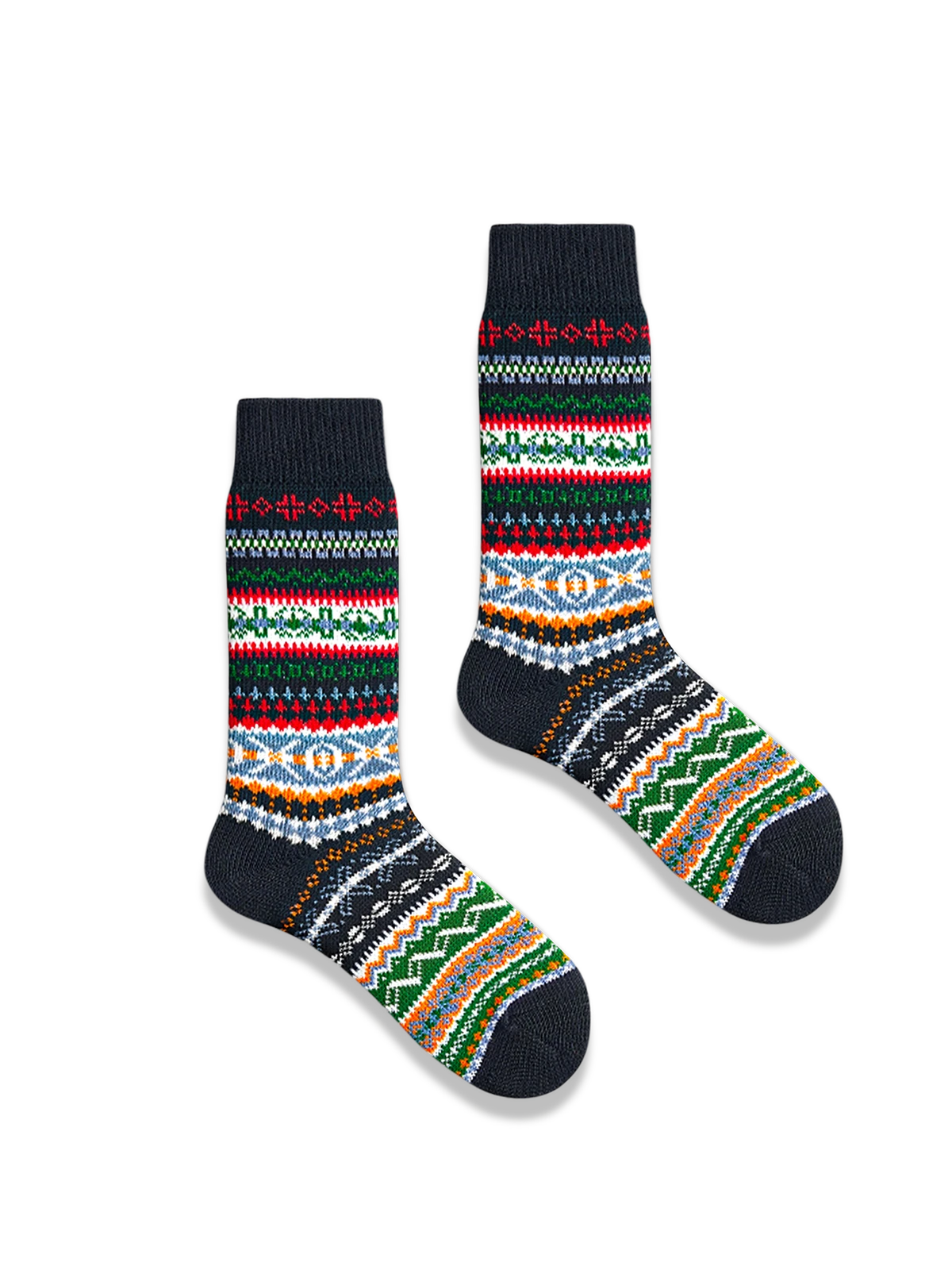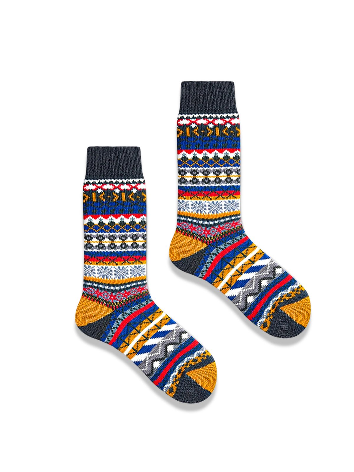 鮮やかな色合いの民族風デザインに、ソックスのつま先部分に対照的な色を加えることで、スタイリングに簡単にアクセントを加えることができます。ソックスの口元は厚めの弾力性を持たせ、ぴったりとフィットし、脚の形にしっかりと沿います。