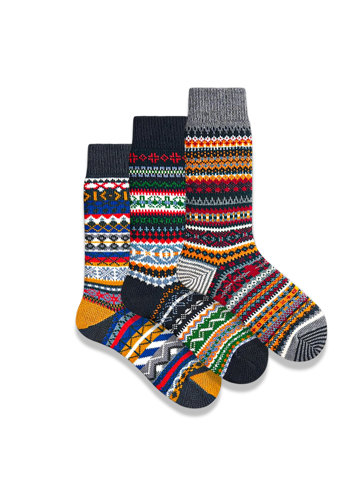 鮮やかなエスニック柄と対照色つま先、厚手コットン素材の快適フィットソックス3足セット