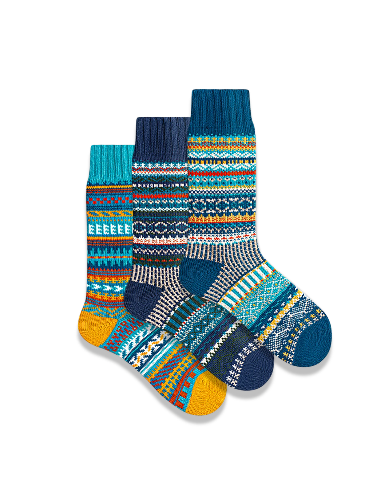 鮮やかなエスニック柄と対照色つま先、厚手コットン素材の快適フィットソックス3足セット
