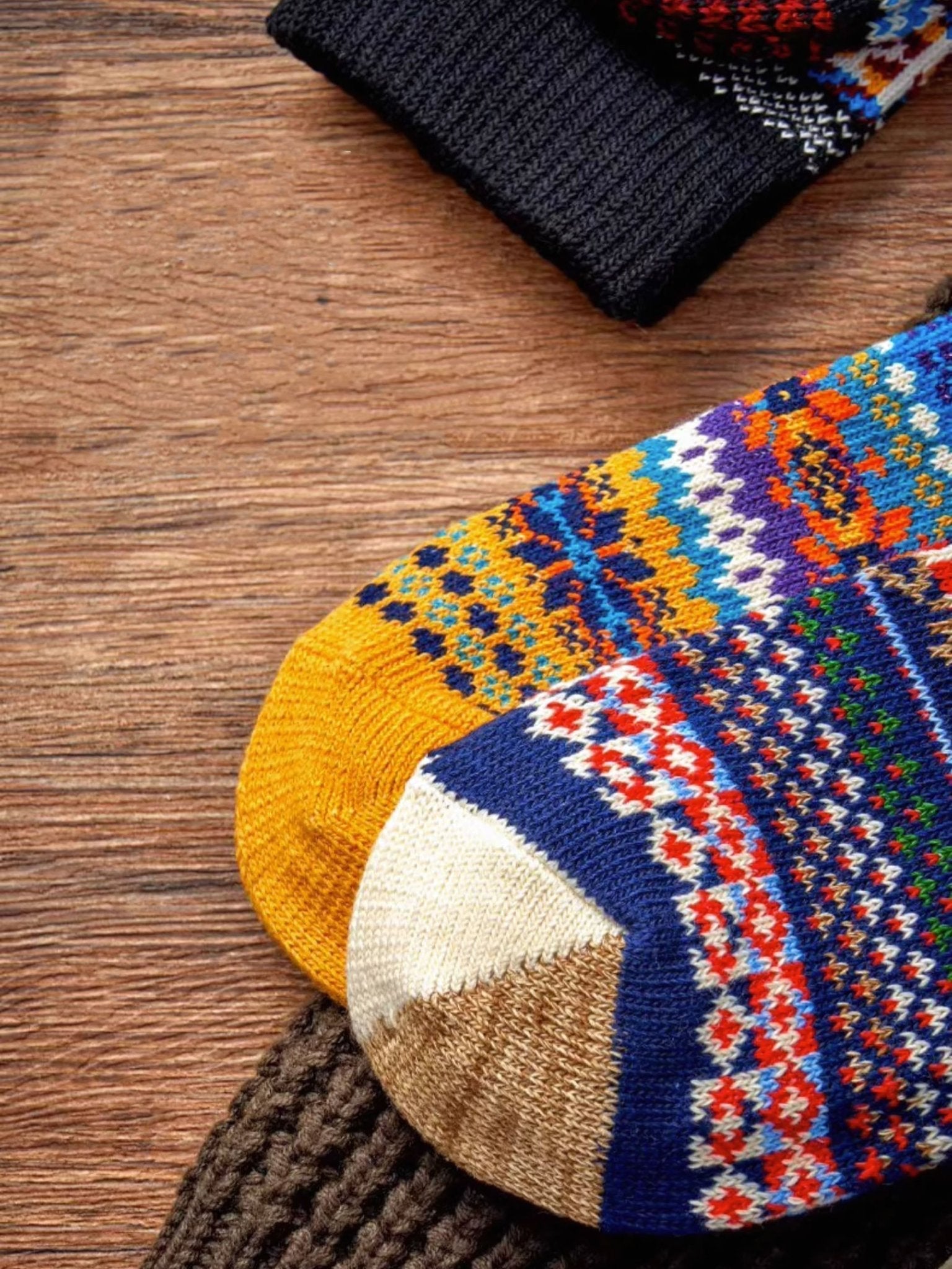 鮮やかな色合いの民族風デザインに、ソックスのつま先部分に対照的な色を加えることで、スタイリングに簡単にアクセントを加えることができます。ソックスの口元は厚めの弾力性を持たせ、ぴったりとフィットし、脚の形にしっかりと沿います。