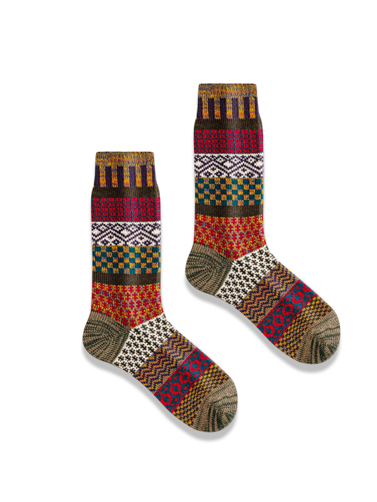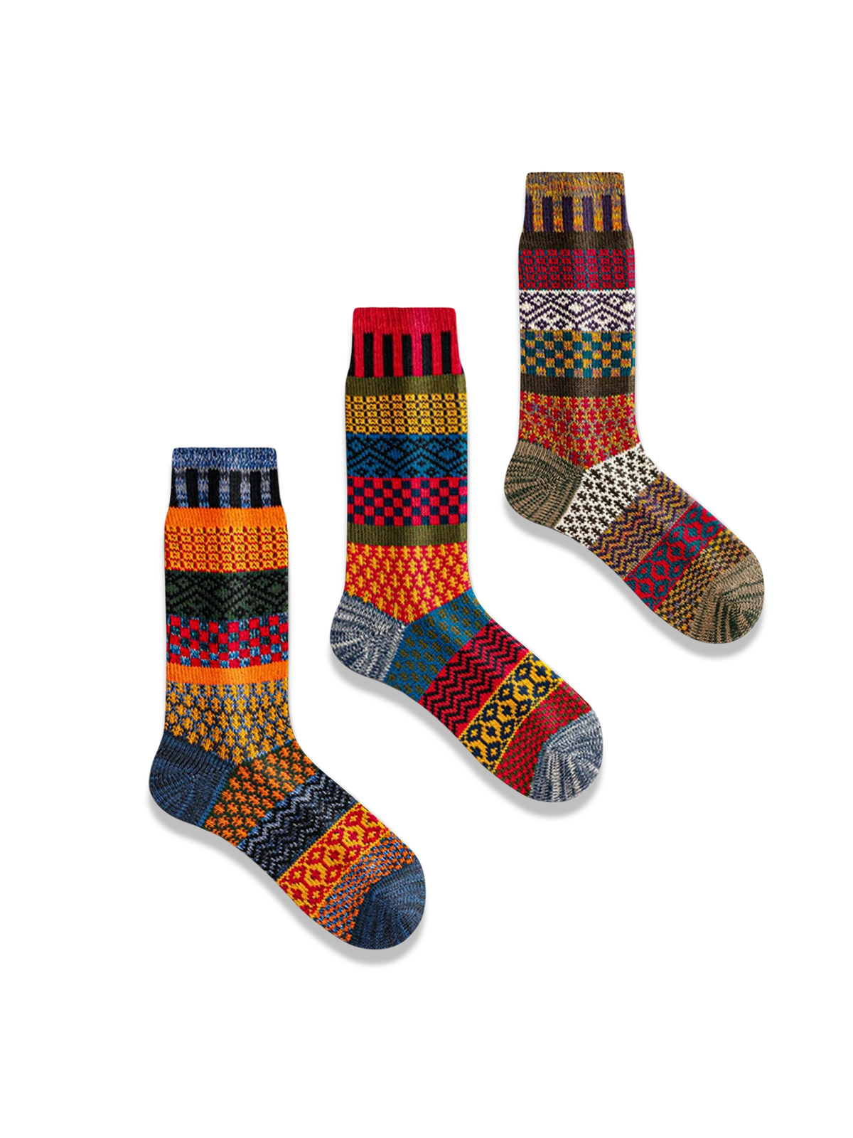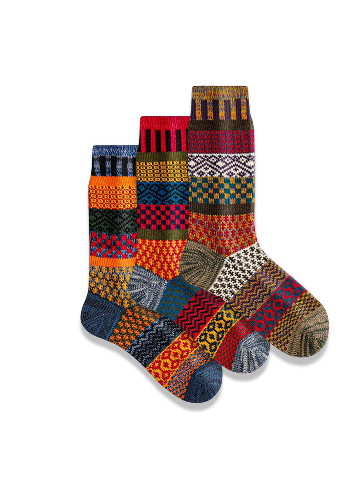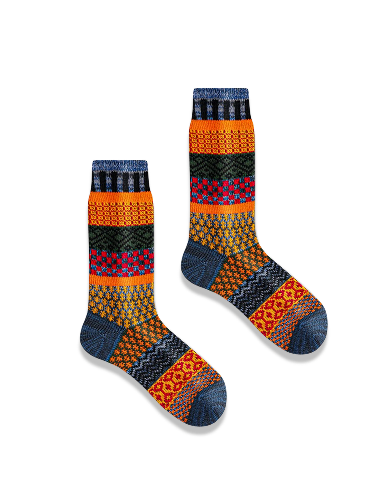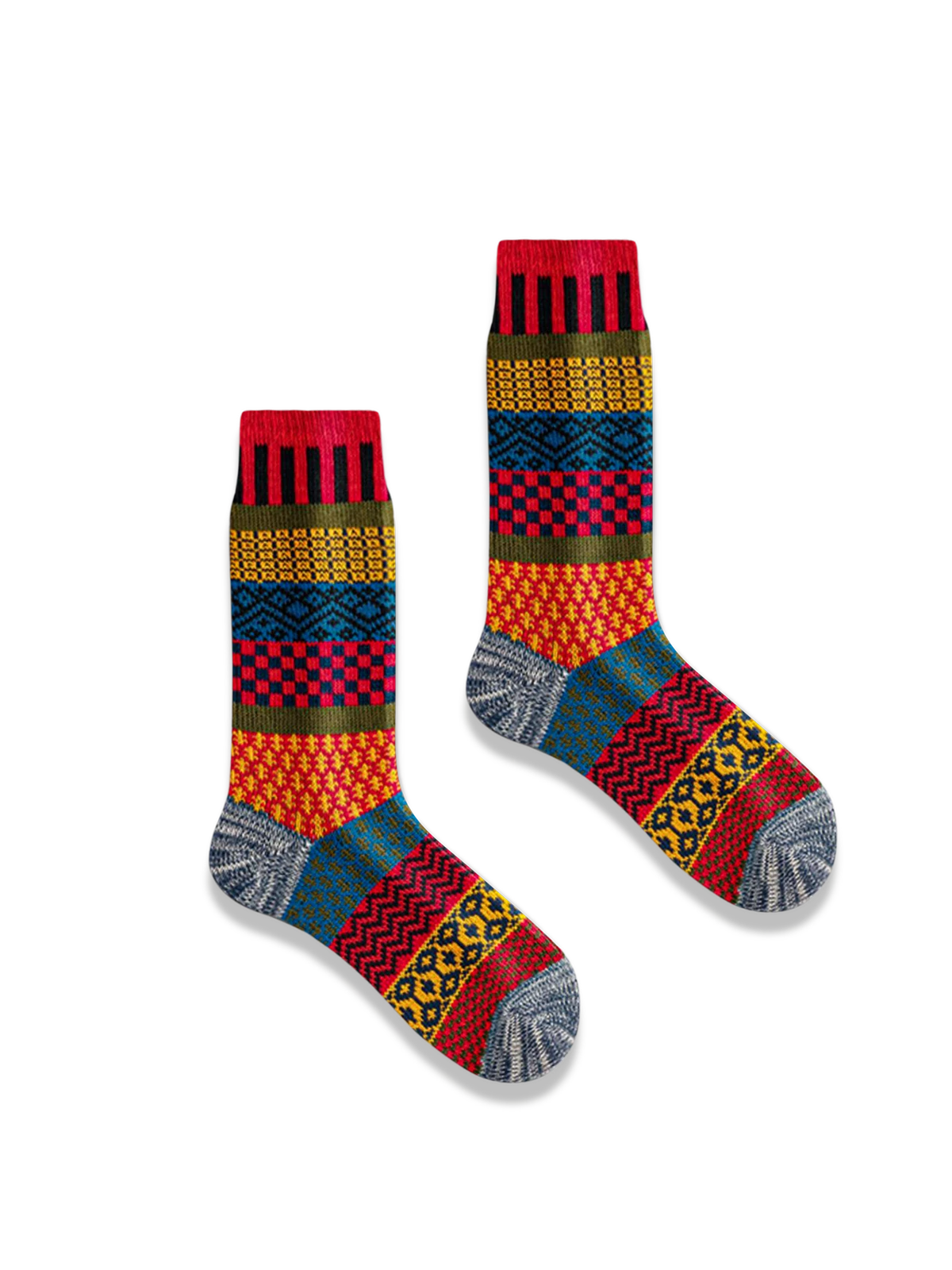 鮮やかな色合いの民族風デザインに、ソックスのつま先部分に対照的な色を加えることで、スタイリングに簡単にアクセントを加えることができます。ソックスの口元は厚めの弾力性を持たせ、ぴったりとフィットし、脚の形にしっかりと沿います。