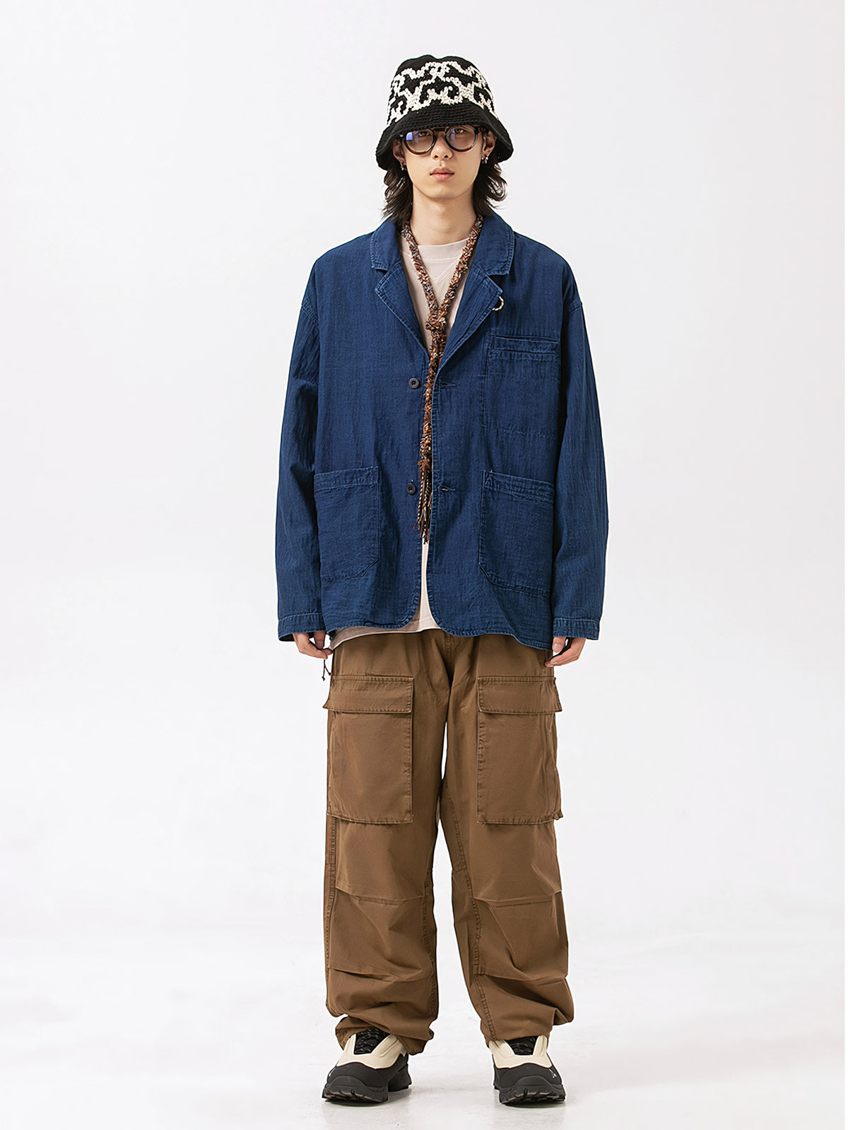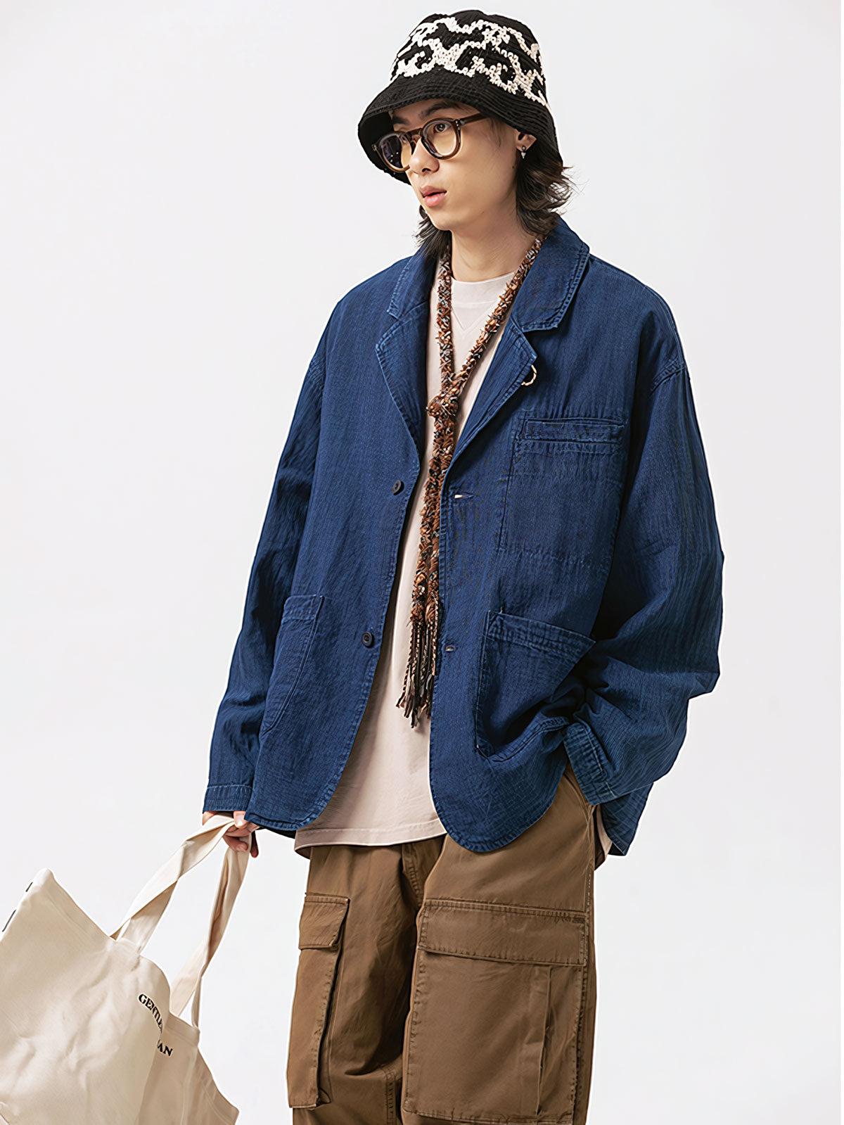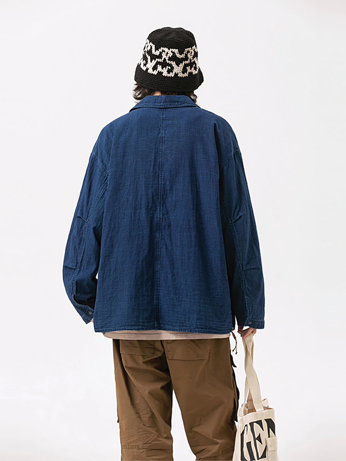 このジャケットは、クラシックなデニム素材を使用し、ノッチドラペルにコントラストの効いたデザインを取り入れ、シンプルながらも個性的なスタイルを演出します。背面に施された波模様のプリントは、繊細で独特なデザインで、着用者のセンスを引き立てます。加工を抑えたデニム素材を使用しており、着用と洗濯を繰り返すことで色合いが徐々に変化し、長く楽しめる一着です。肌に優しく、通気性のある生地が快適な着心地を提供します。また、ゆったりとしたシルエットで、さまざまな体型にフィットしやすく、リラックスした着用感を実現します。クラシックなダブルポケットデザインにより、実用性とスタイリッシュさを兼ね備えています。