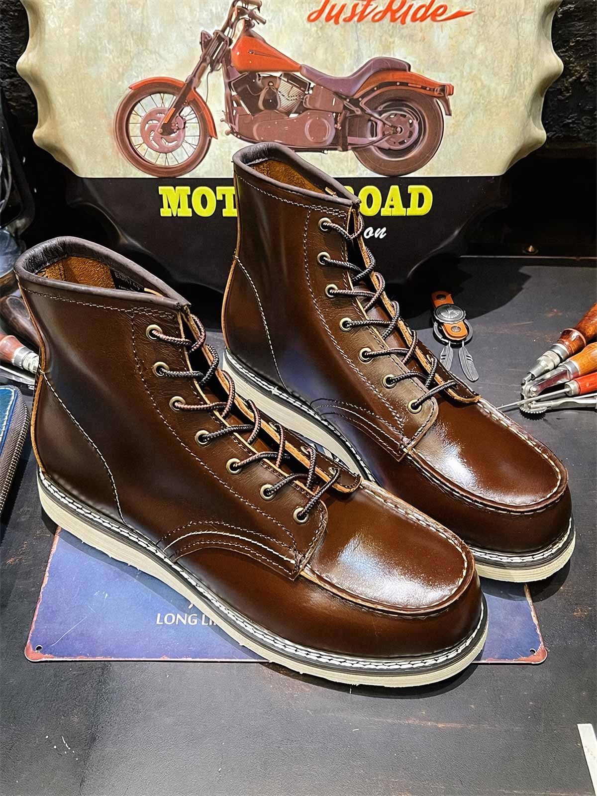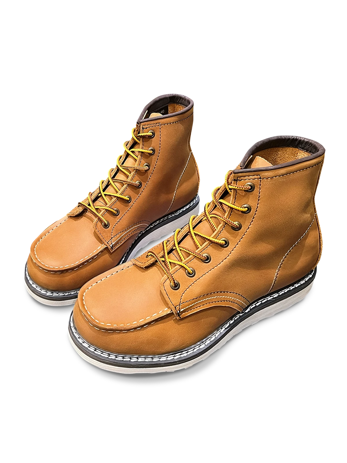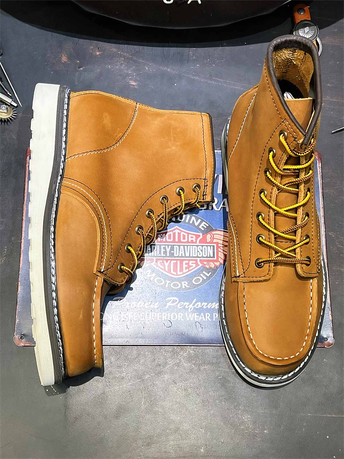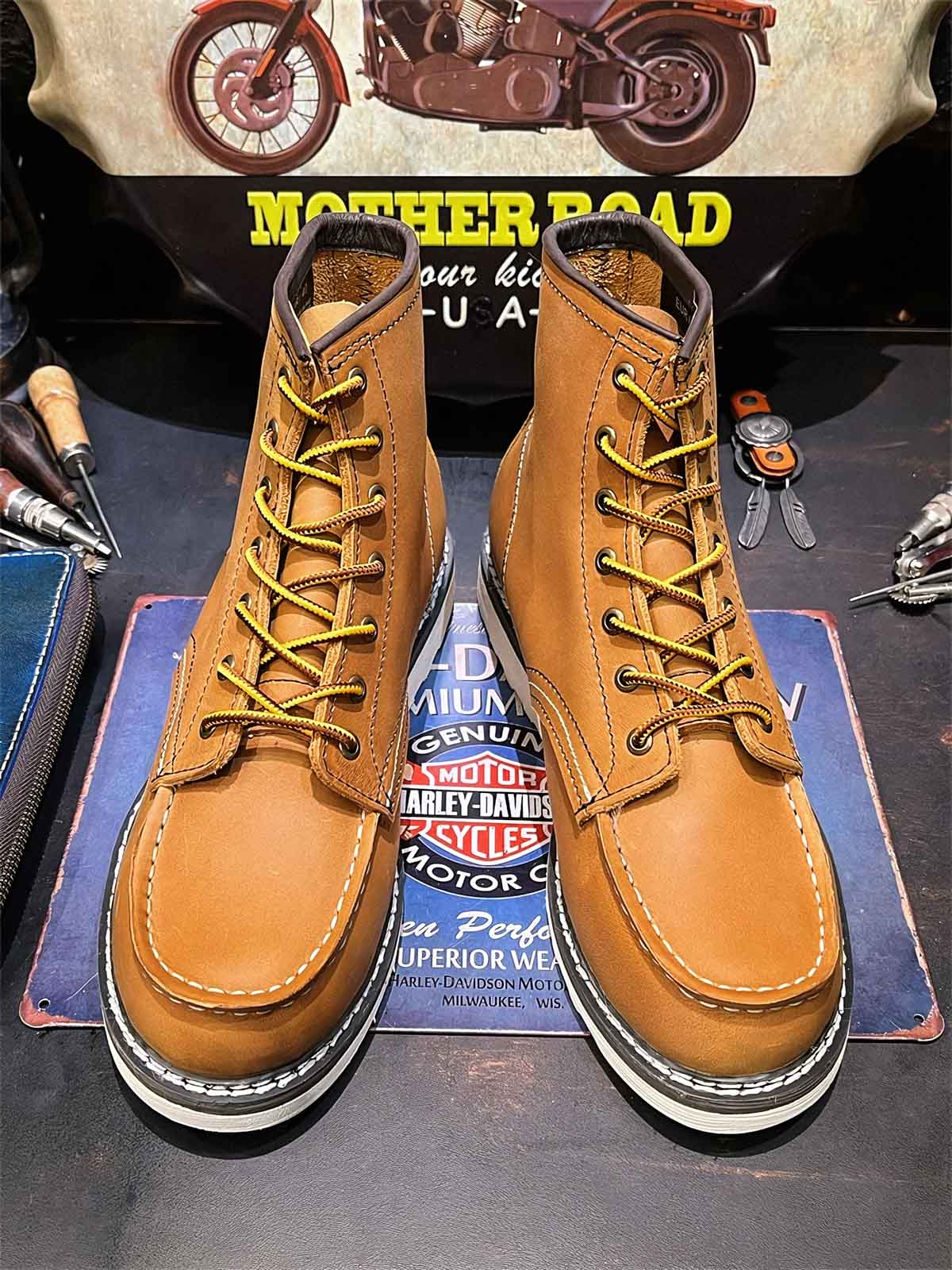 このワークウェアブーツは、伝統的なデザイン要素を採用し、現代の工芸技術で製作されています。ショートタイプのデザイン(筒の高さ10-20cm)は着用の便利さとファッション性を兼ね備えています。台湾の泰慶皮革工場の最高級の茶芯牛革を使用し、靴にレトロな外観を与えつつ、耐久性と快適さを提供しています。