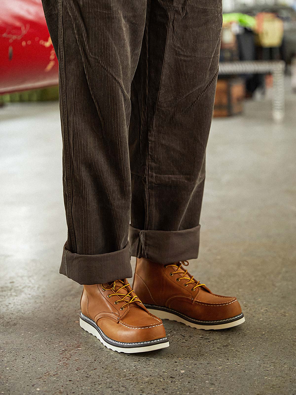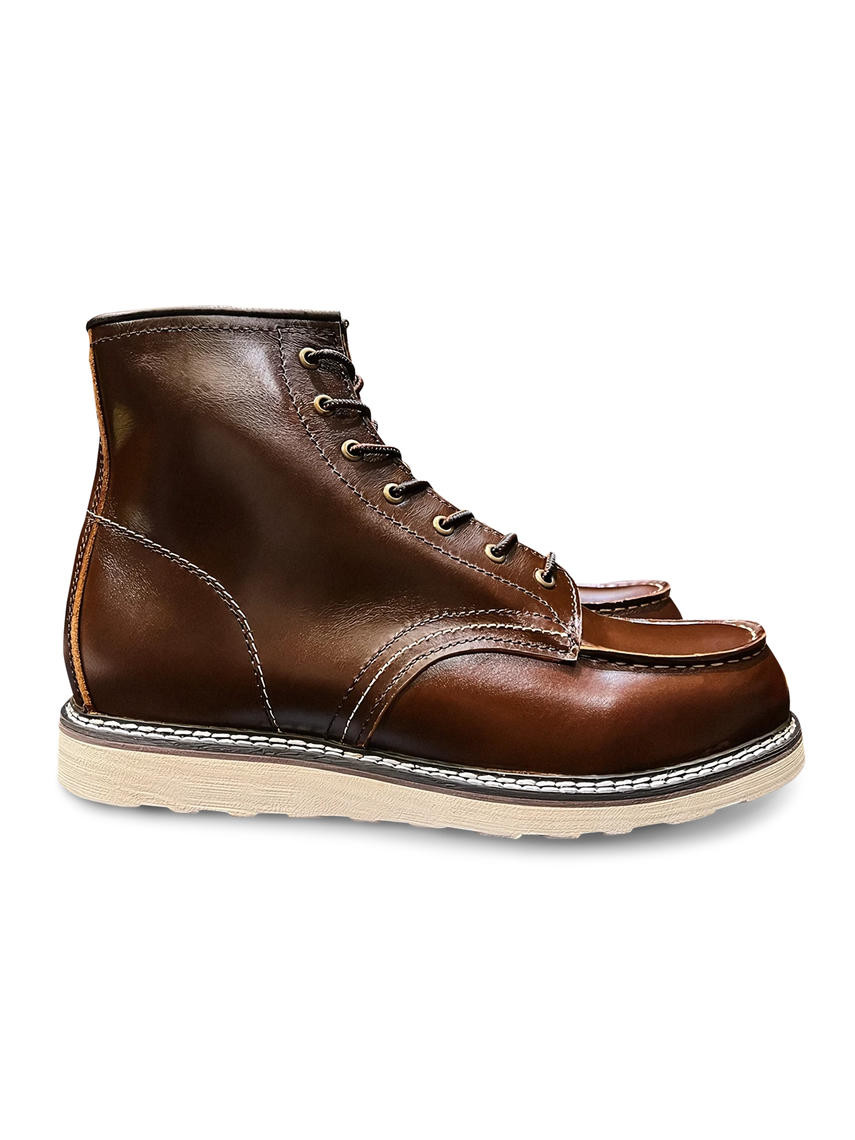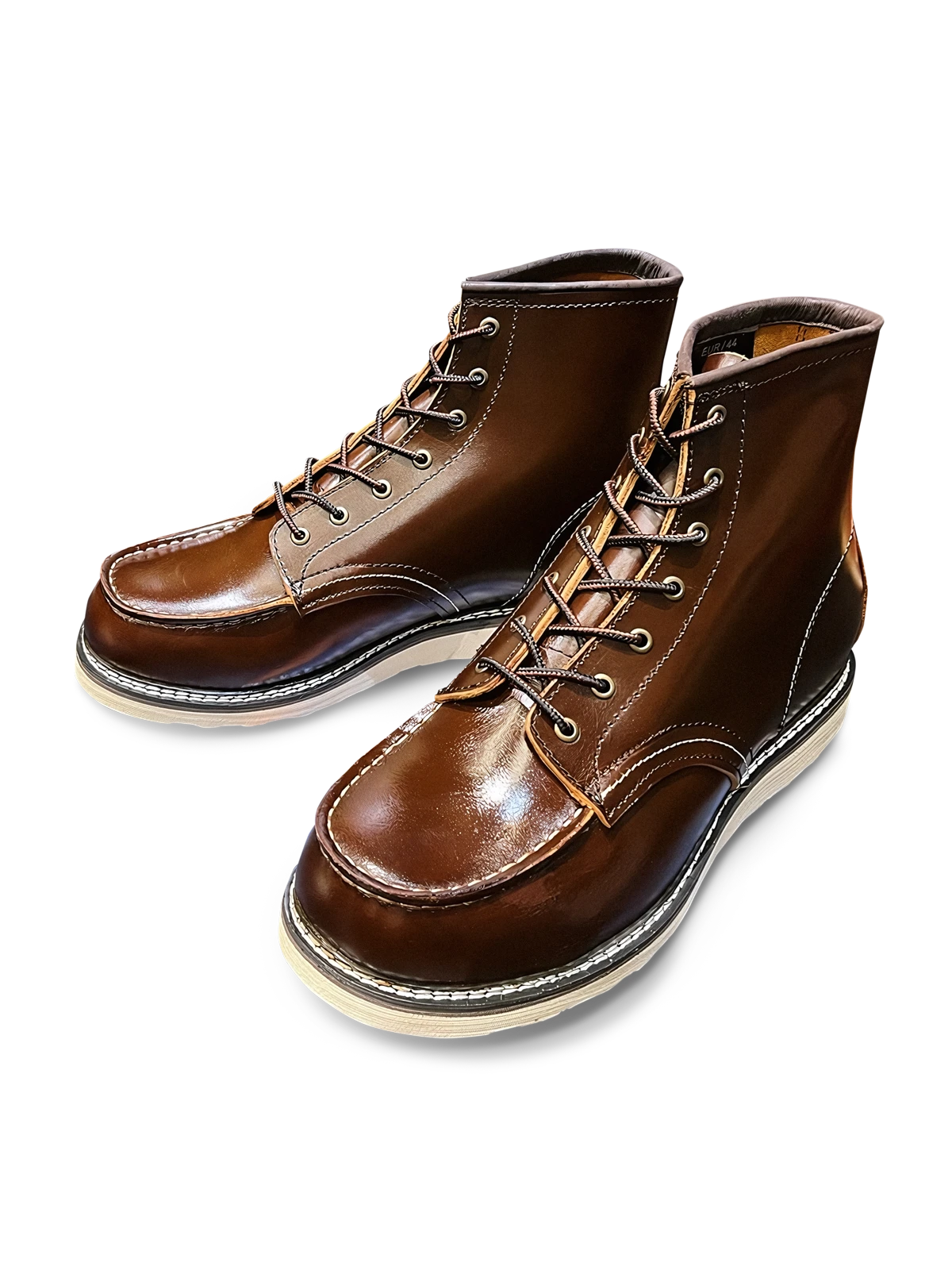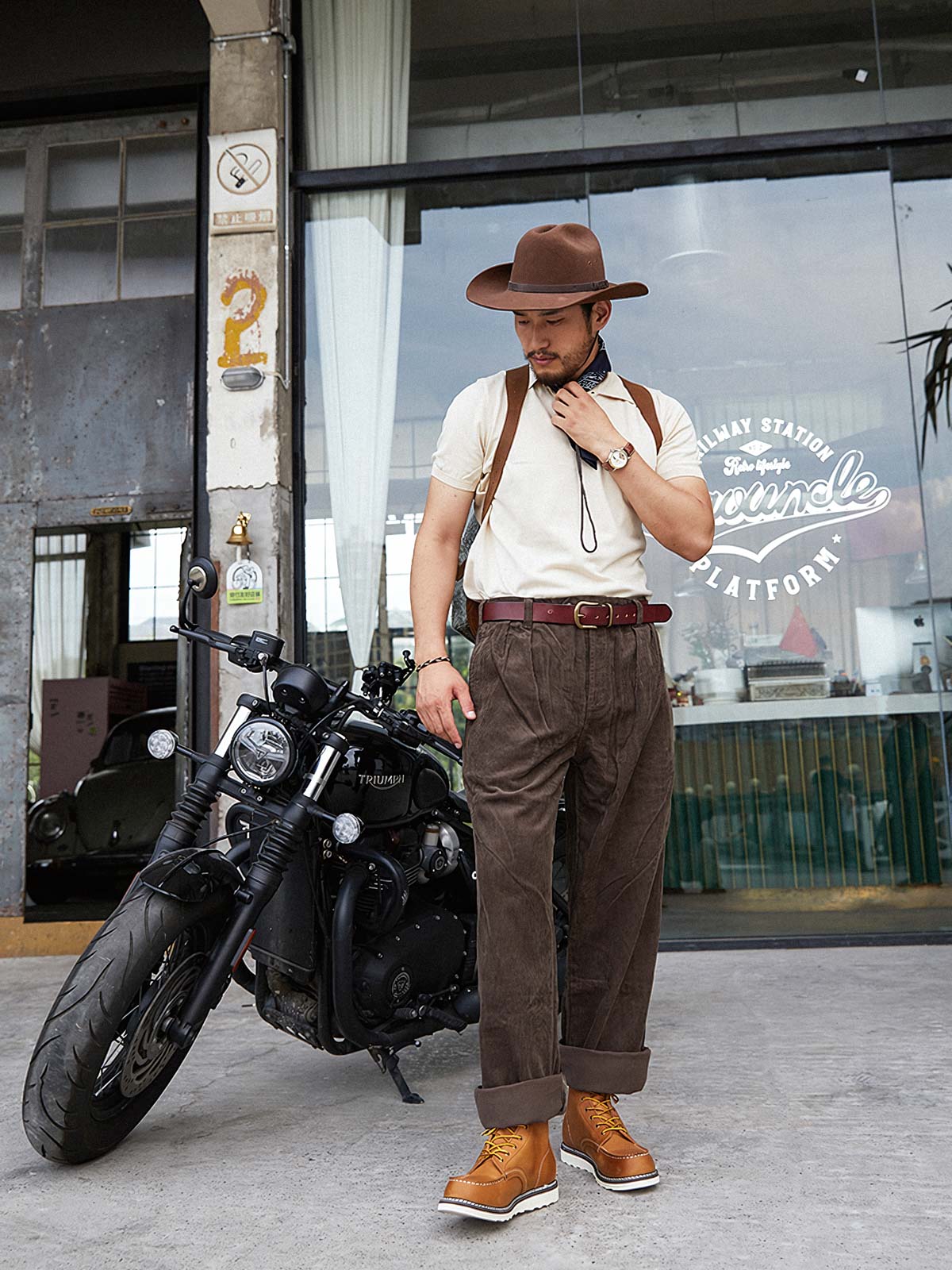このワークウェアブーツは、伝統的なデザイン要素を採用し、現代の工芸技術で製作されています。ショートタイプのデザイン(筒の高さ10-20cm)は着用の便利さとファッション性を兼ね備えています。台湾の泰慶皮革工場の最高級の茶芯牛革を使用し、靴にレトロな外観を与えつつ、耐久性と快適さを提供しています。