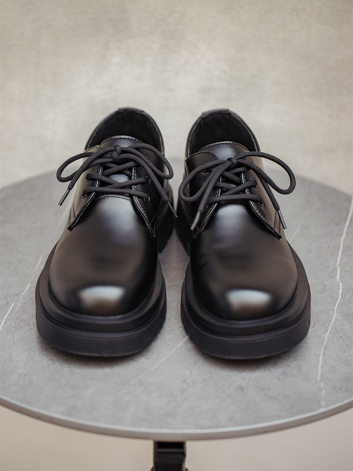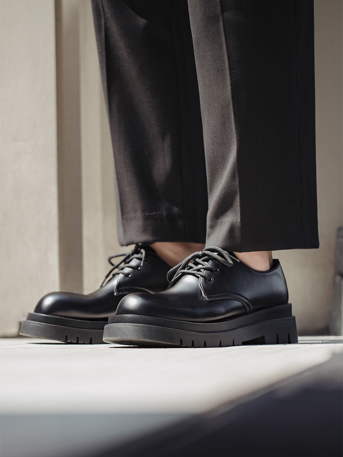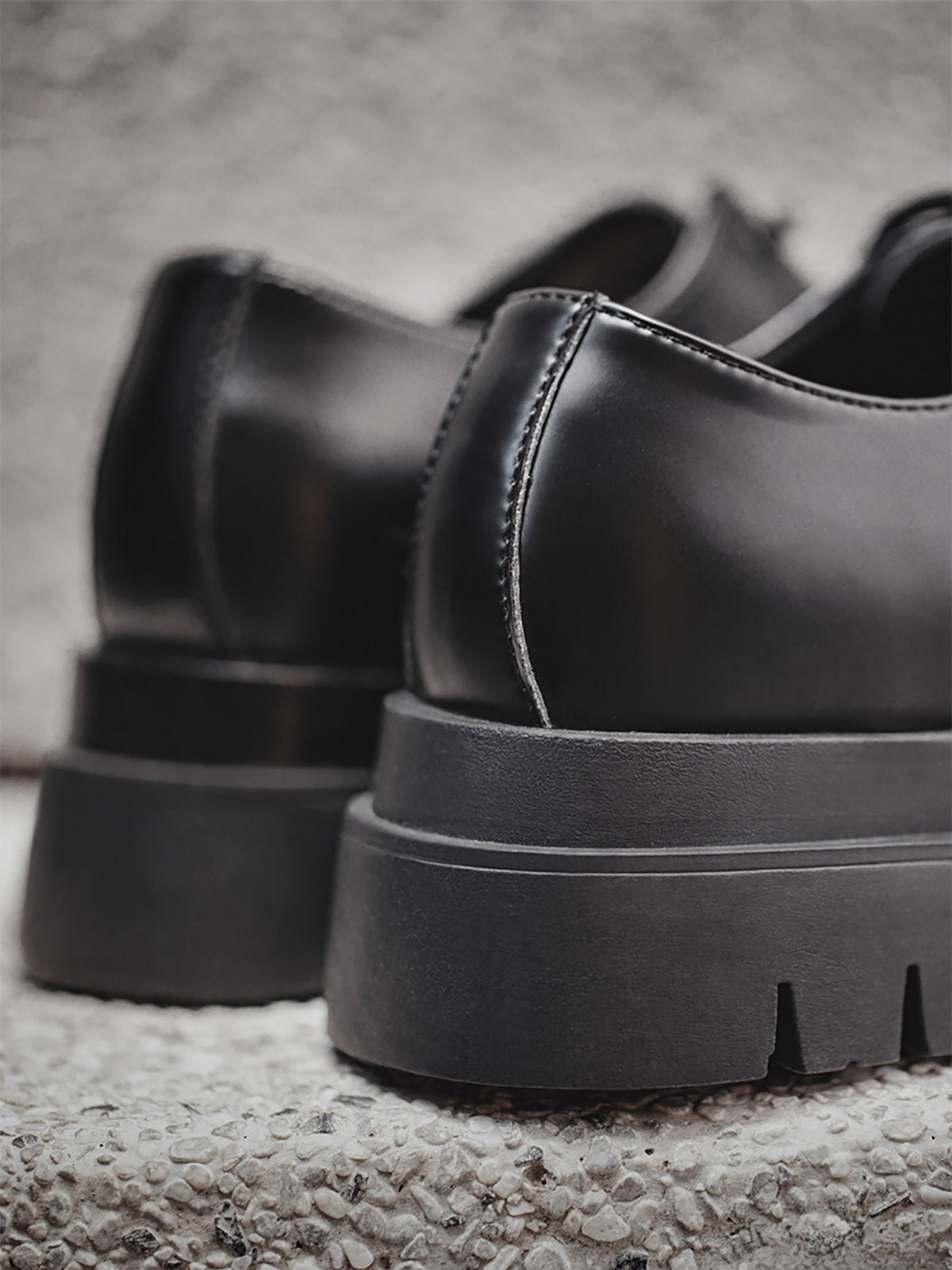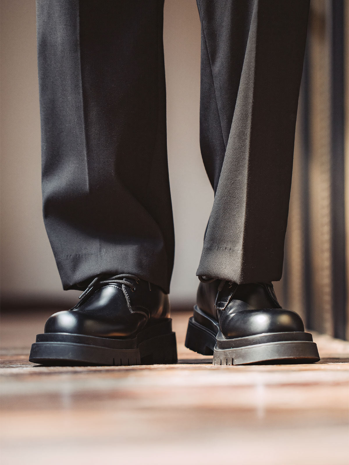この厚底のデルビーシューズは、元のシルエットを保ちつつ、つま先の曲線を調整することでより丸みを帯び、独特のギザギザの大底デザインを採用し、より目を引く視覚効果を演出しています。独自の金型設計により、大底のギザギザを軽量化し、快適な履き心地を実現しています。さらに、このシューズは4センチのヒールアップデザインを特に施し、よりタフで自信に満ちた外見を演出しています。