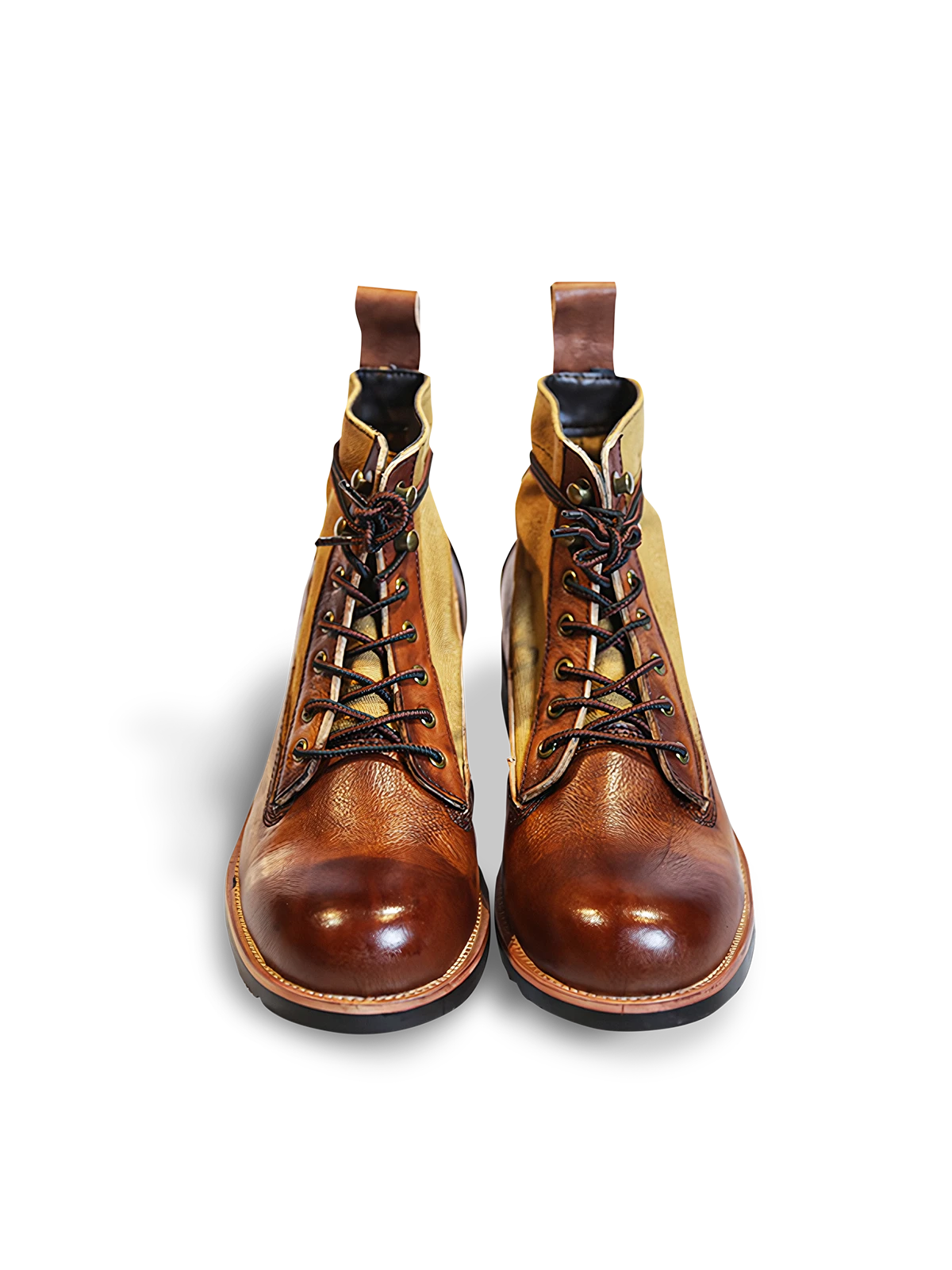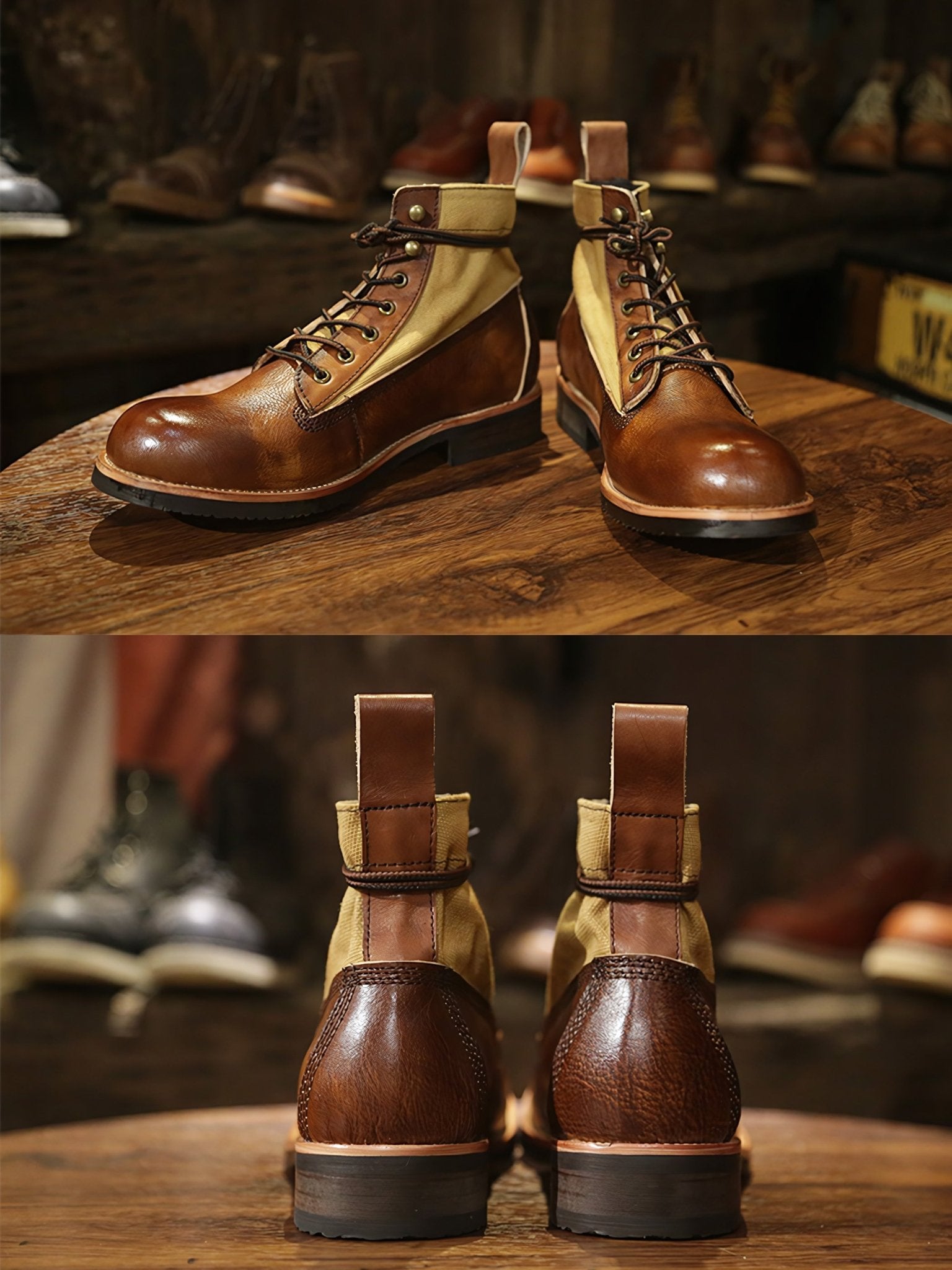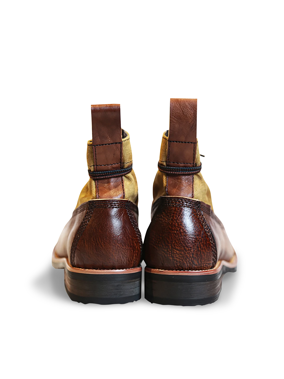 このブーツのレザーとキャンバスはカラーラビングされ、水洗い処理も施され、再びカラーラビングを繰り返して自然なユーズド感を演出しています。レザーとキャンバスのコンビ素材なので、靴自体は重たくなく、快適に履きやすいです。