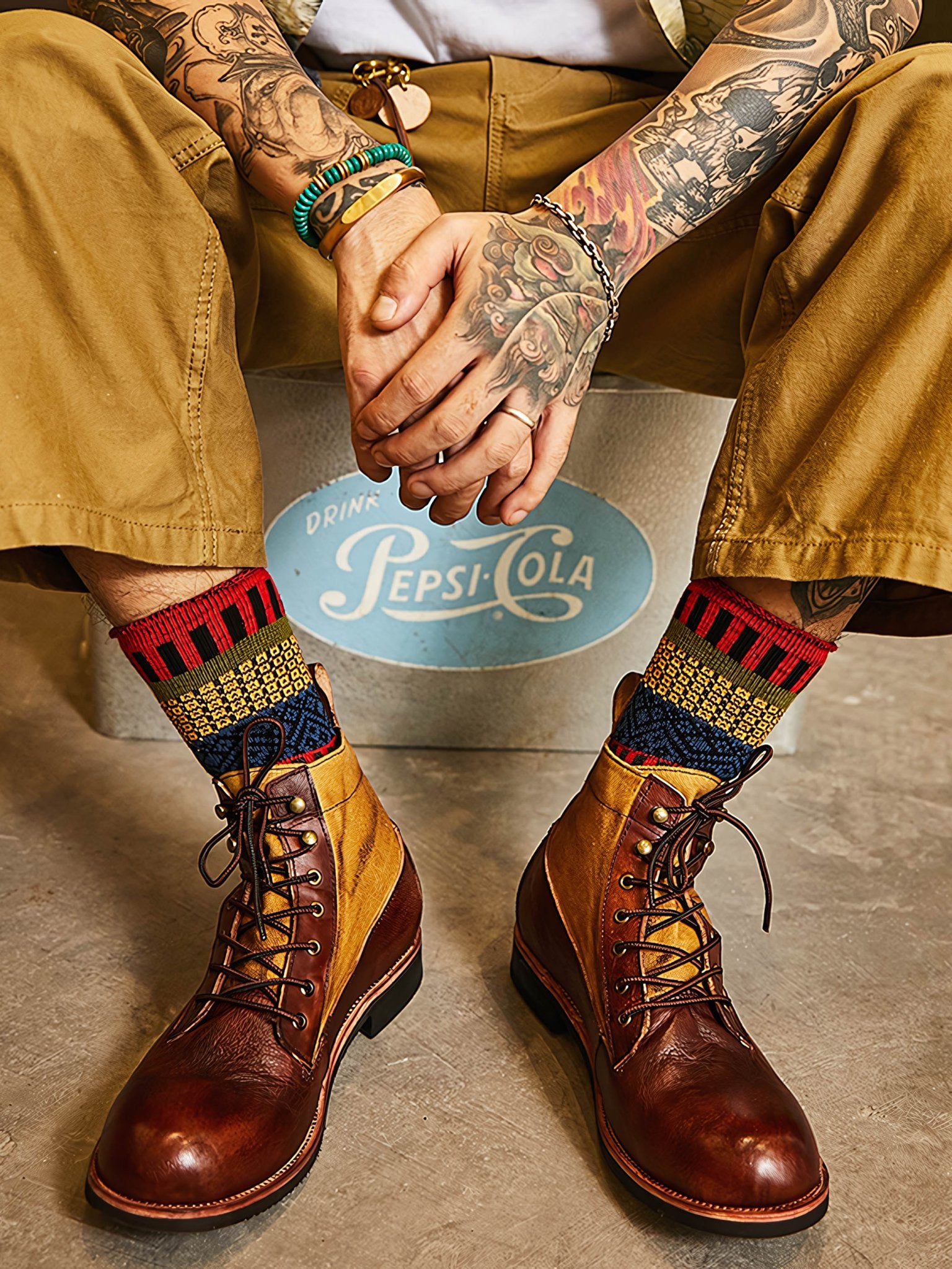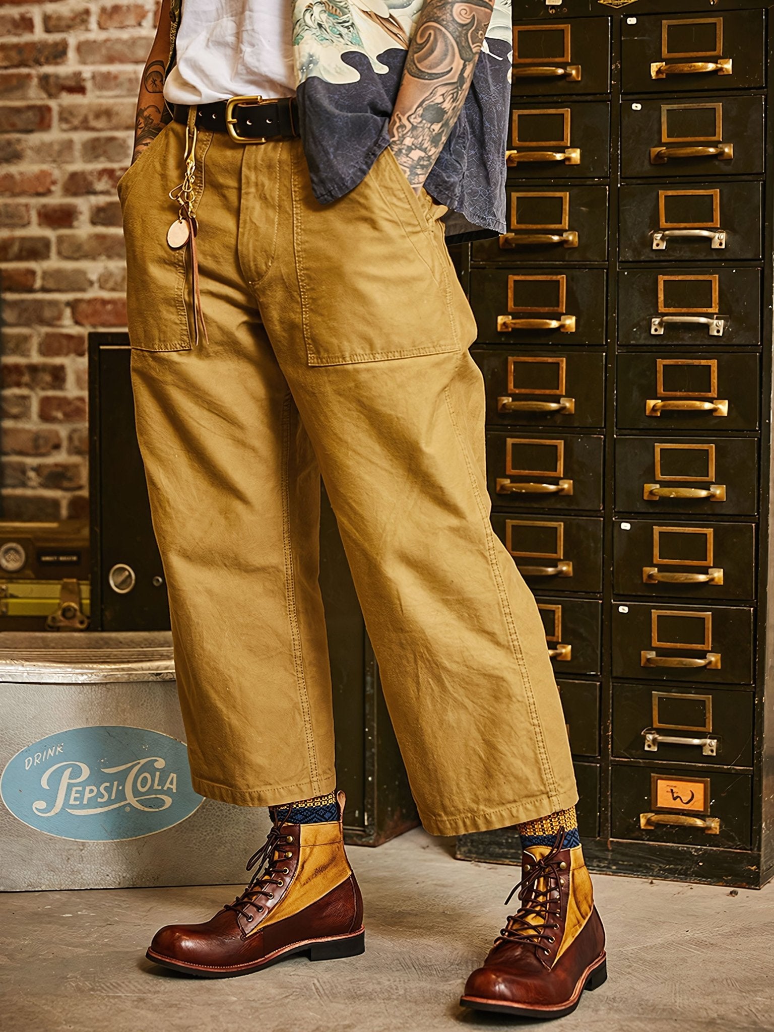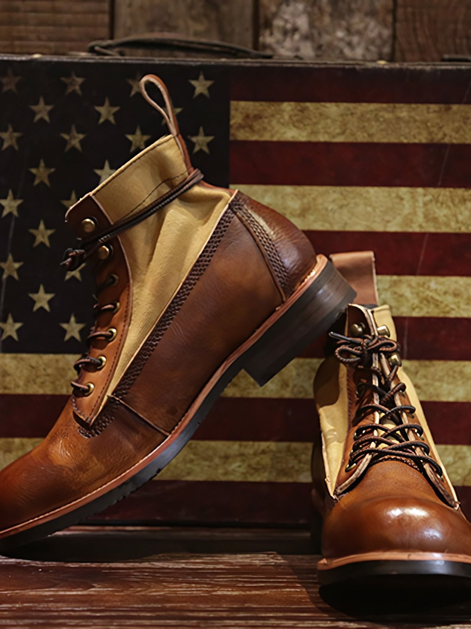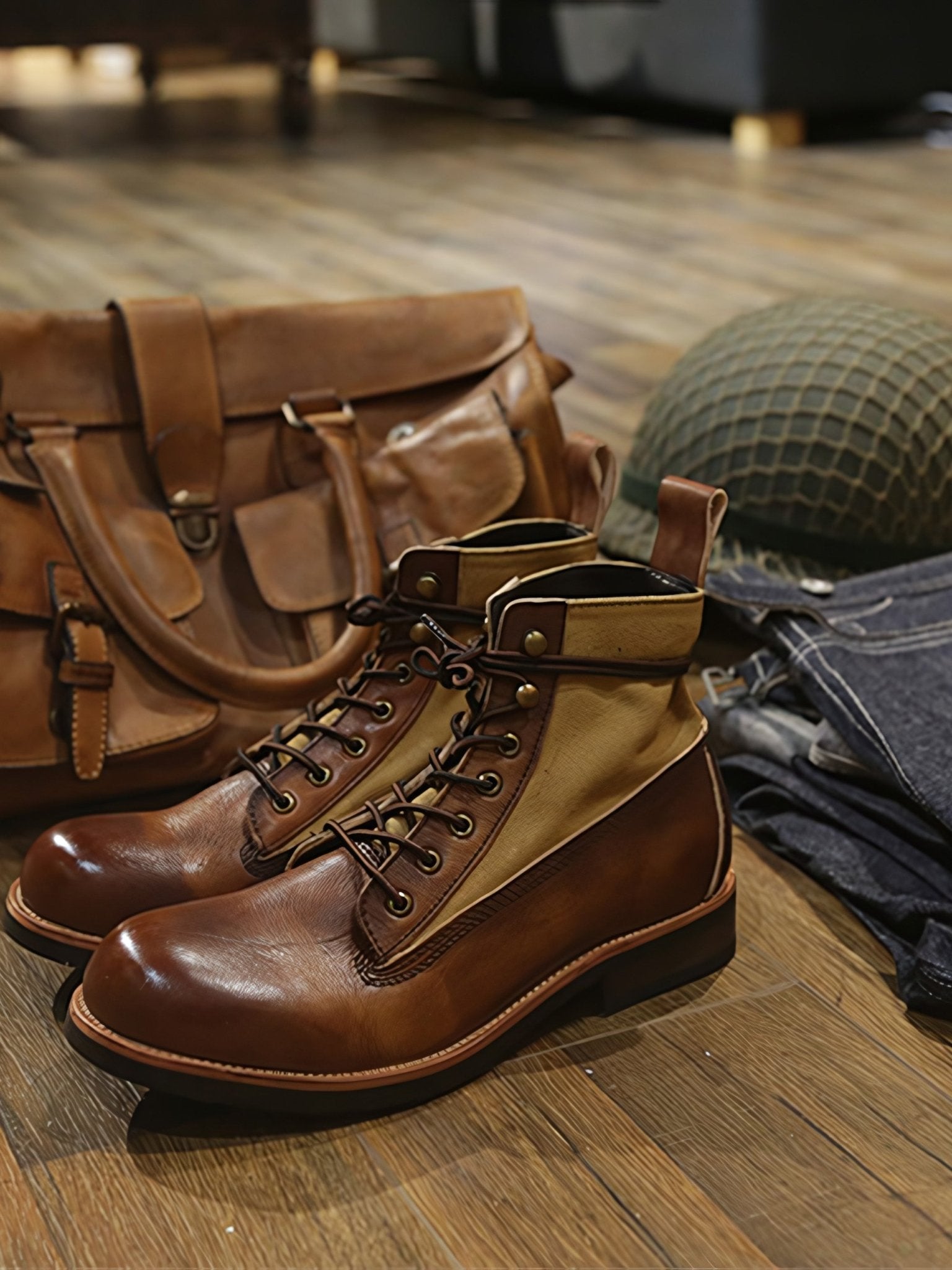 このブーツのレザーとキャンバスはカラーラビングされ、水洗い処理も施され、再びカラーラビングを繰り返して自然なユーズド感を演出しています。レザーとキャンバスのコンビ素材なので、靴自体は重たくなく、快適に履きやすいです。