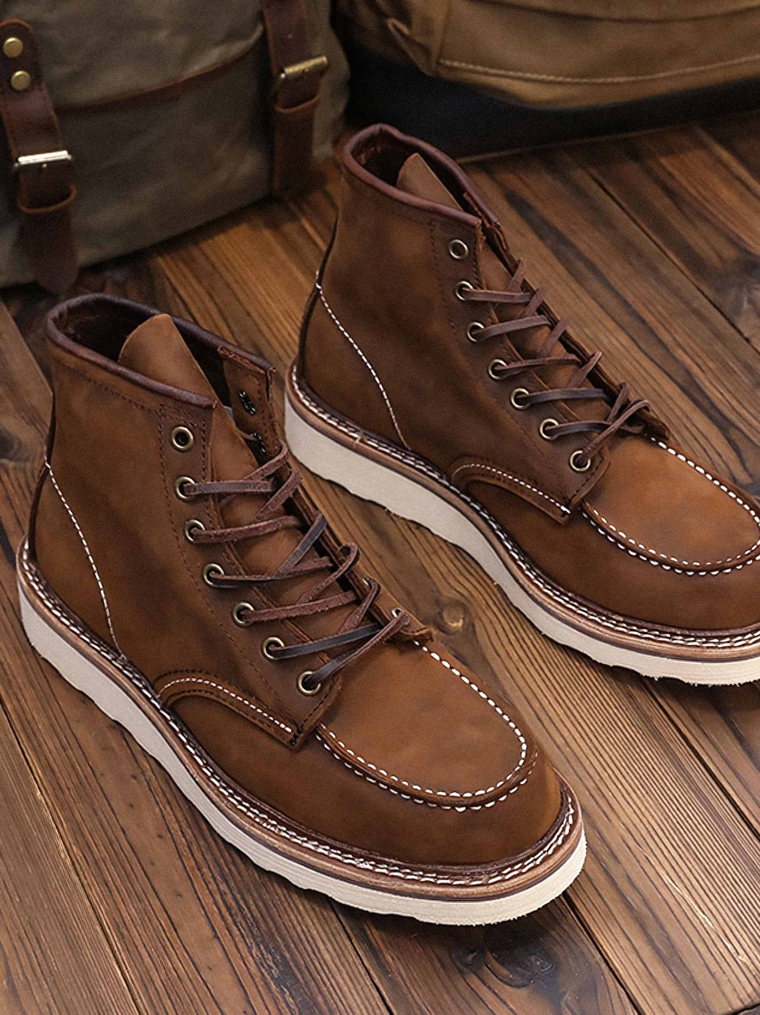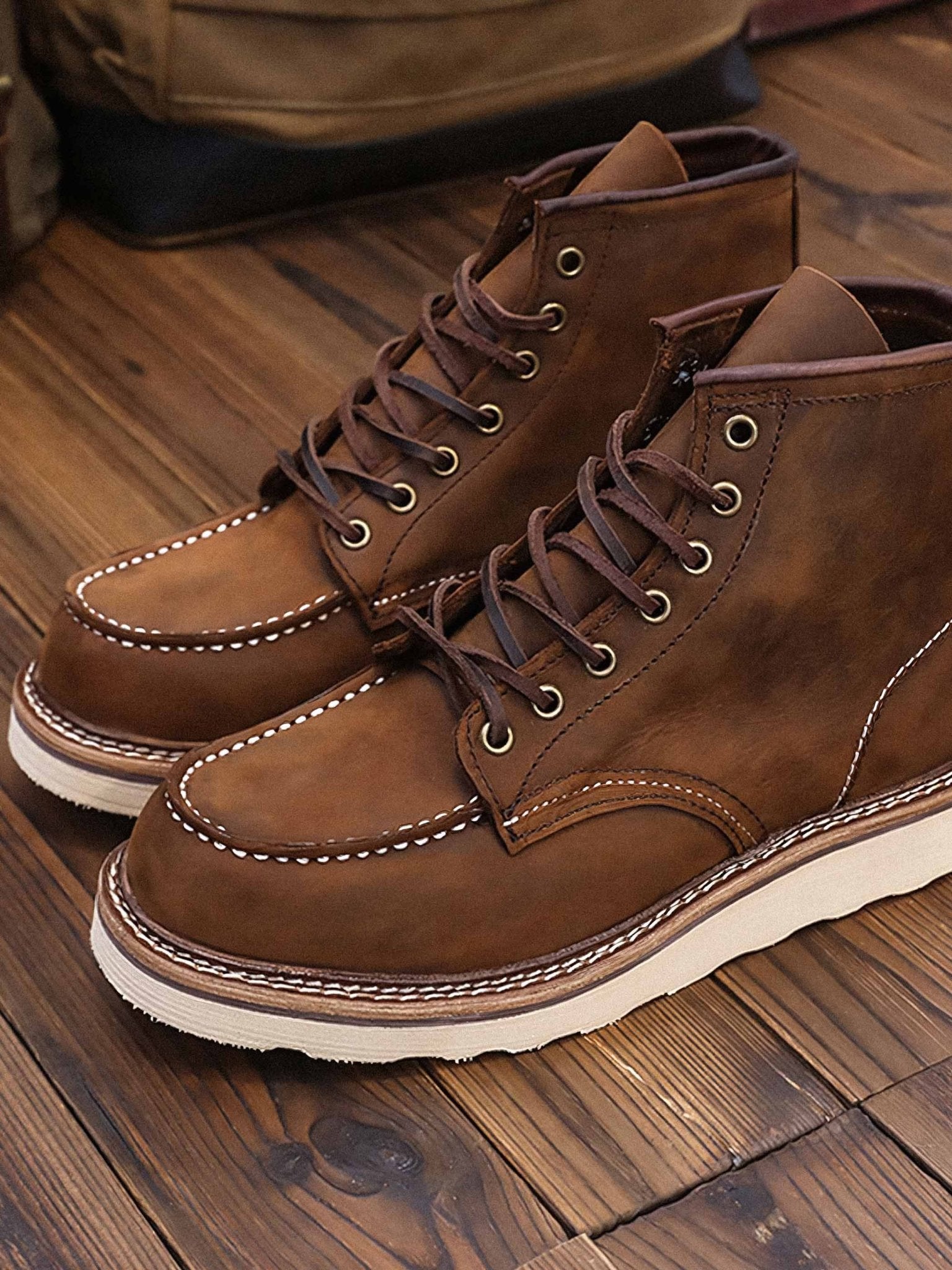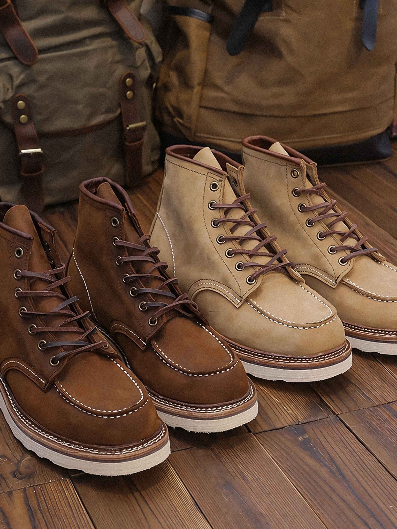 このアイテムは、ホワイトのヘビーウエイトステッチとブラウンのライトウエイトステッチ、ブラスのアイレットが組み合わさった定番のデザインを持っています。アッパーには柔らかく高品質なトップレイヤーレザーが使用され、丁寧なステッチでつま先やアウトソールと連結されており、路面からの衝撃を吸収し、防滑仕様のアウトソールも装備されています。