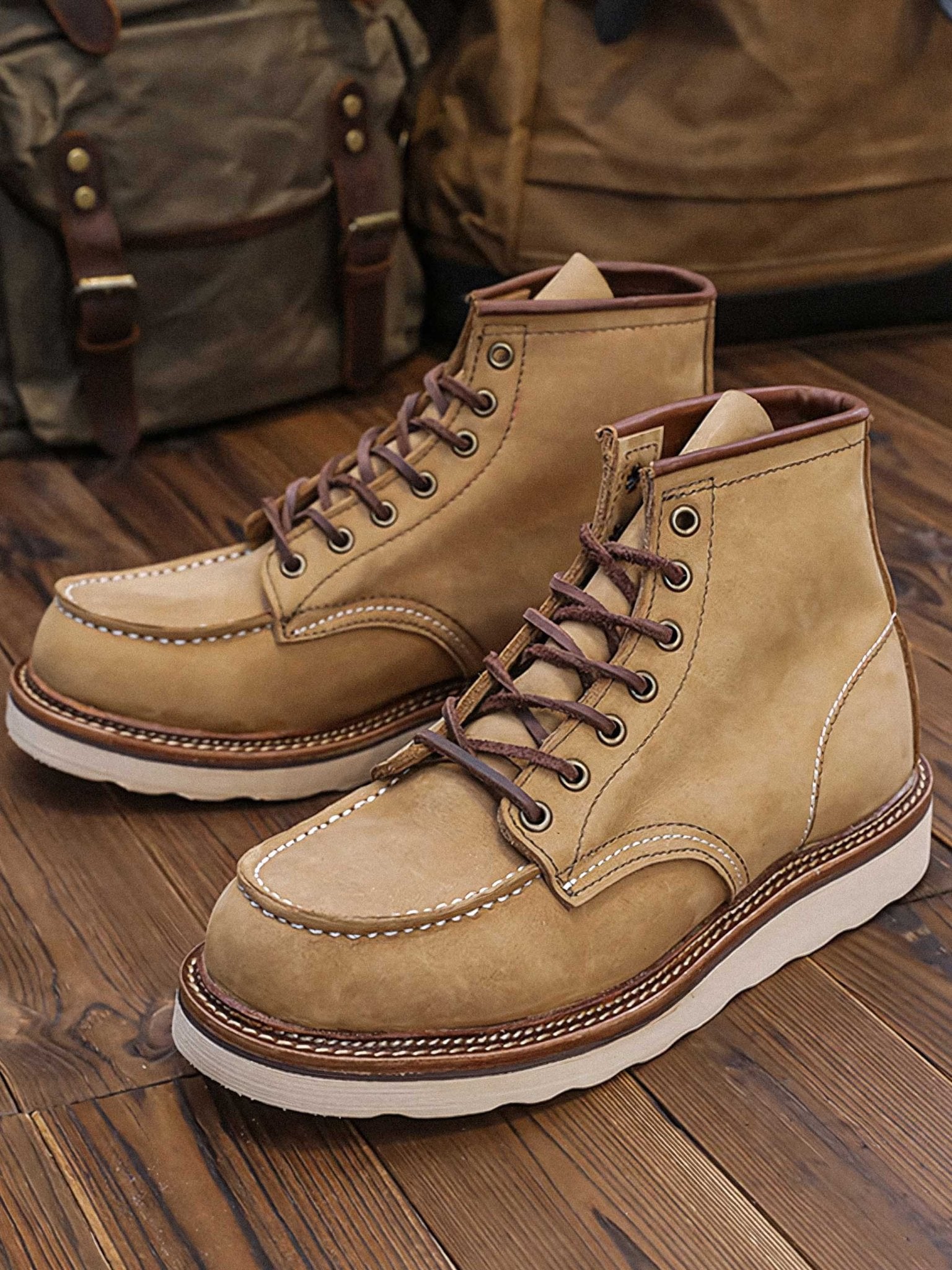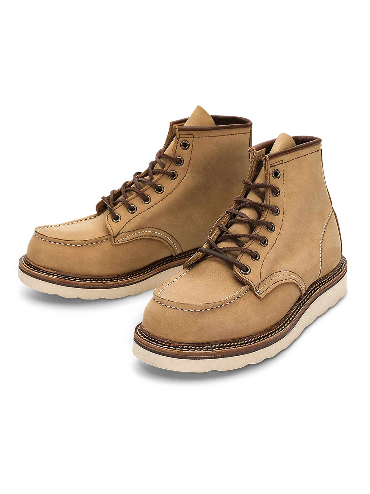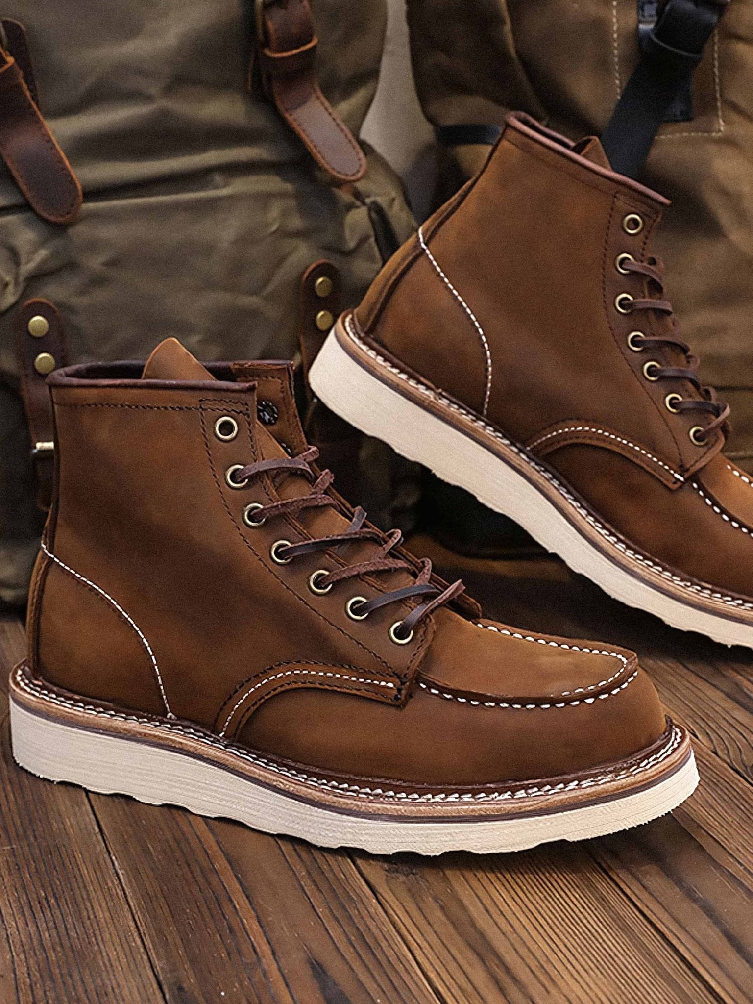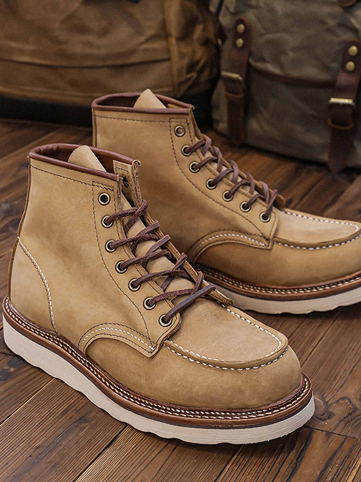 このアイテムは、ホワイトのヘビーウエイトステッチとブラウンのライトウエイトステッチ、ブラスのアイレットが組み合わさった定番のデザインを持っています。アッパーには柔らかく高品質なトップレイヤーレザーが使用され、丁寧なステッチでつま先やアウトソールと連結されており、路面からの衝撃を吸収し、防滑仕様のアウトソールも装備されています。
