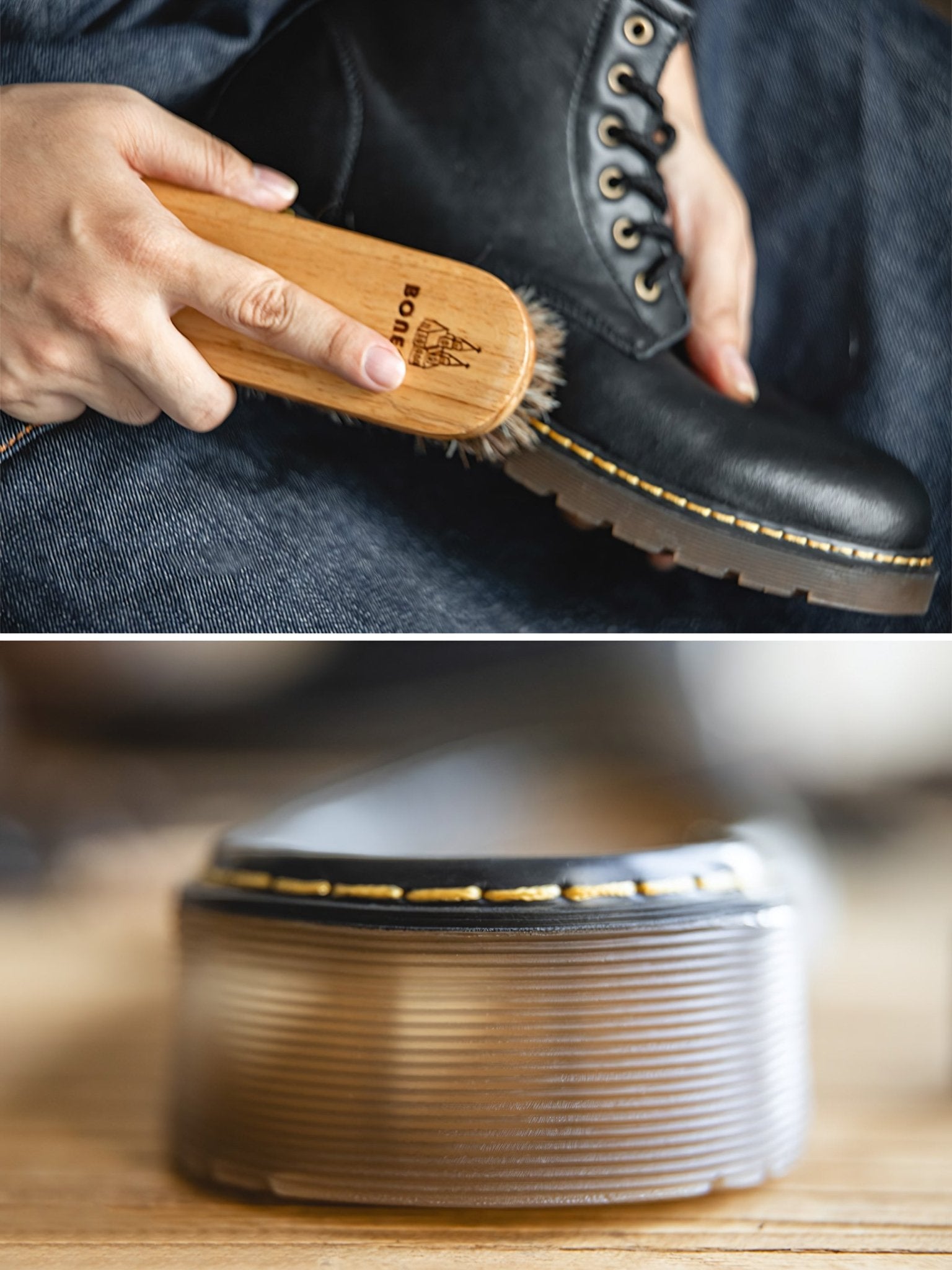 ブラックの方はソフトな感触のスムースレザーと履き込むほどに風合いが増すヌバックレザーの2タイプを展開しています。厚底のアウトソールやアッパー、そしてウェルトまでブラックで統一されており、無骨でワイルドなルックスに重厚なムードを持ち合わせています。ブラウンの方は秋冬のアクセントとなるヌバックレザーを使用しており、上質で高級感が漂う仕上がりとなっています。