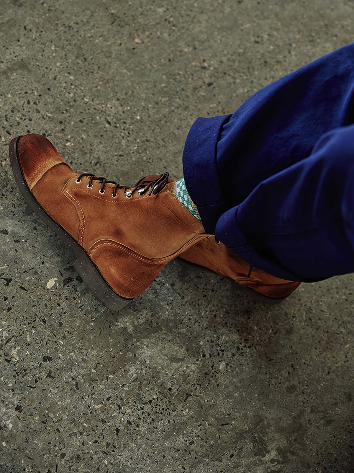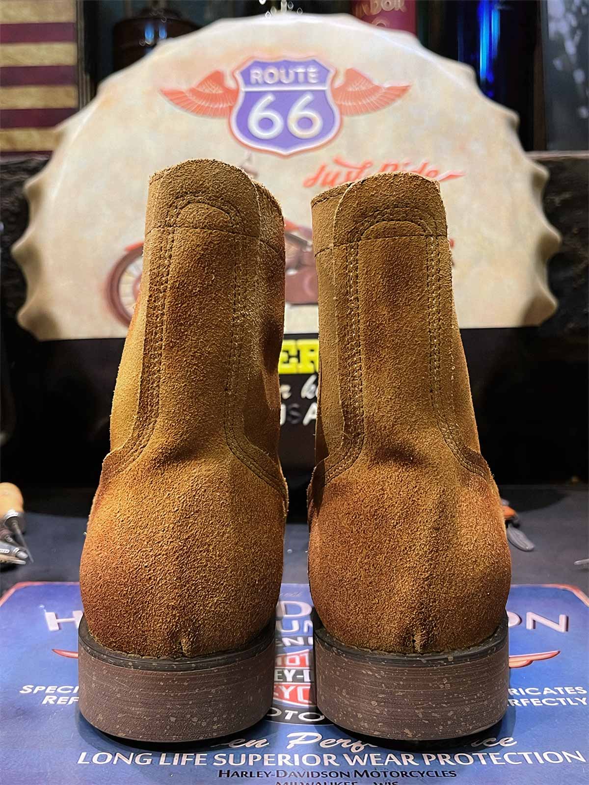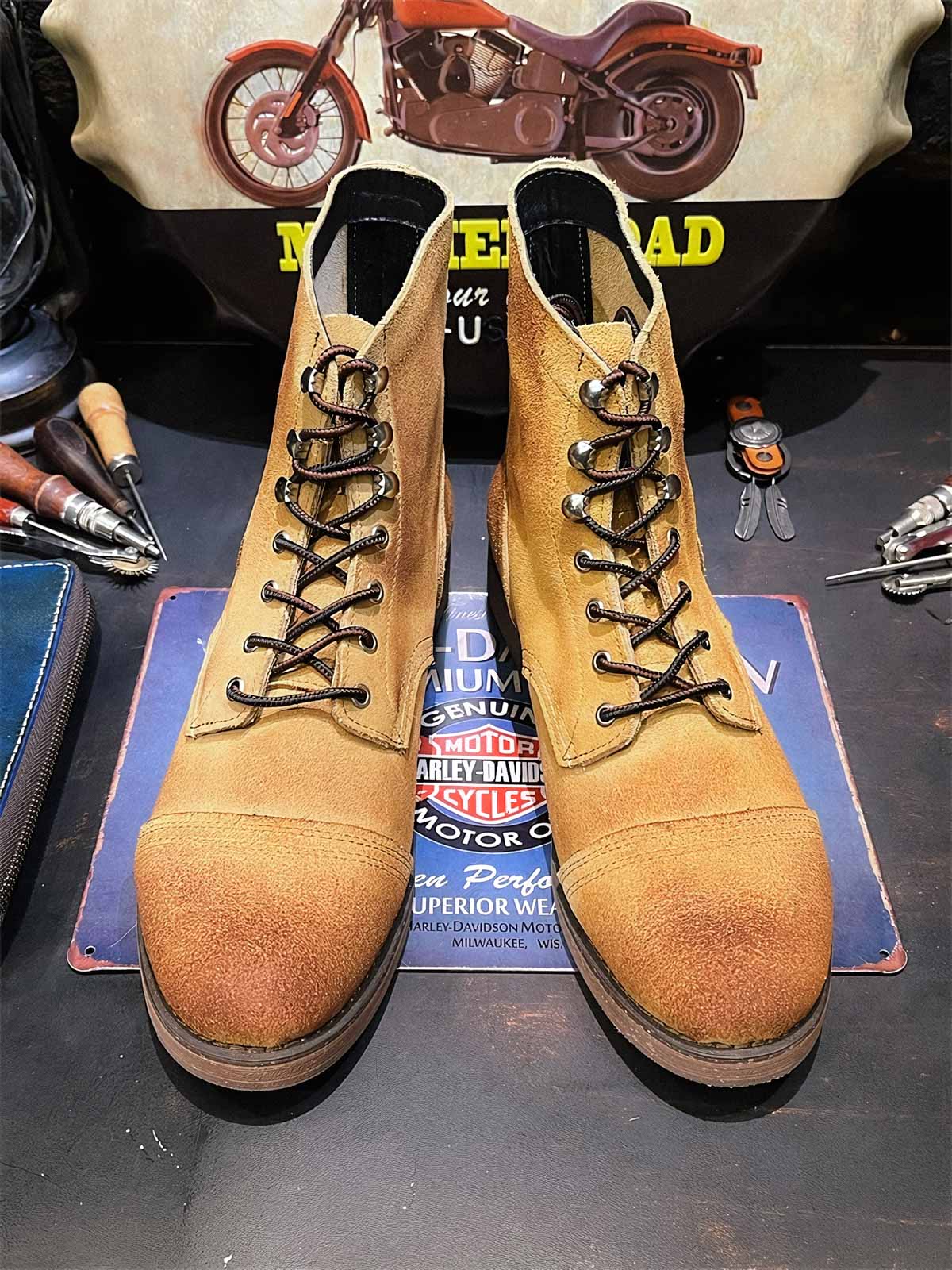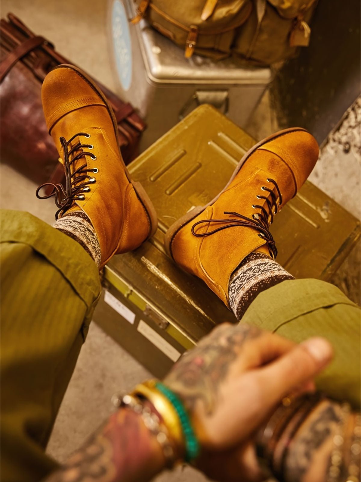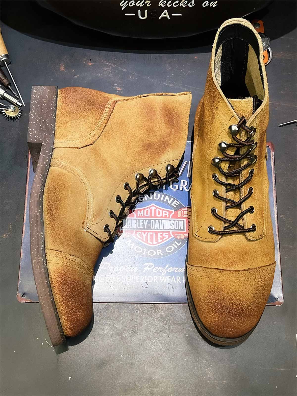 表皮には特別加工されたトップレイヤースエード牛革を使用し、時間とともに自然なエイジングを経て独特の外観を呈します。インソールにはトップレイヤー豚革を採用し、足の快適性を保証しています。アウトソールはPESSOAブランドの専用耐摩耗性ラバーを使用し、長時間の着用において耐久性と快適性を保証しています。