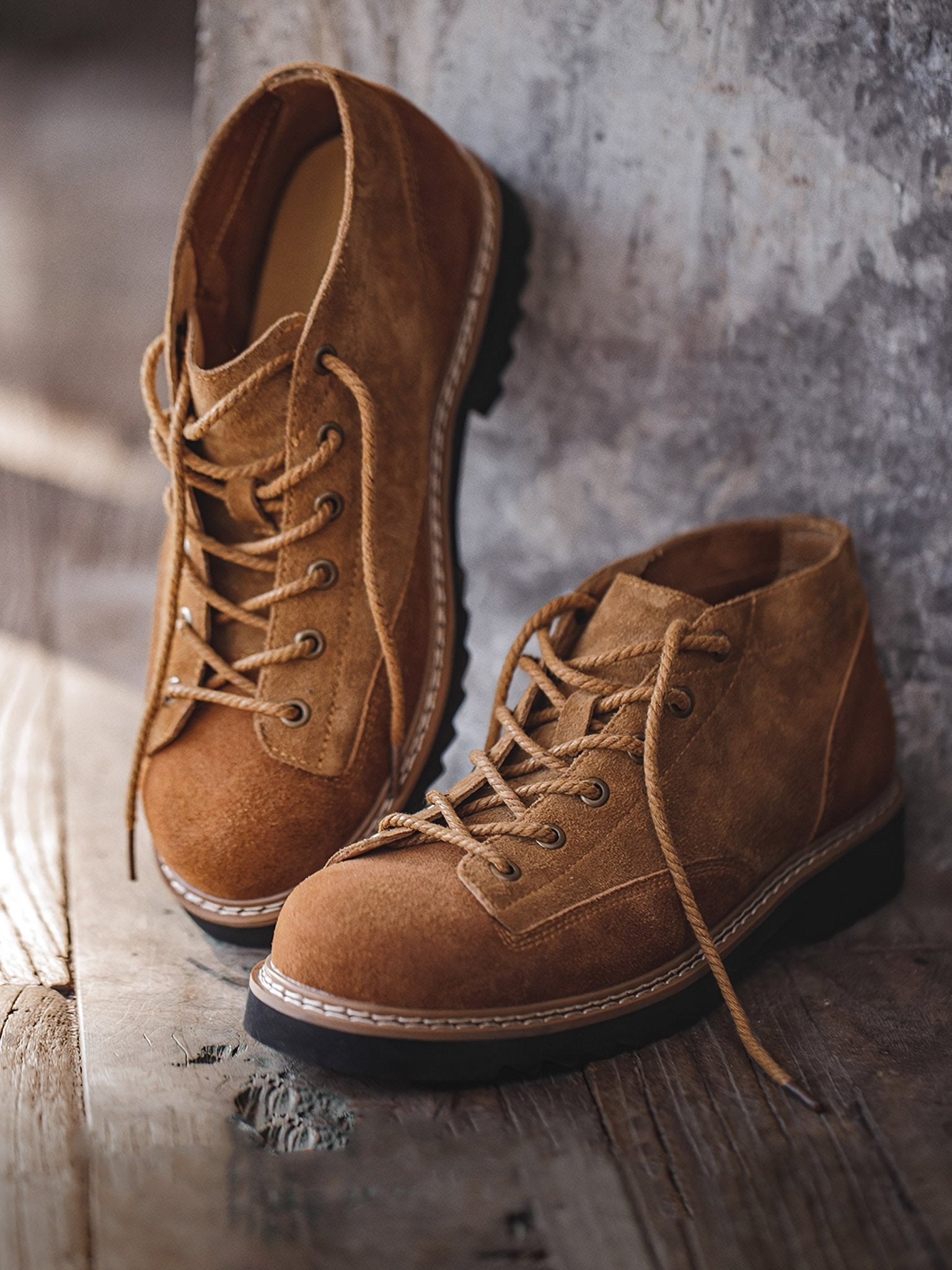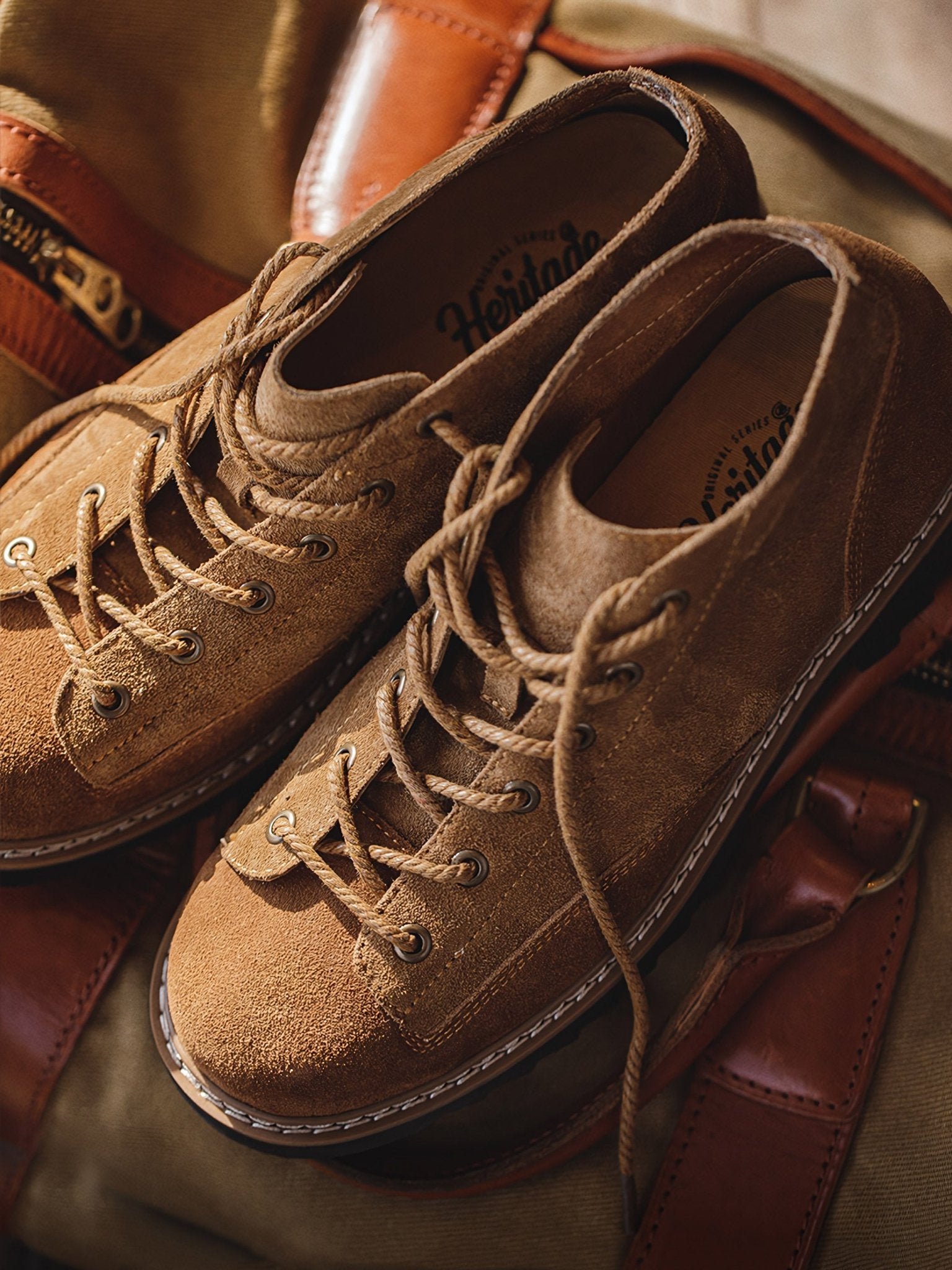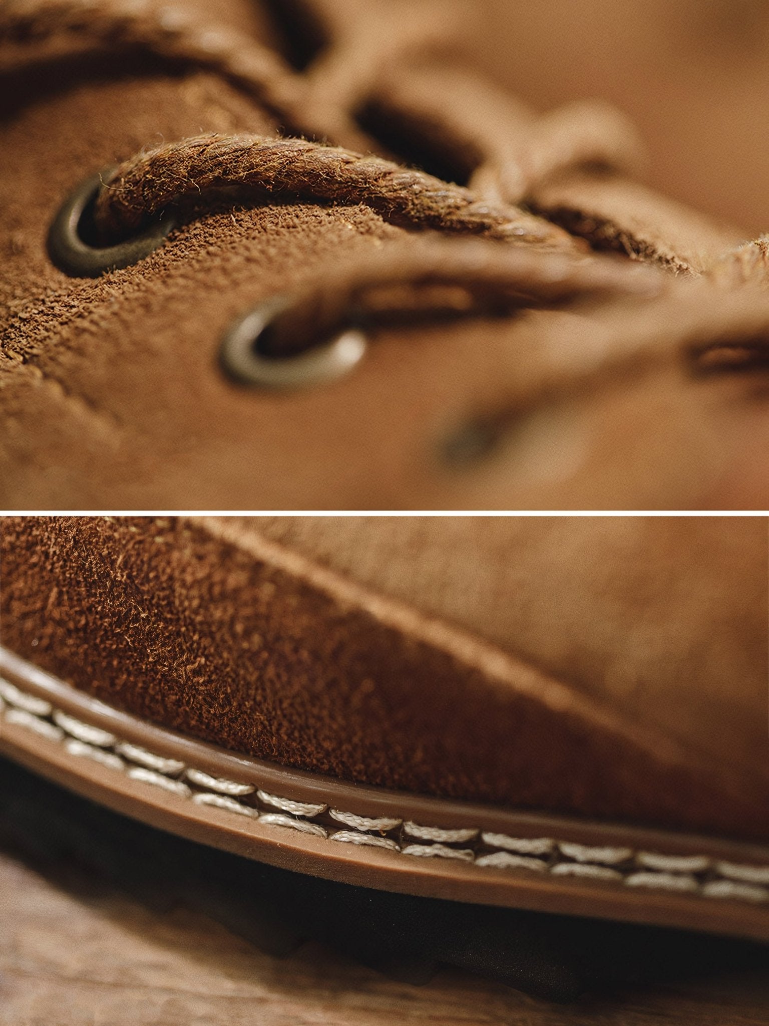 革面は牛革を裏使いしたものに、紙やすりをかけた後、パラフィンを溶かし染み込ませる加工を施していますので、通常のスウェードのシューズよりも部分的にムラ感があったり粗目の表情になっています。