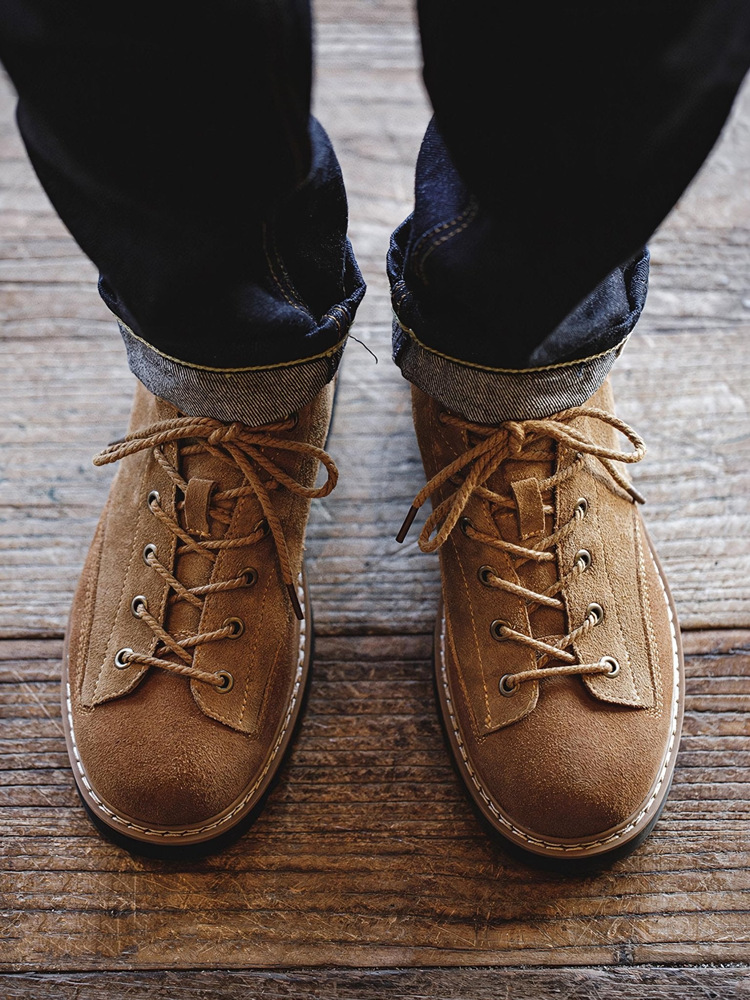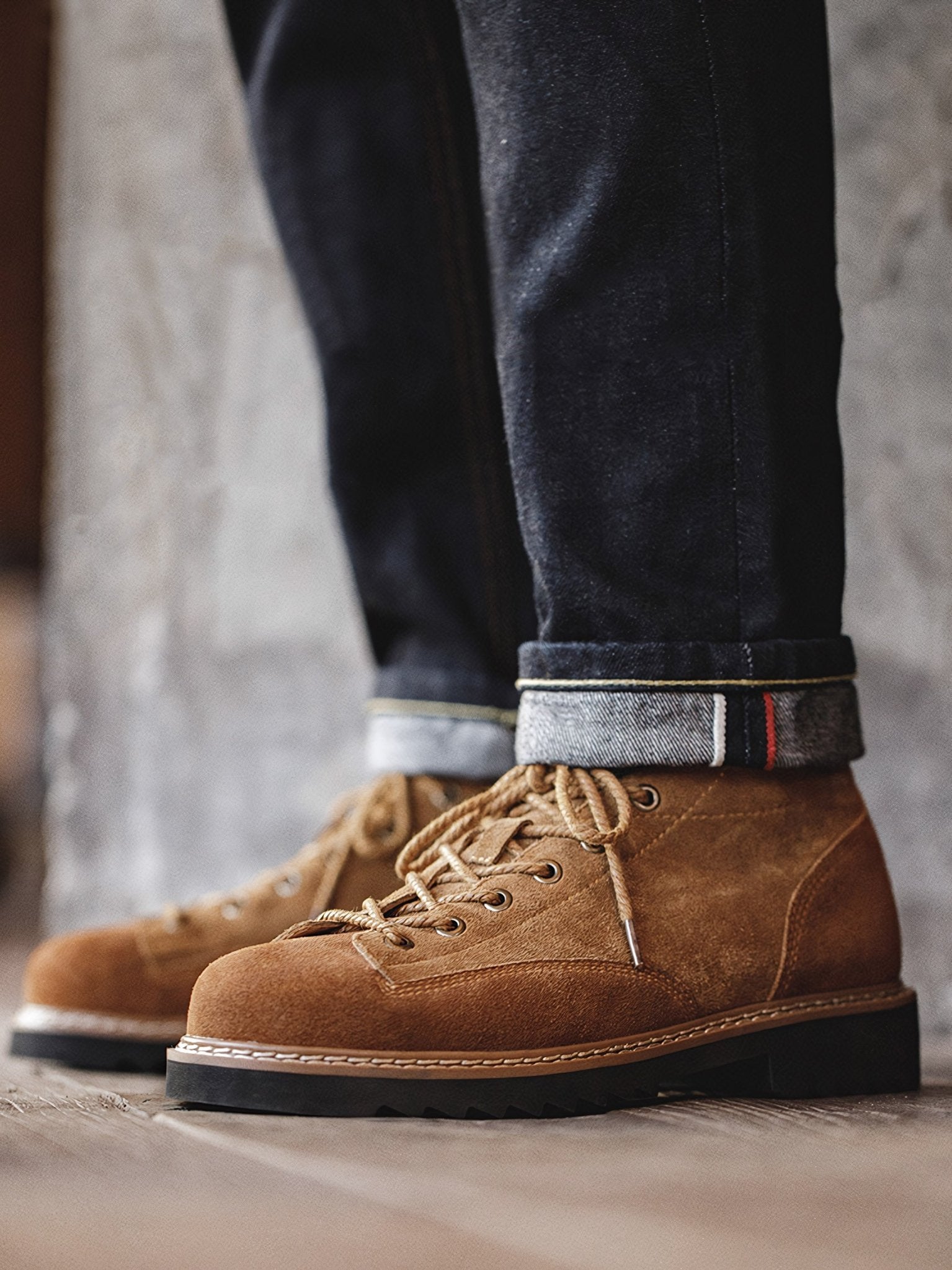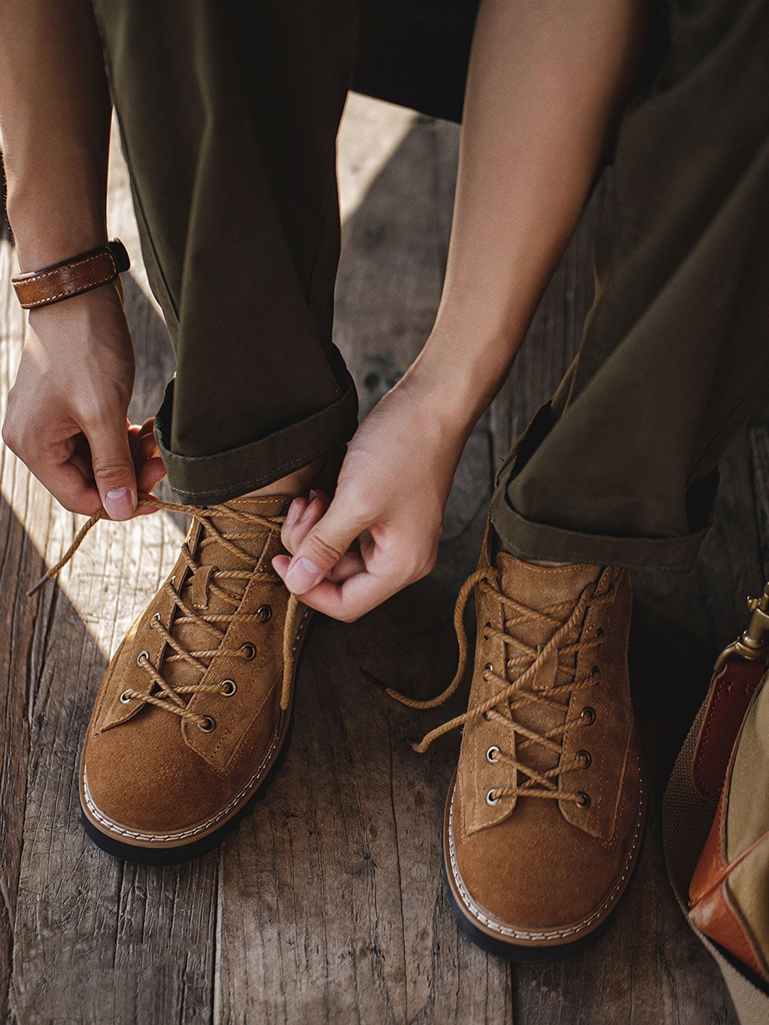 革面は牛革を裏使いしたものに、紙やすりをかけた後、パラフィンを溶かし染み込ませる加工を施していますので、通常のスウェードのシューズよりも部分的にムラ感があったり粗目の表情になっています。