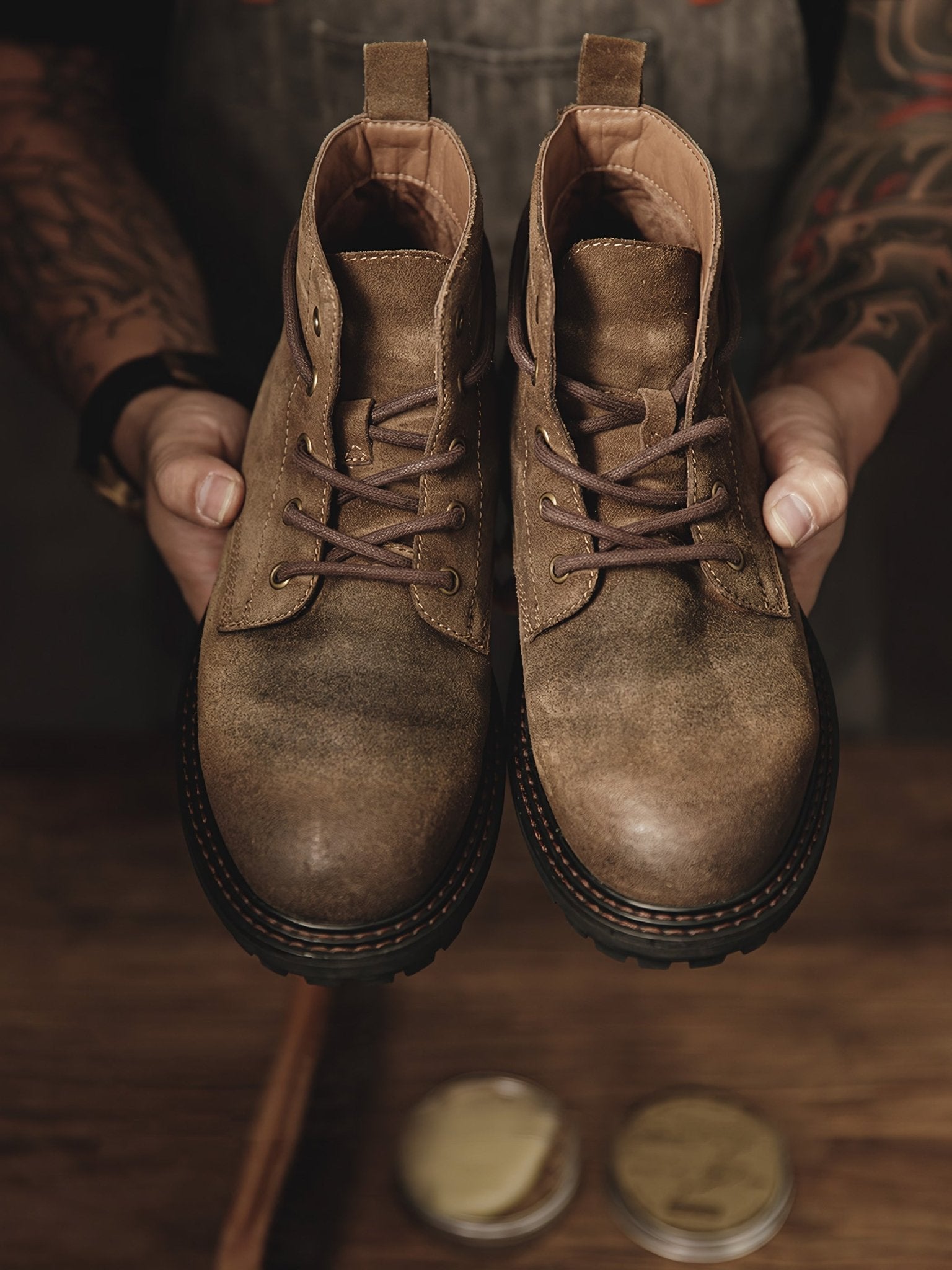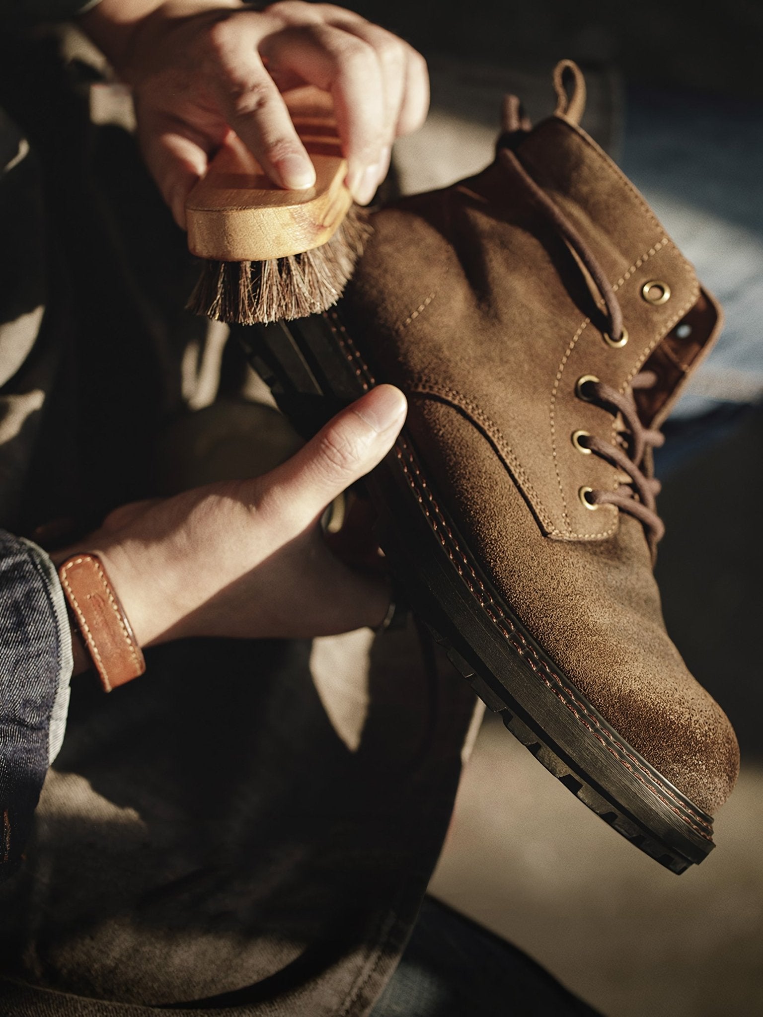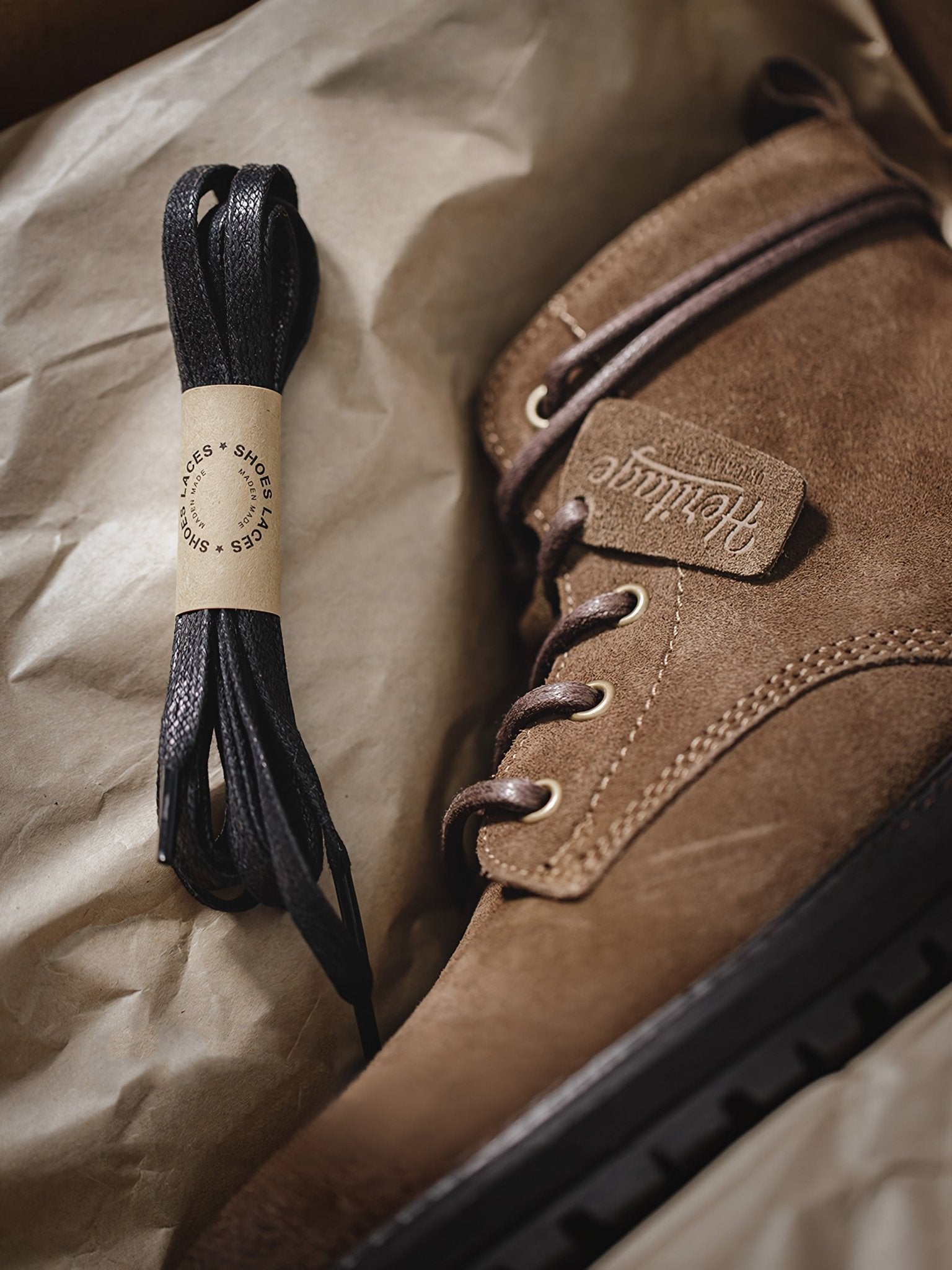 新作として、レザー素材の選択から工芸、靴型に至るまで、こちらのアイテムには色々な工夫と改良を重ねました。厚手のソールはこのワークブーツの特徴であり、靴型はワークブーツの魂です。靴の形状と快適さにおいて重要な役割を果たします。さらに、二種類のワックスがけされた靴紐を用意しており、お客様にはその組み合わせを楽しんでいただけます。
