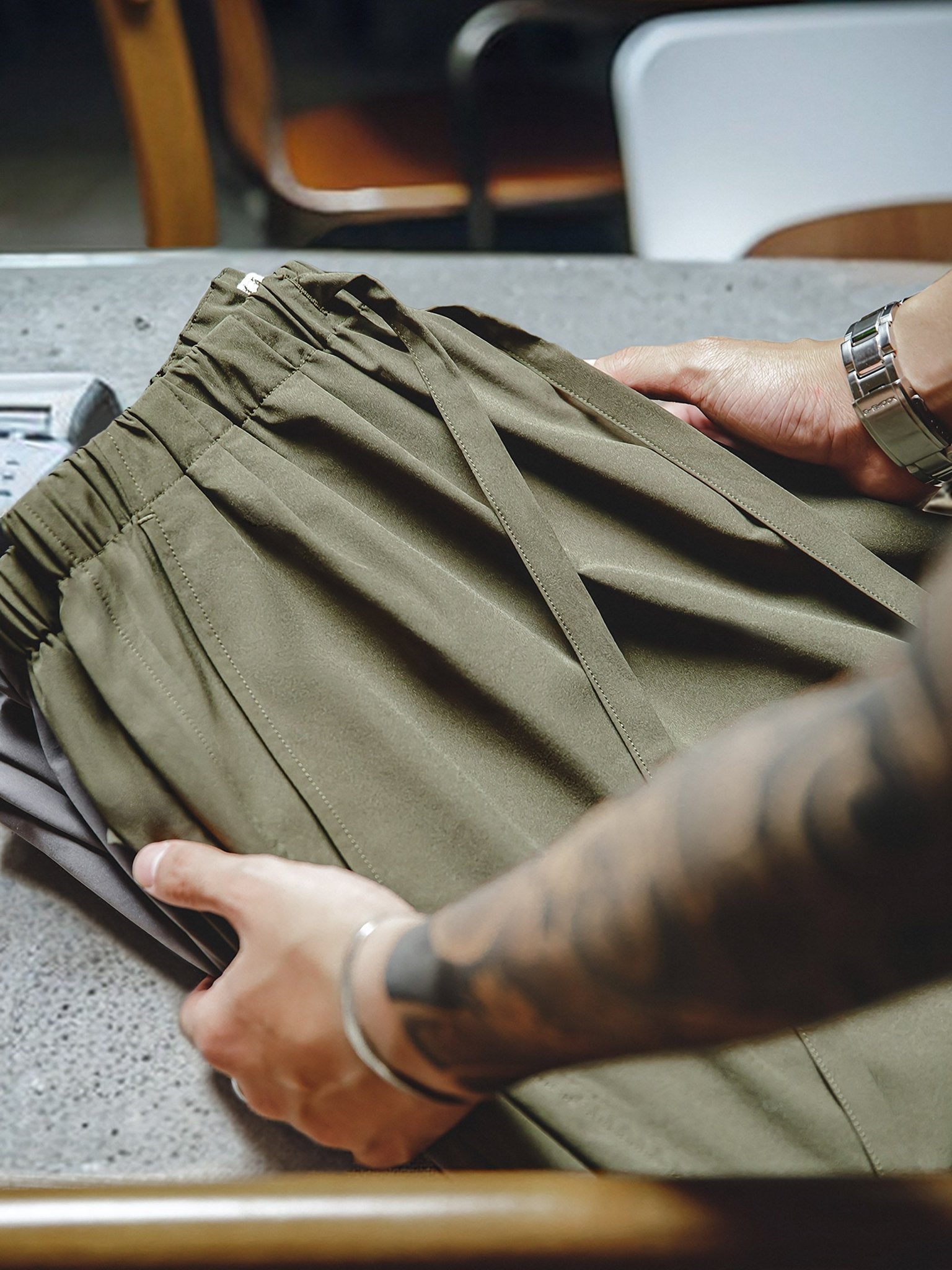 素材はポリエステル繊維95%とナイロン繊維5%で構成されて、滑らかな手触りで防水効果も備えているため、日常の着用がさらに心地よくなります。素材自体に優れたドレープ感があり、全体的な印象は清潔で洗練されています。