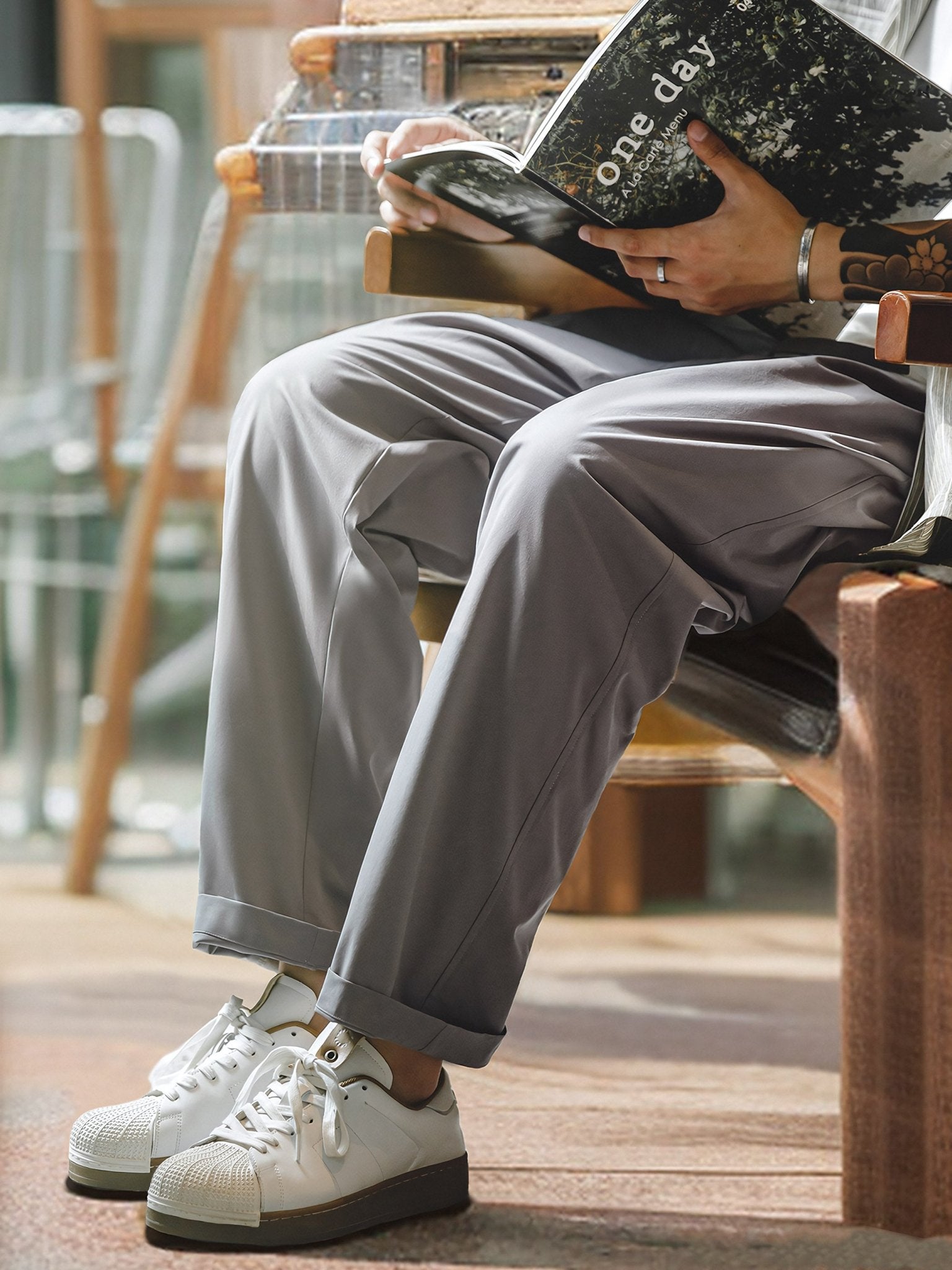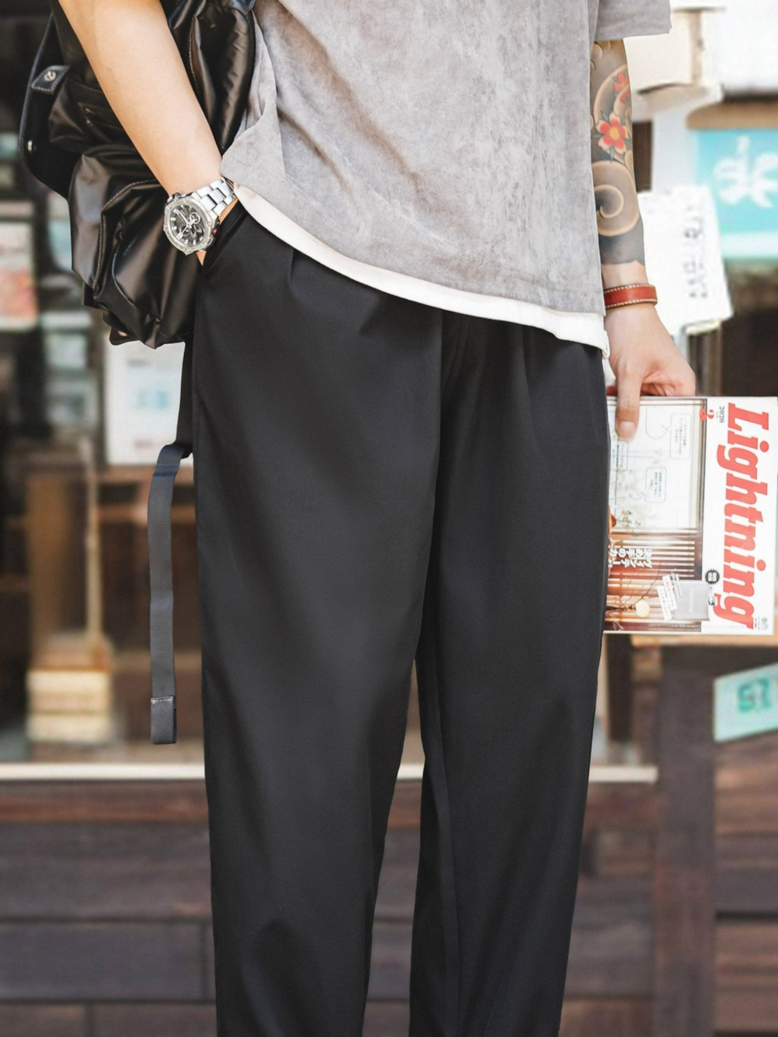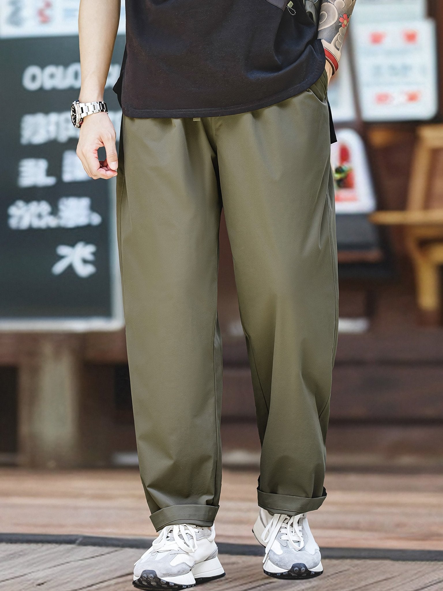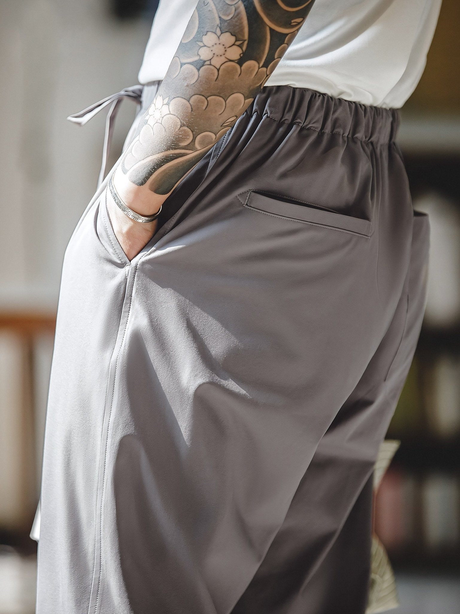パンツの裾は自然に垂れ下がり、脚のラインを整え、自然で快適なシルエットを演出します。立体的なカッティングにより、快適な着用感とスタイリッシュな印象があり、ゆったりとしたストレートなシルエットです。